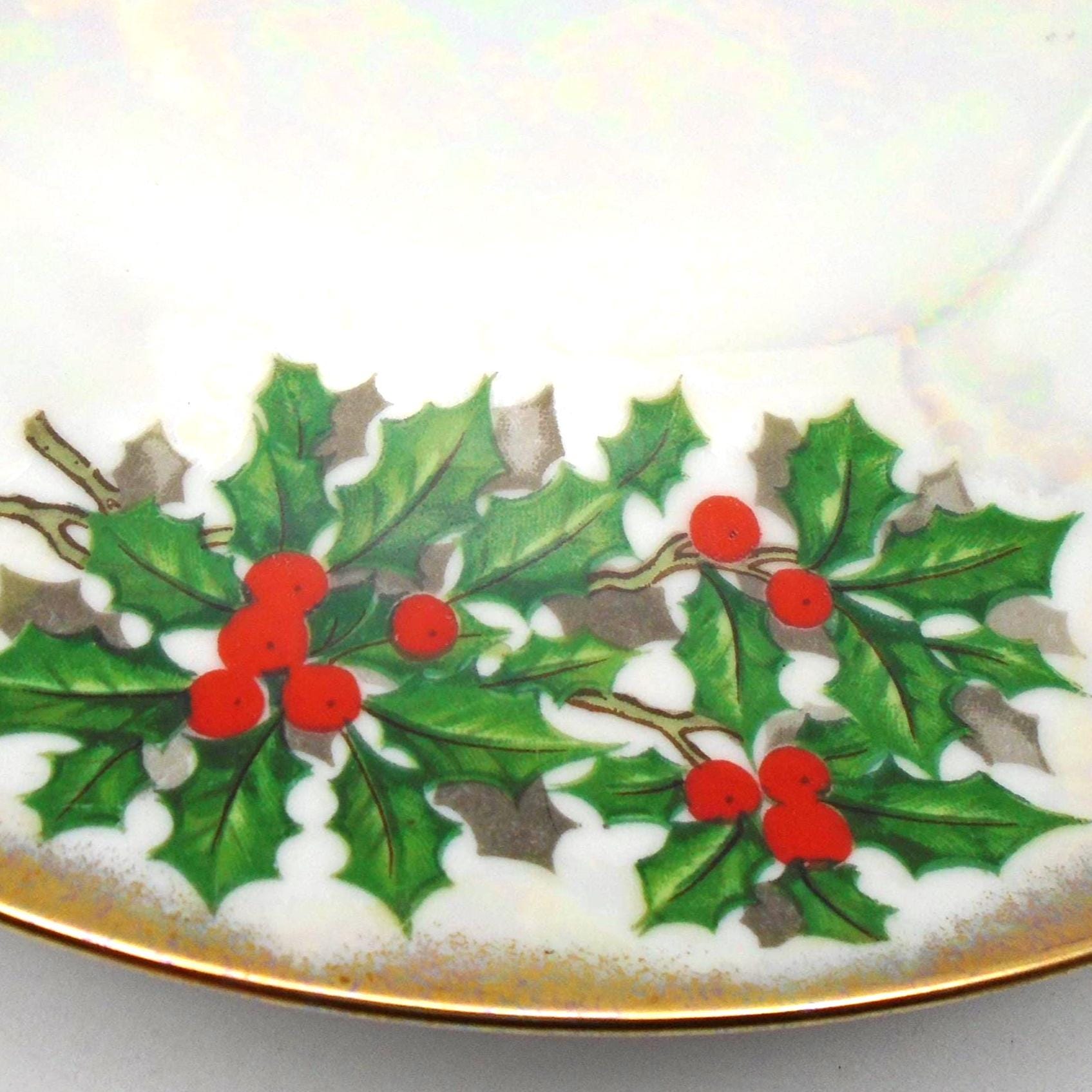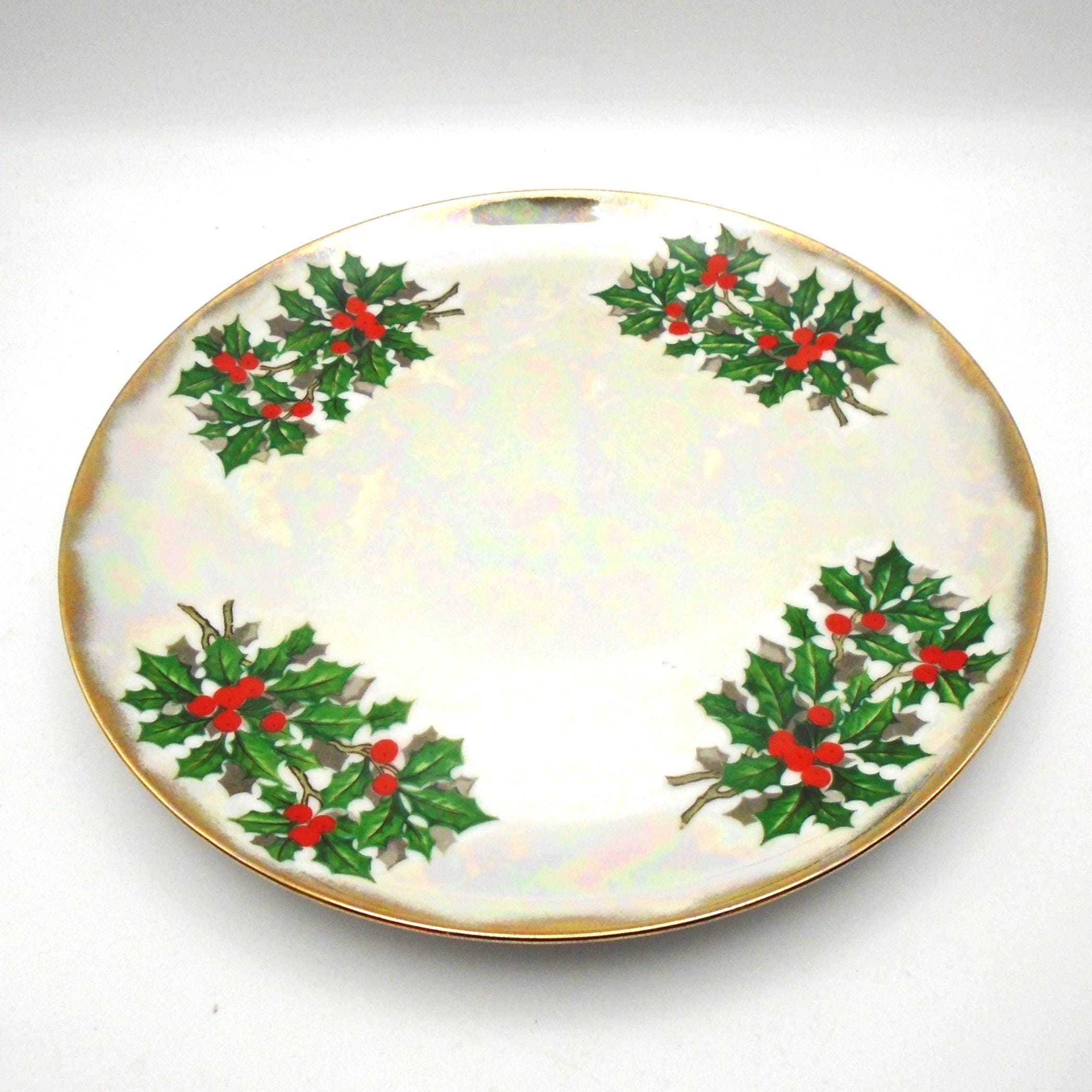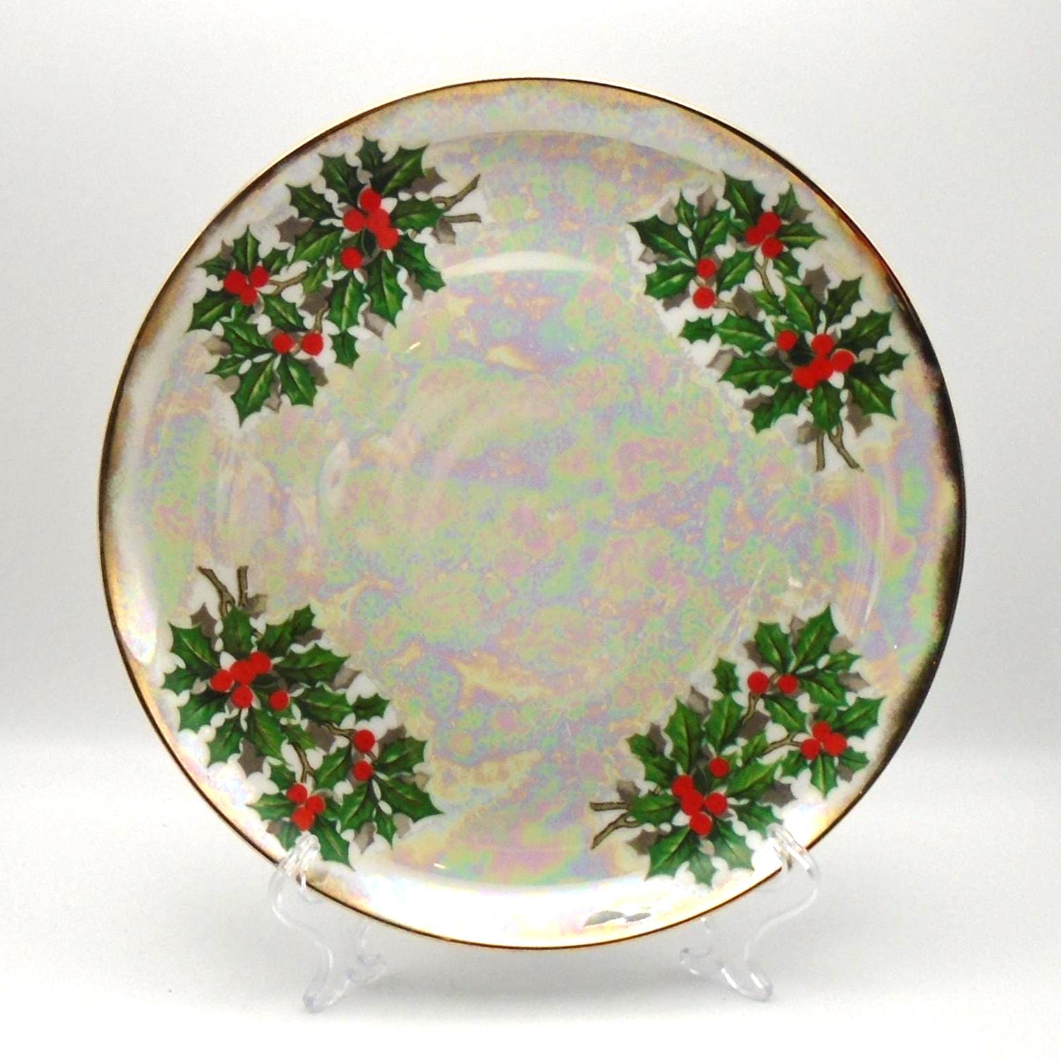 Vintage Ucagco Japan, Christmas Holly Berry Lusterware 10-1/4" Plate with Gold Trim, Circa 1940's-1950's -- simply beautiful. It features a distinctive iridescent or "lusterware" finish with a gold-gilt trim and a festive design of holly and red berries. This plate was made in Japan, and distributed by the United China and Glass Company (UCAGCO).