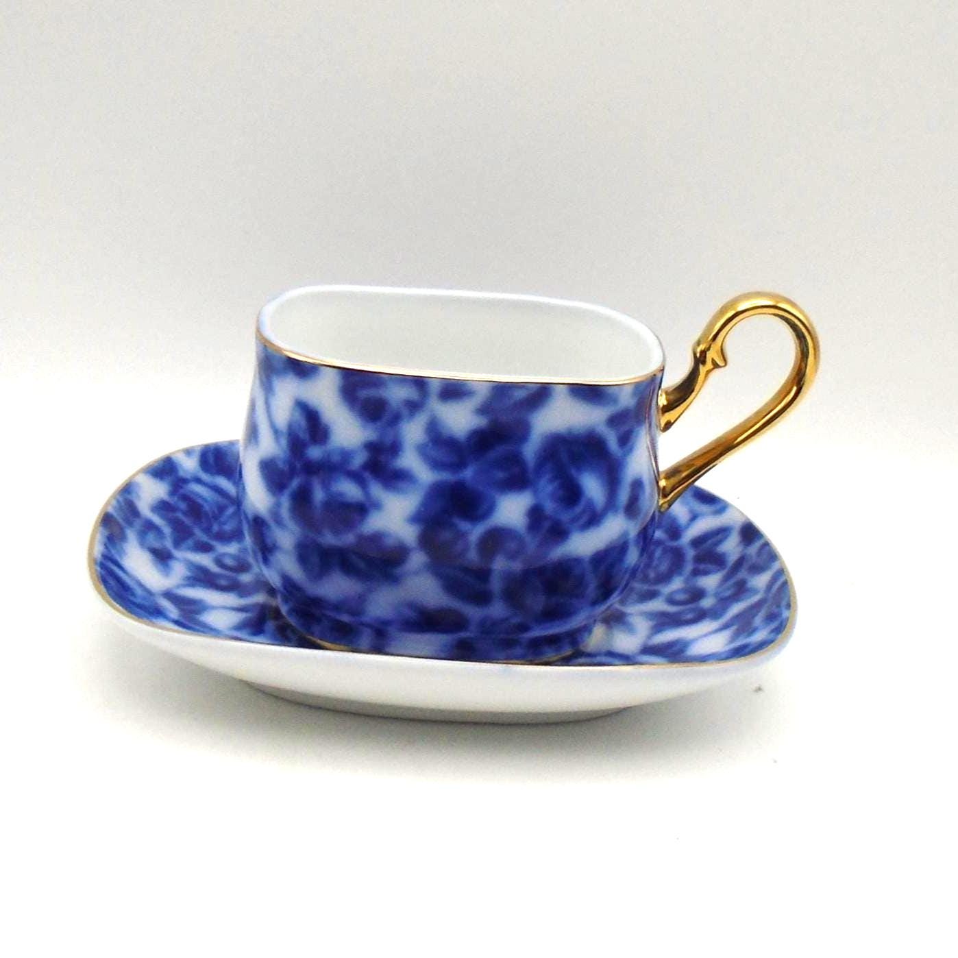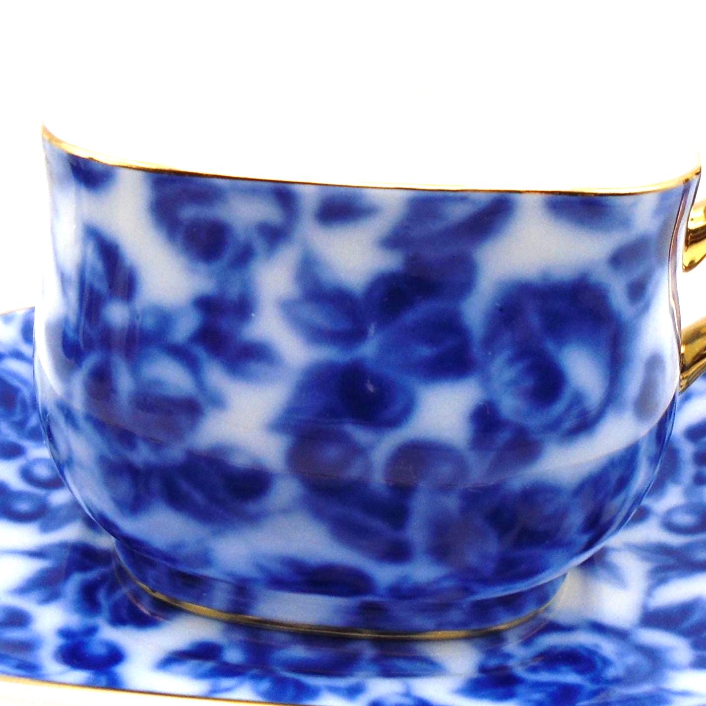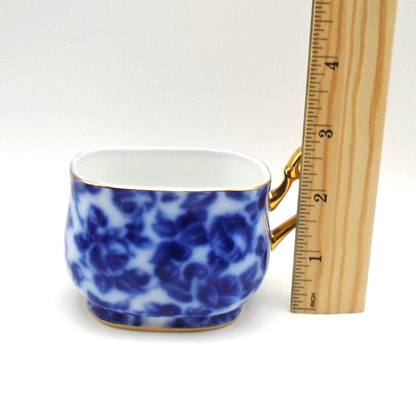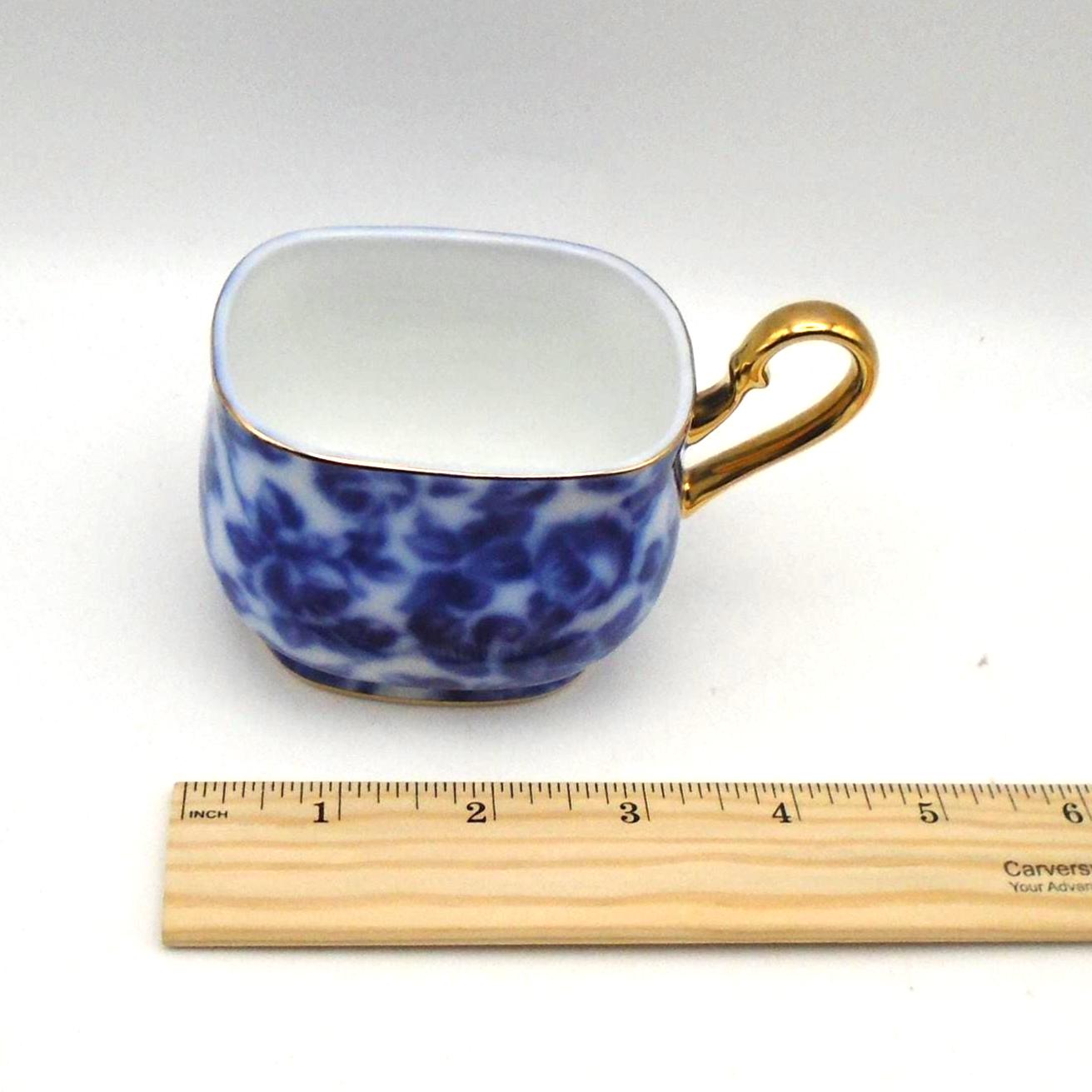 This vintage Royal Danube Calico Flow Blue cup and saucer is absolutely beautiful. This cup and saucer measures approximately Cup - 2-1/4" x 3"x 2-3/8" H, Saucer - 4-1/4" x 5-1/2 W. This gorgeous set is in excellent condition, with no chips, cracks, crazing, repairs, or stains. (it appears to have never been used) It is pattern # 1886 -- which is known for its delicate cobalt blue rose pattern on white porcelain with gold trim and handle. Circa 1970's, this set features a unique rectangular oval shape -- which is both delicate and elegant.