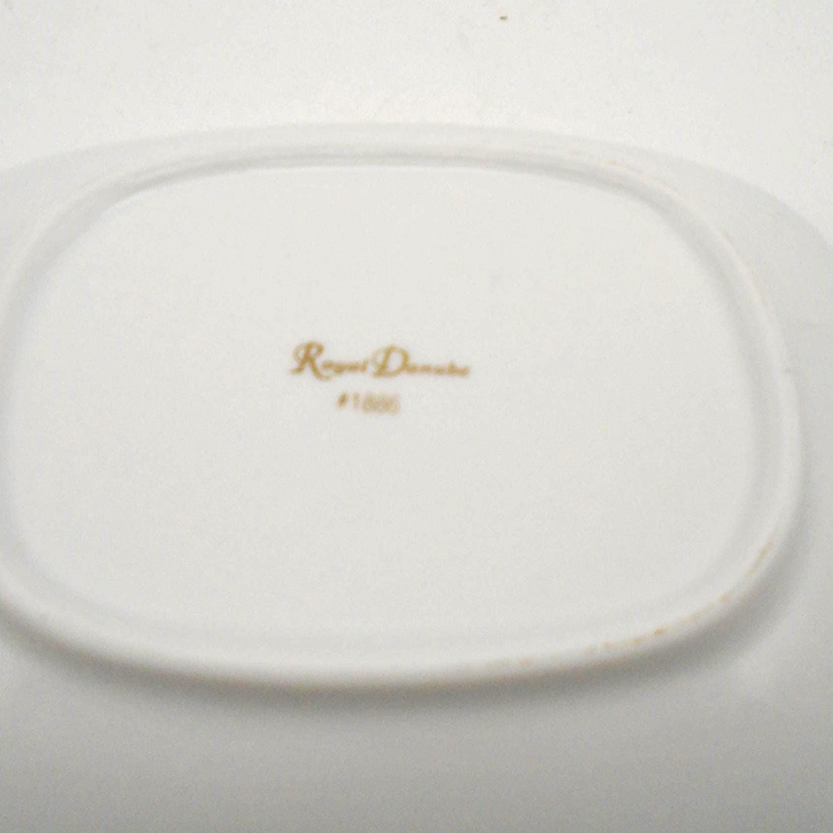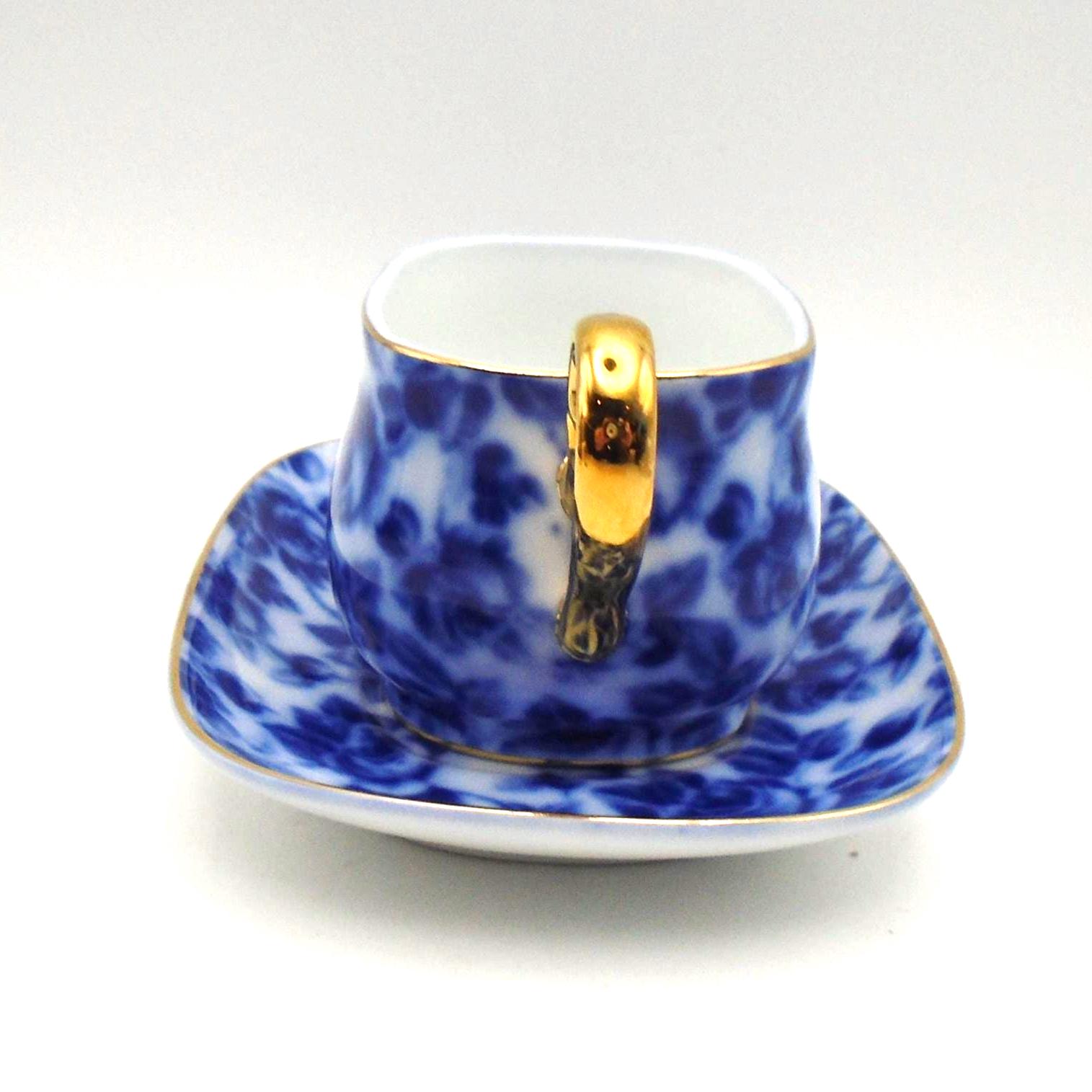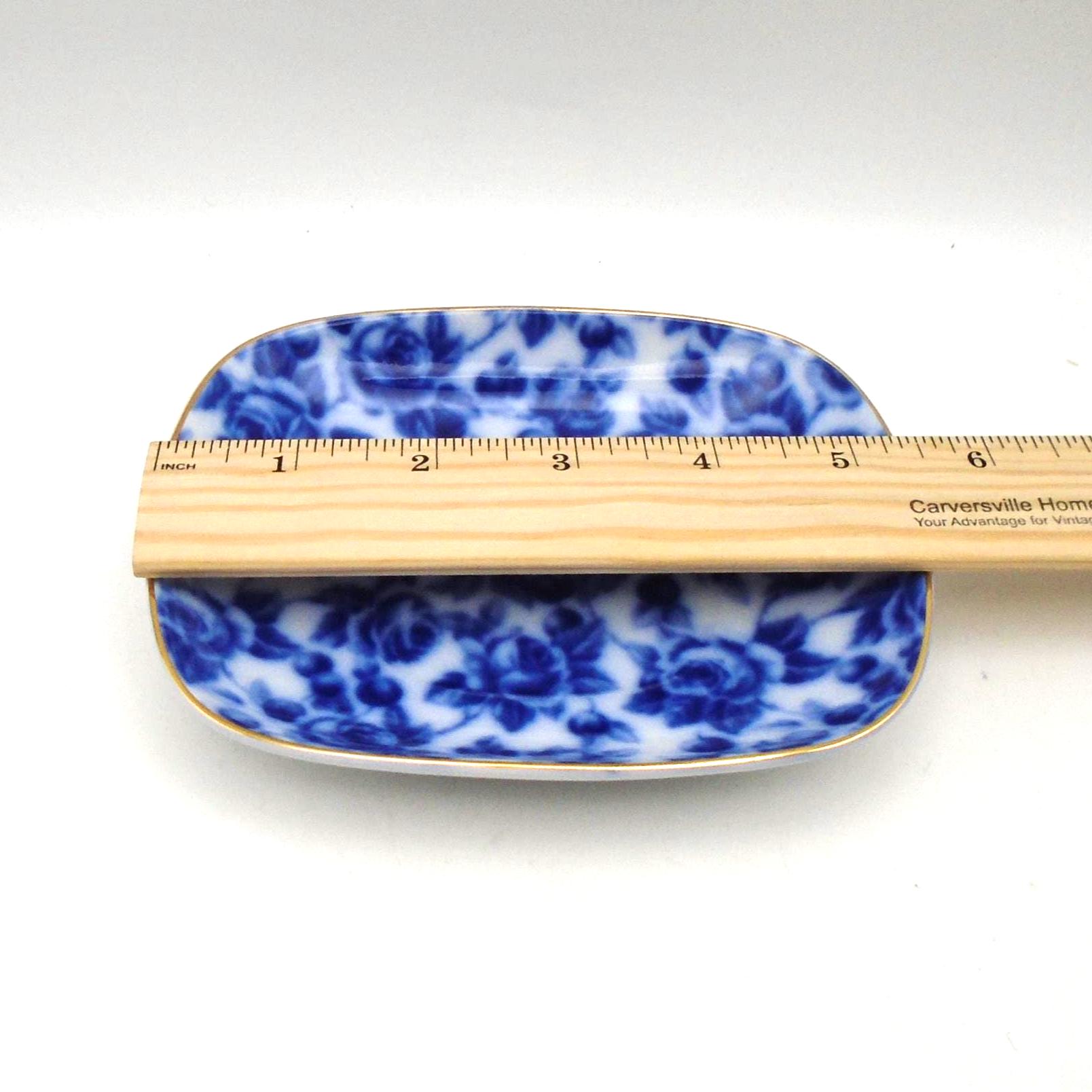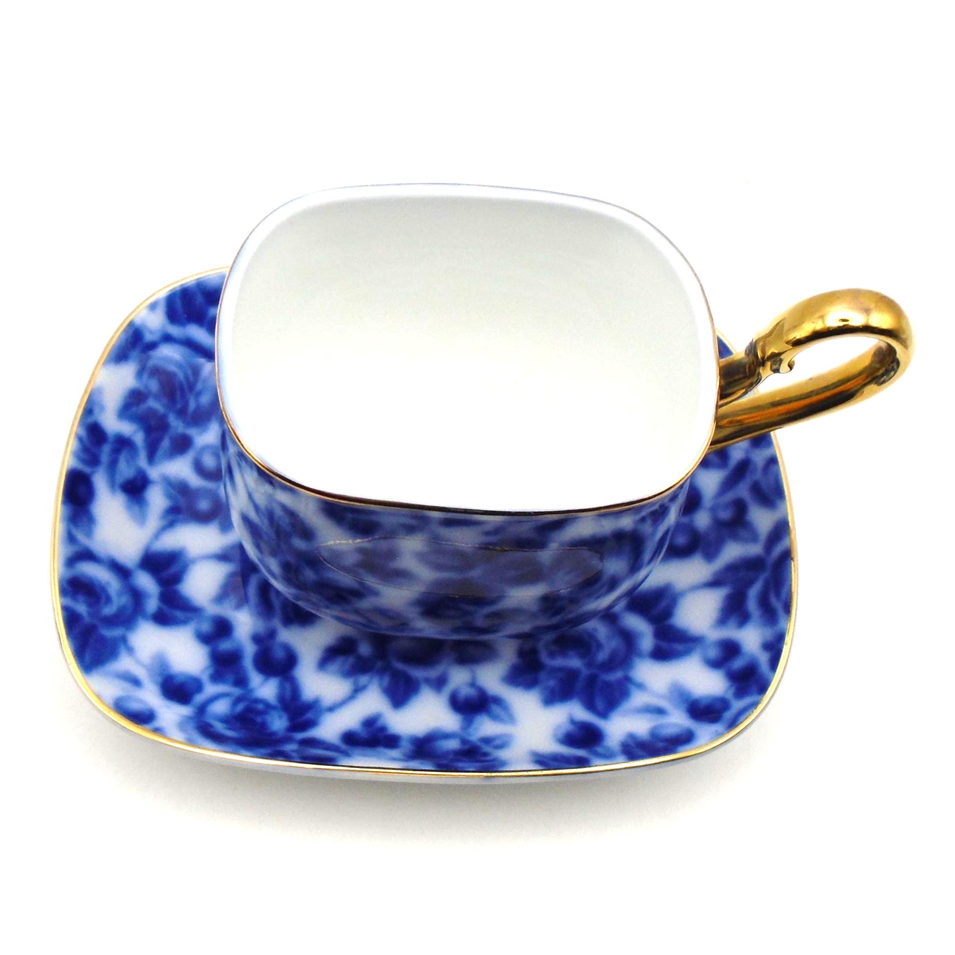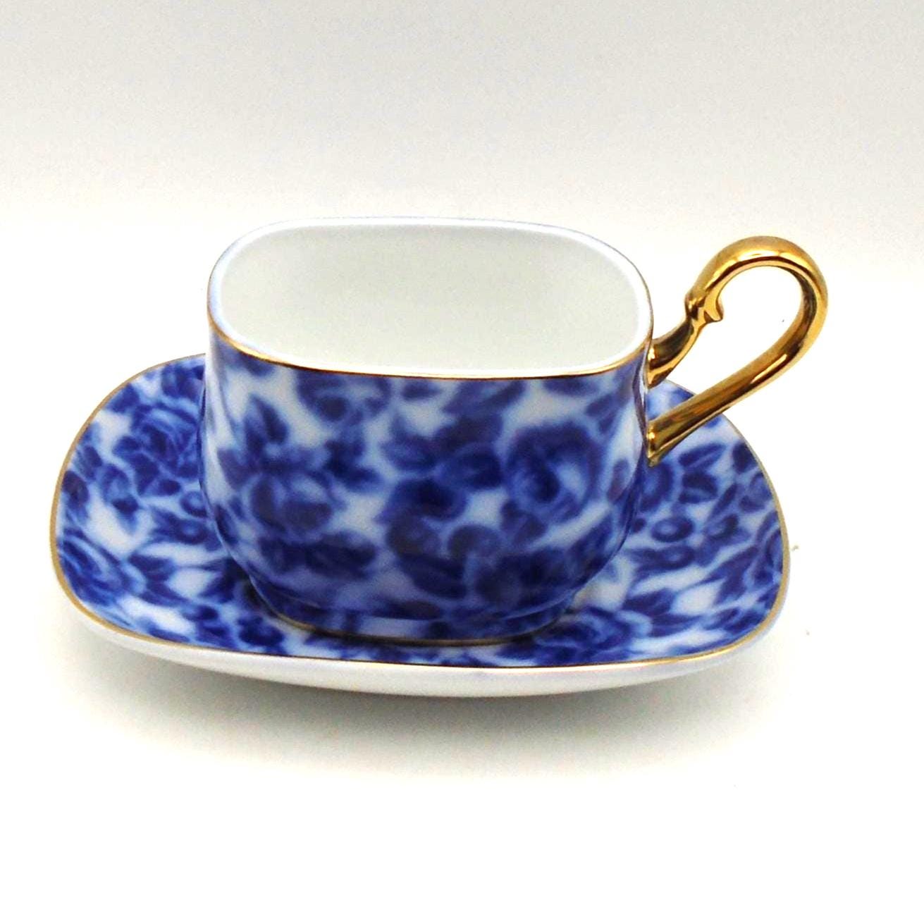 This vintage Royal Danube Calico Flow Blue cup and saucer is absolutely beautiful. This cup and saucer measures approximately Cup - 2-1/4" x 3"x 2-3/8" H, Saucer - 4-1/4" x 5-1/2 W. This gorgeous set is in excellent condition, with no chips, cracks, crazing, repairs, or stains. (it appears to have never been used) It is pattern # 1886 -- which is known for its delicate cobalt blue rose pattern on white porcelain with gold trim and handle. Circa 1970's, this set features a unique rectangular oval shape -- which is both delicate and elegant.