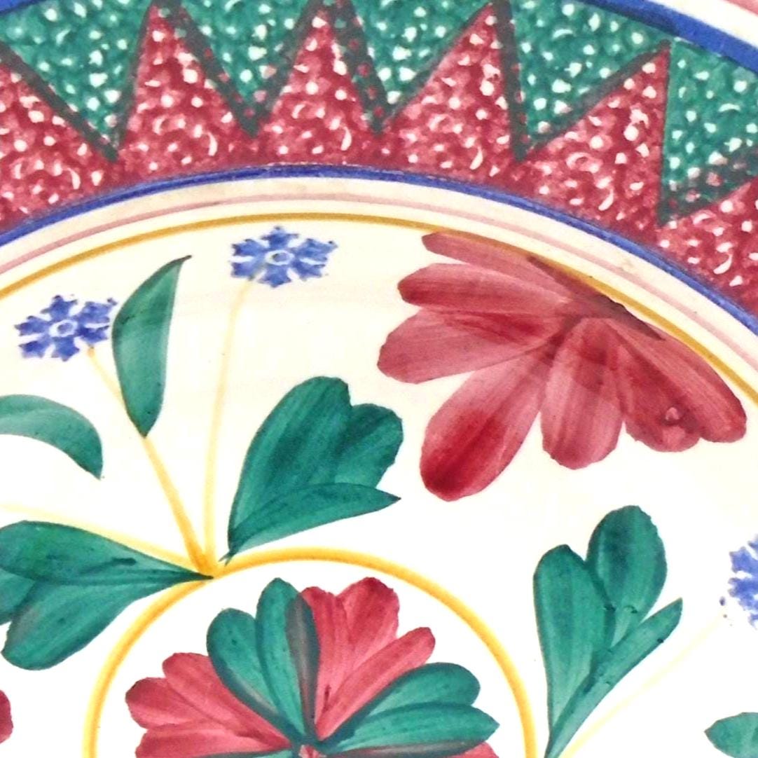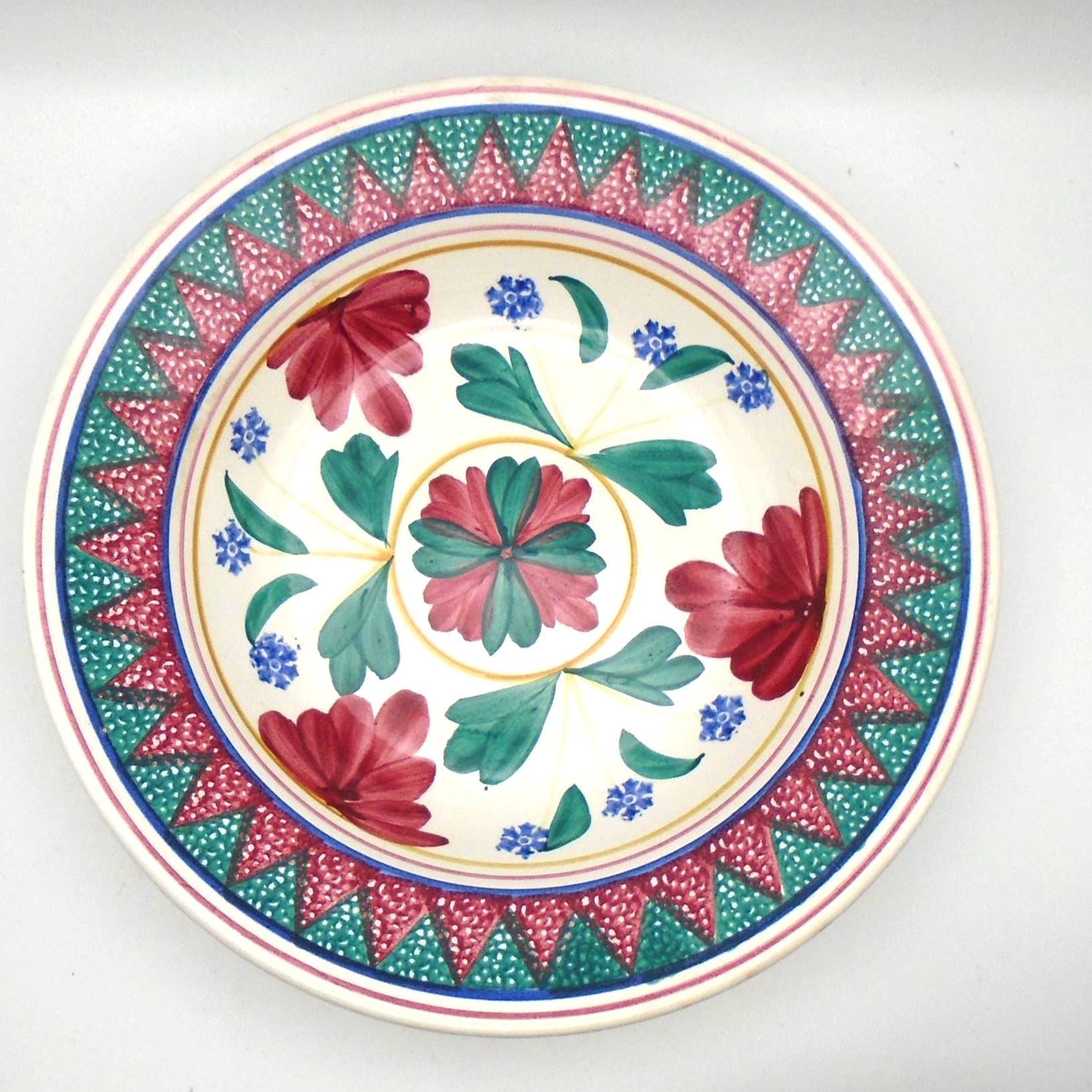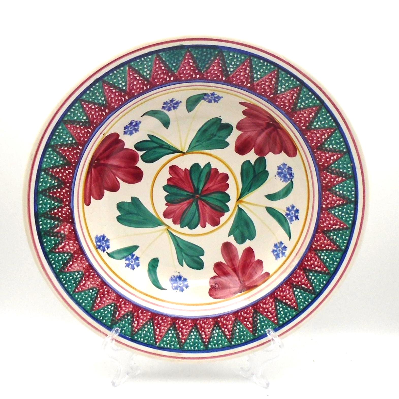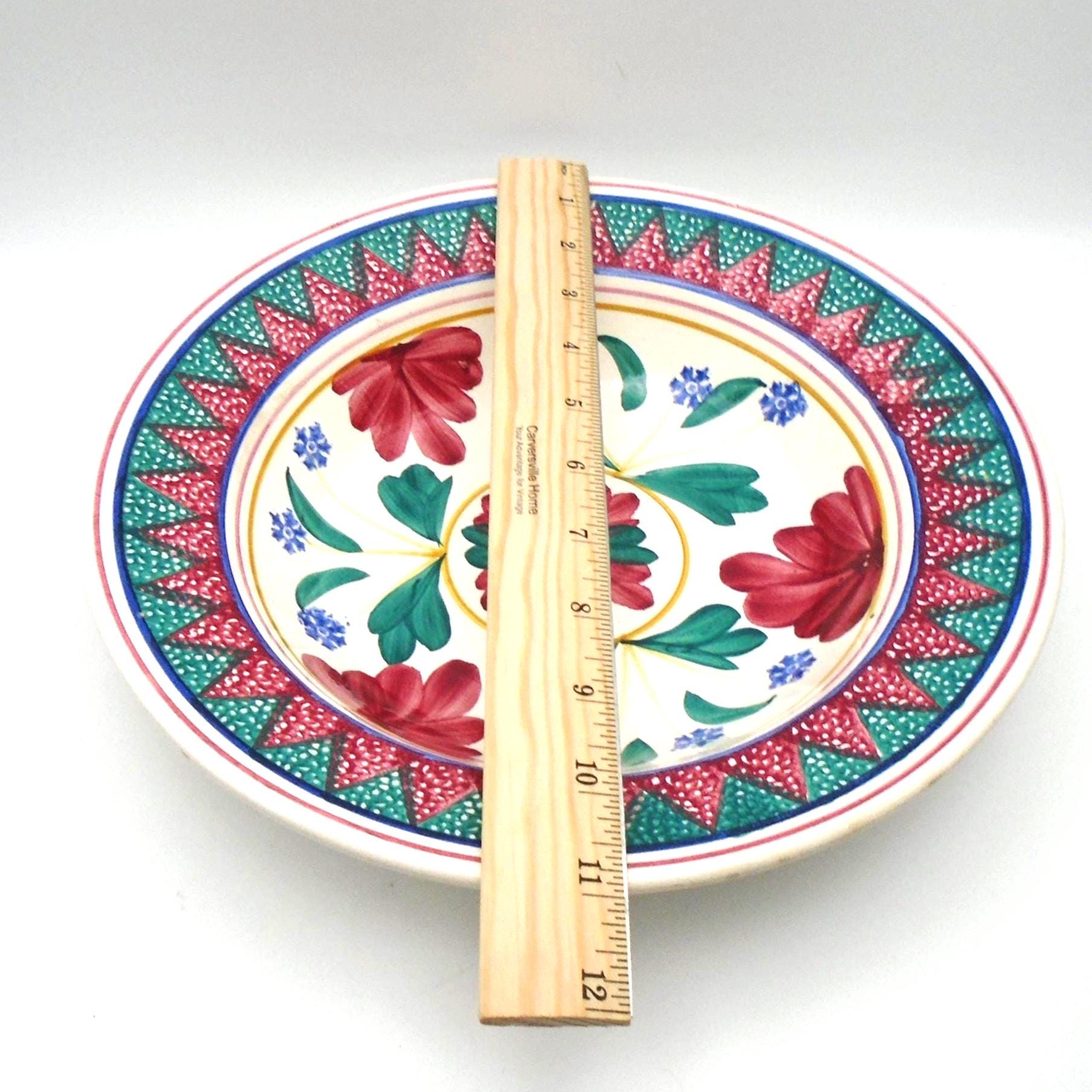 Vintage large stick spatter spongeware serving bowl by Nimy of Belgium. Measuring approximately 2-1/8" H x 10-7/8” in Diameter, this colorful bowl is awesome. It features hand-painted flowers and foliage, with a red and green stick spatter triangular pattern around the rim. Artisans created the red and green triangle decoration around the edge of the plate with a cut sponge attached to the end of a stick. To decorate the center of the plate, the artist would have hand-painted the floral design with a paint brush, free style. The colors are vibrant and fabulous!