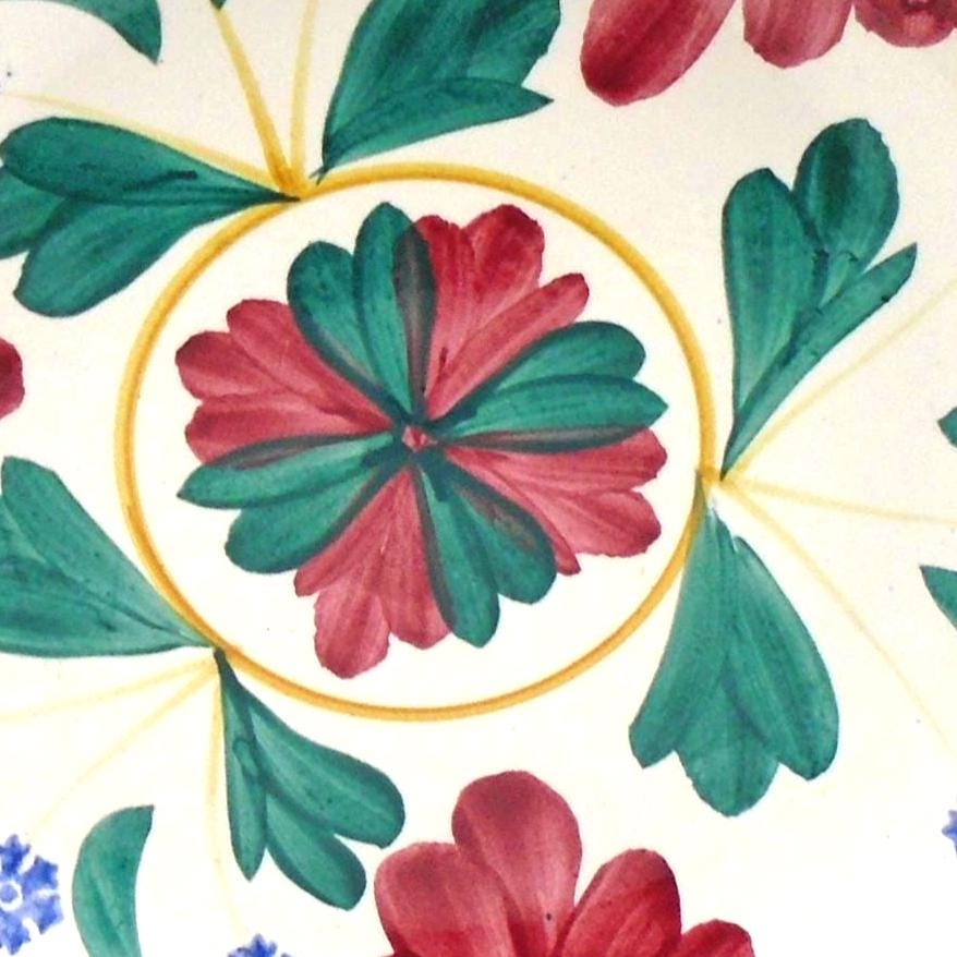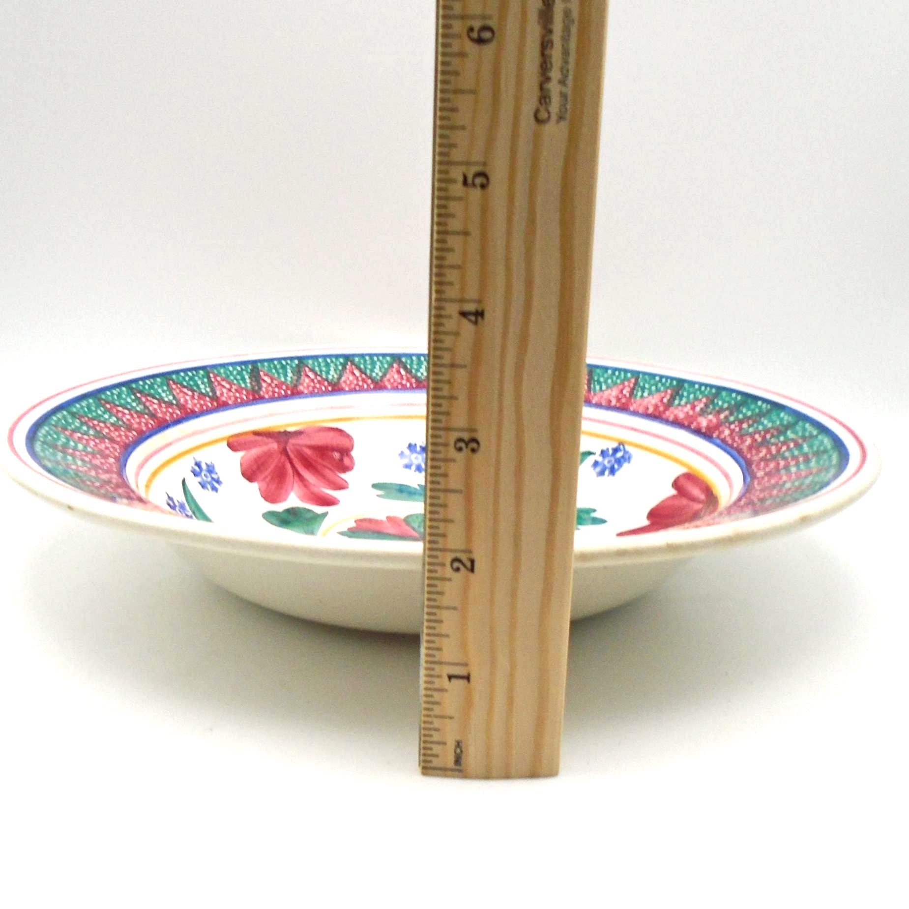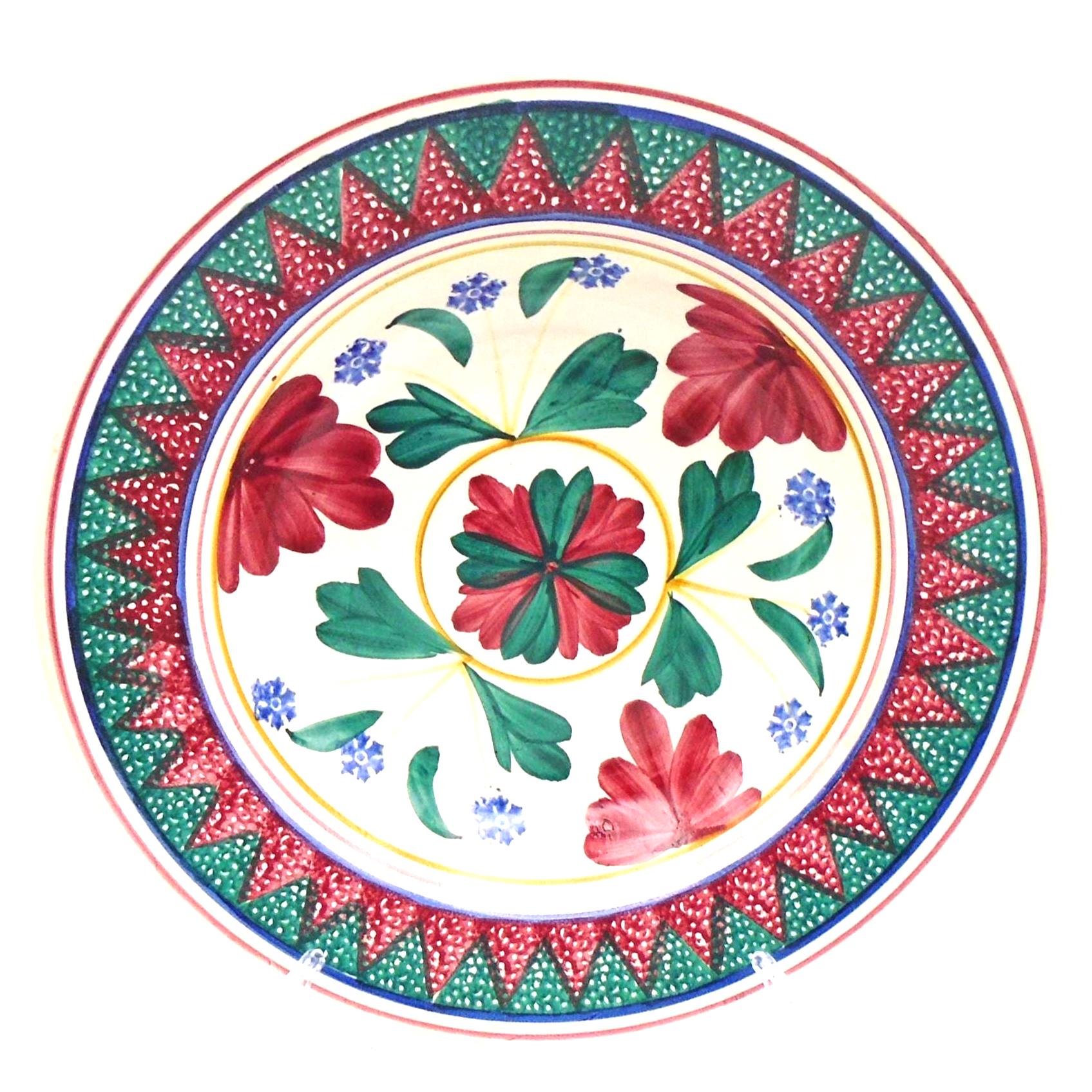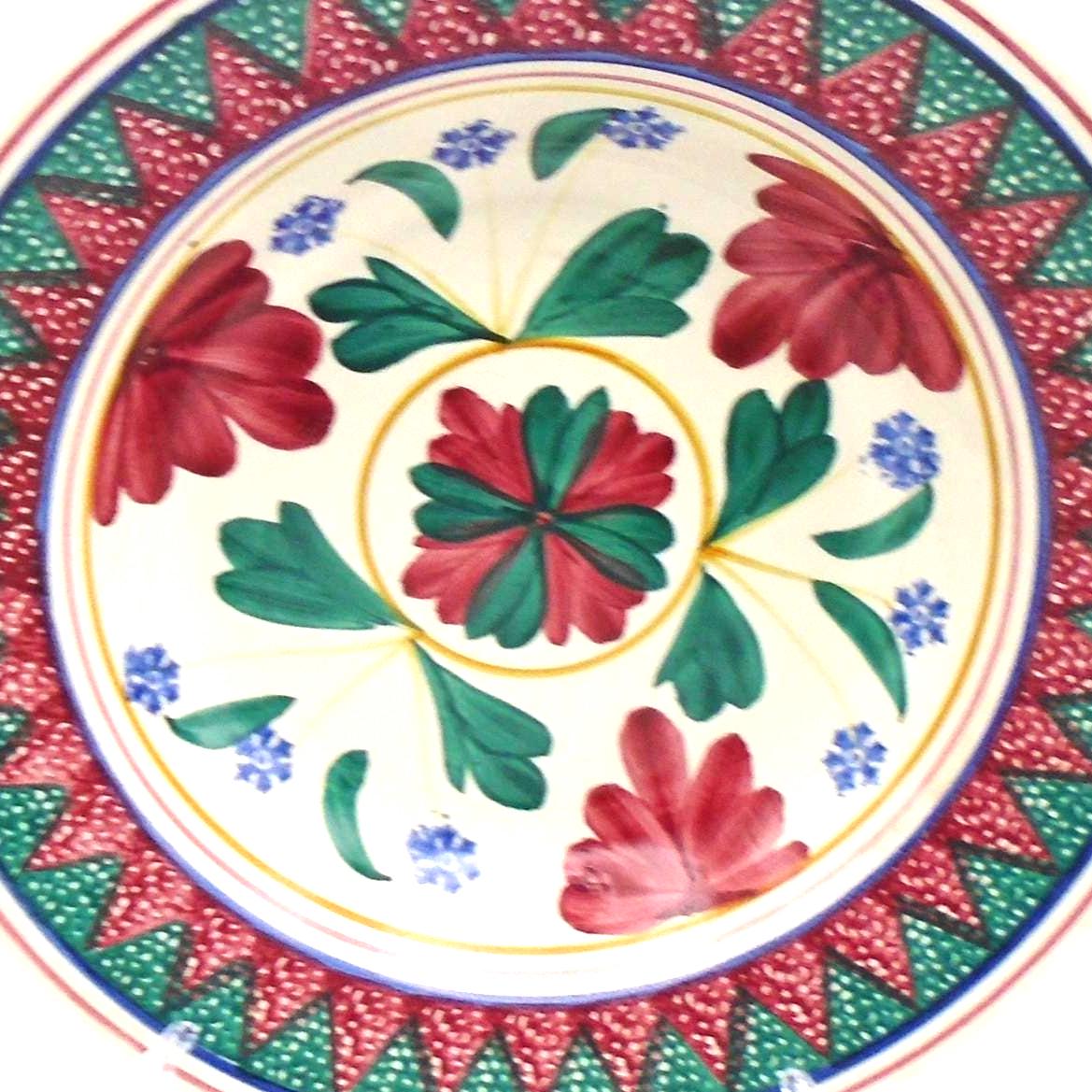 Vintage large stick spatter spongeware serving bowl by Nimy of Belgium. Measuring approximately 2-1/8" H x 10-7/8” in Diameter, this colorful bowl is awesome. It features hand-painted flowers and foliage, with a red and green stick spatter triangular pattern around the rim. Artisans created the red and green triangle decoration around the edge of the plate with a cut sponge attached to the end of a stick. To decorate the center of the plate, the artist would have hand-painted the floral design with a paint brush, free style. The colors are vibrant and fabulous!