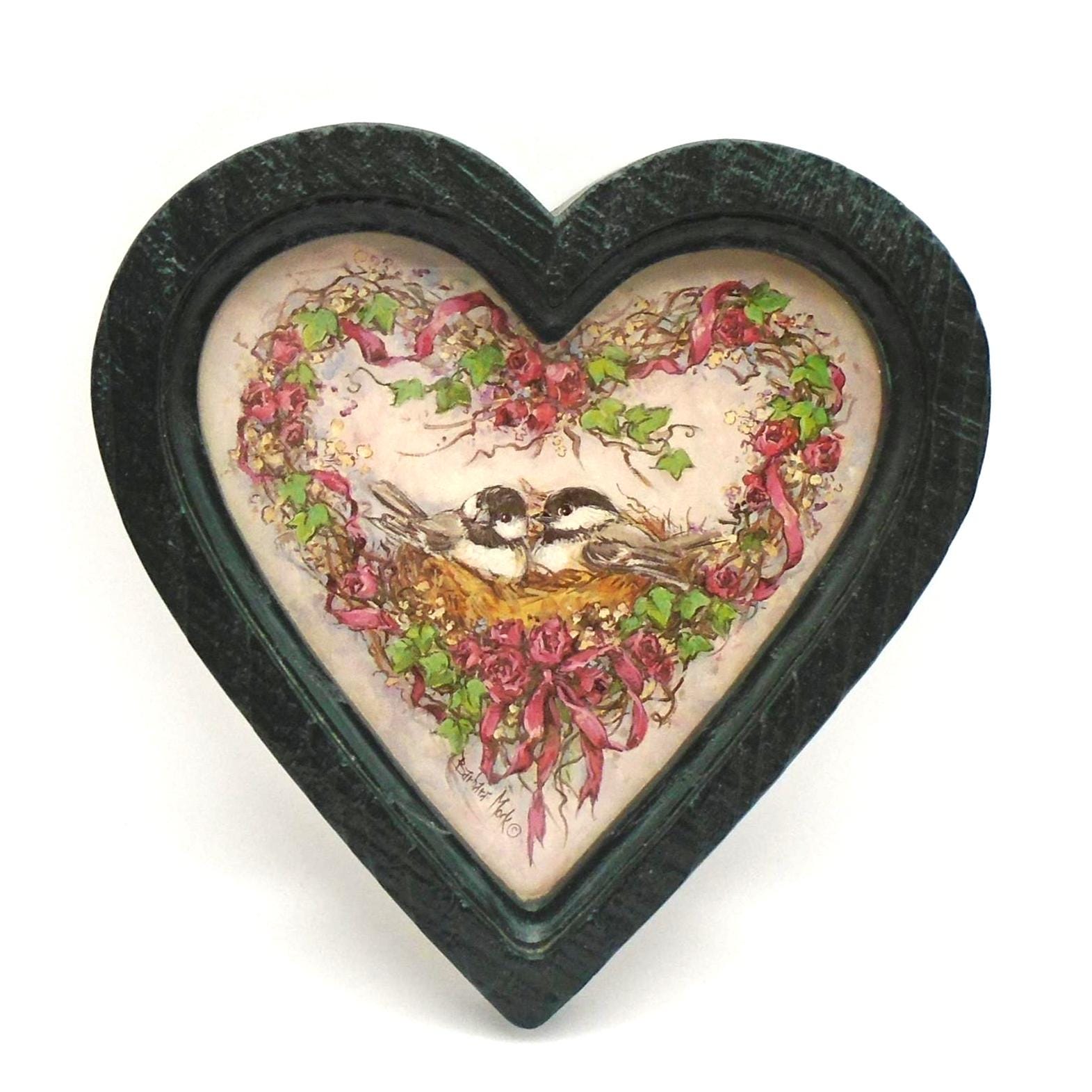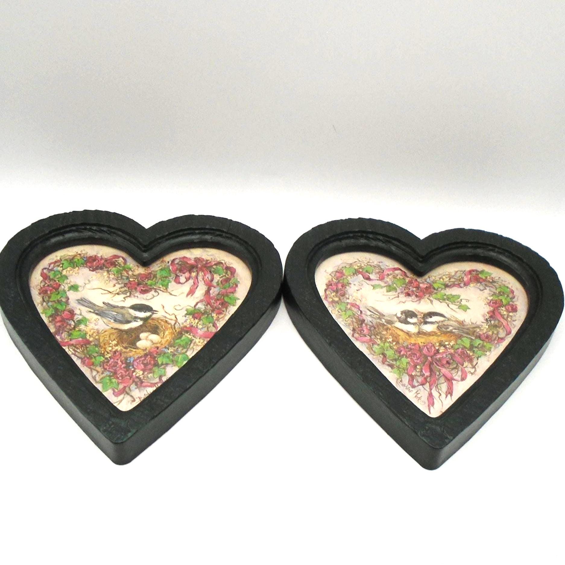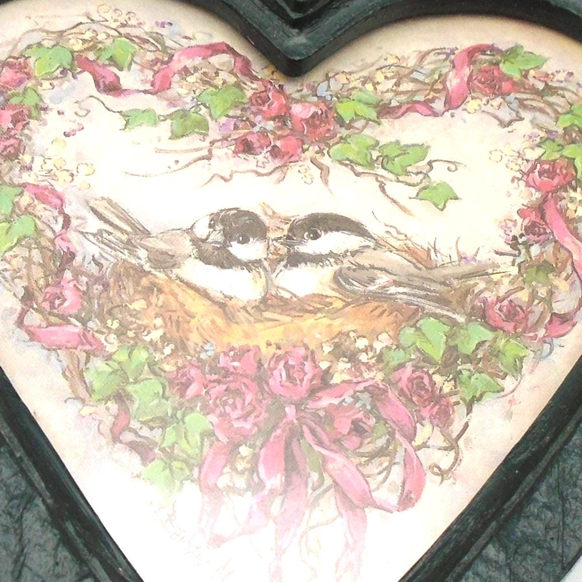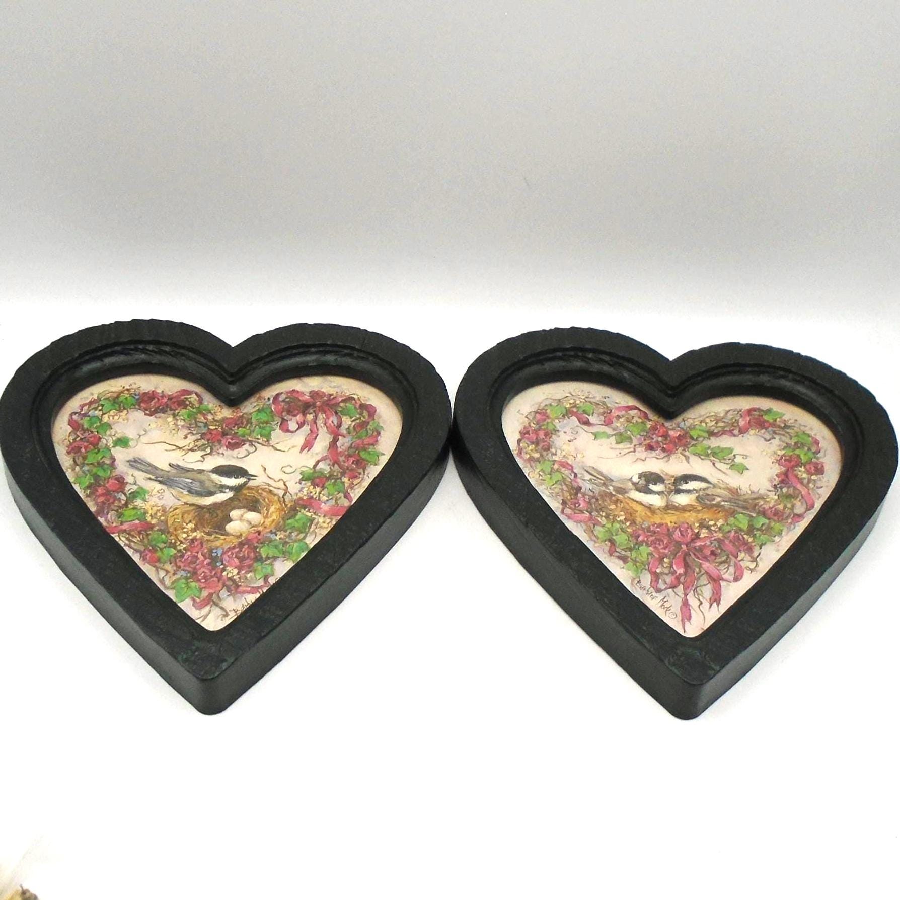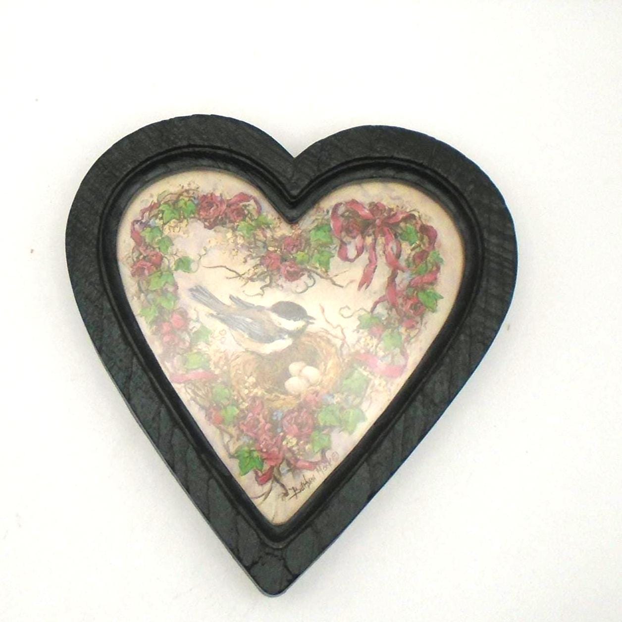 Simply adorable. These 2 vintage heart shaped frames with "Nesting Chickadees" prints by Artist Barbara Mock, were sold by Homco/Home Interiors in 1985-1987. The frames are made of green plastic with a wood-grain texture and feature prints of chickadee birds with floral wreaths behind heart shaped glass.