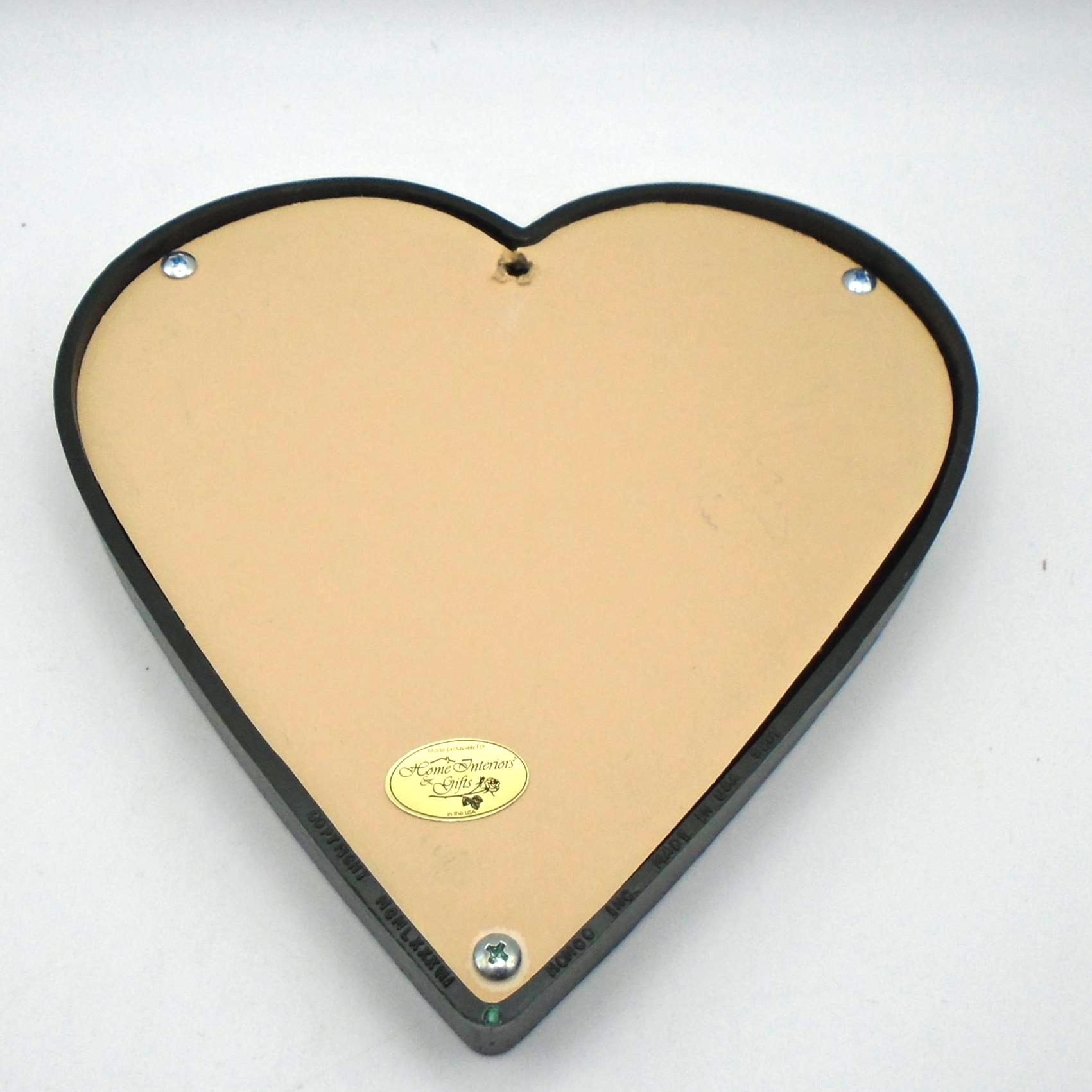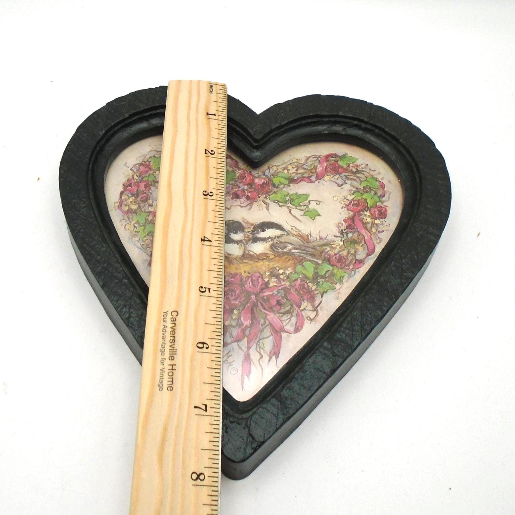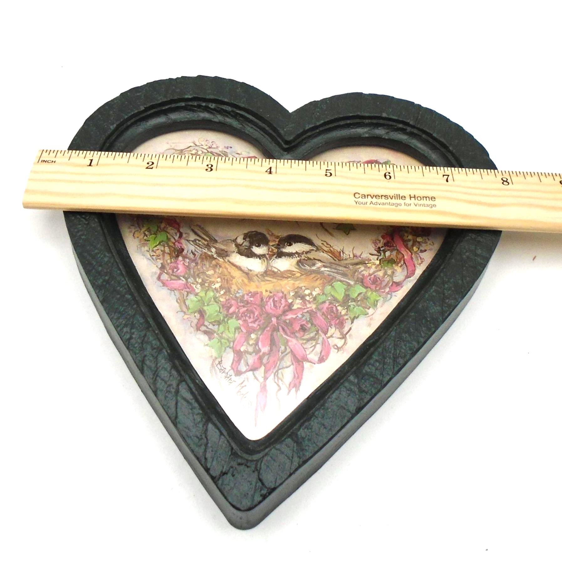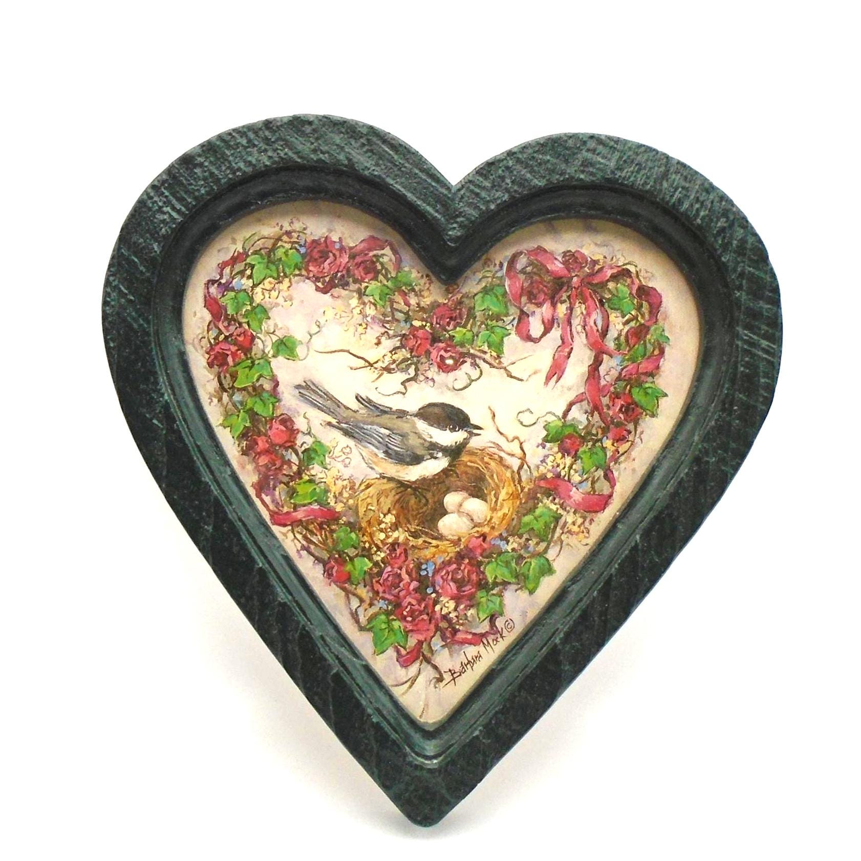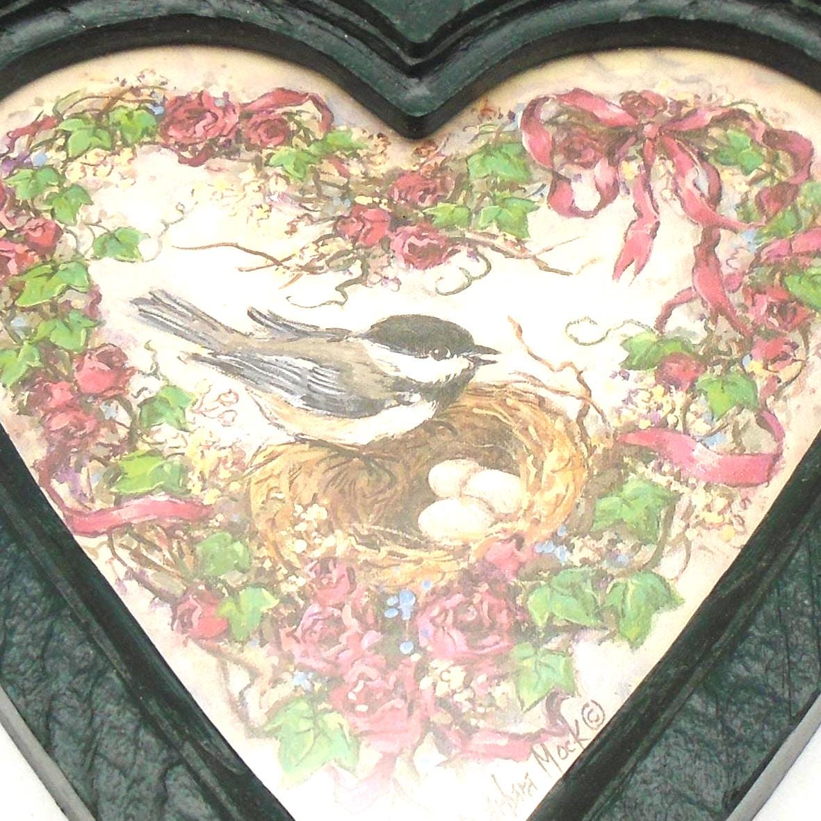 Simply adorable. These 2 vintage heart shaped frames with "Nesting Chickadees" prints by Artist Barbara Mock, were sold by Homco/Home Interiors in 1985-1987. The frames are made of green plastic with a wood-grain texture and feature prints of chickadee birds with floral wreaths behind heart shaped glass.