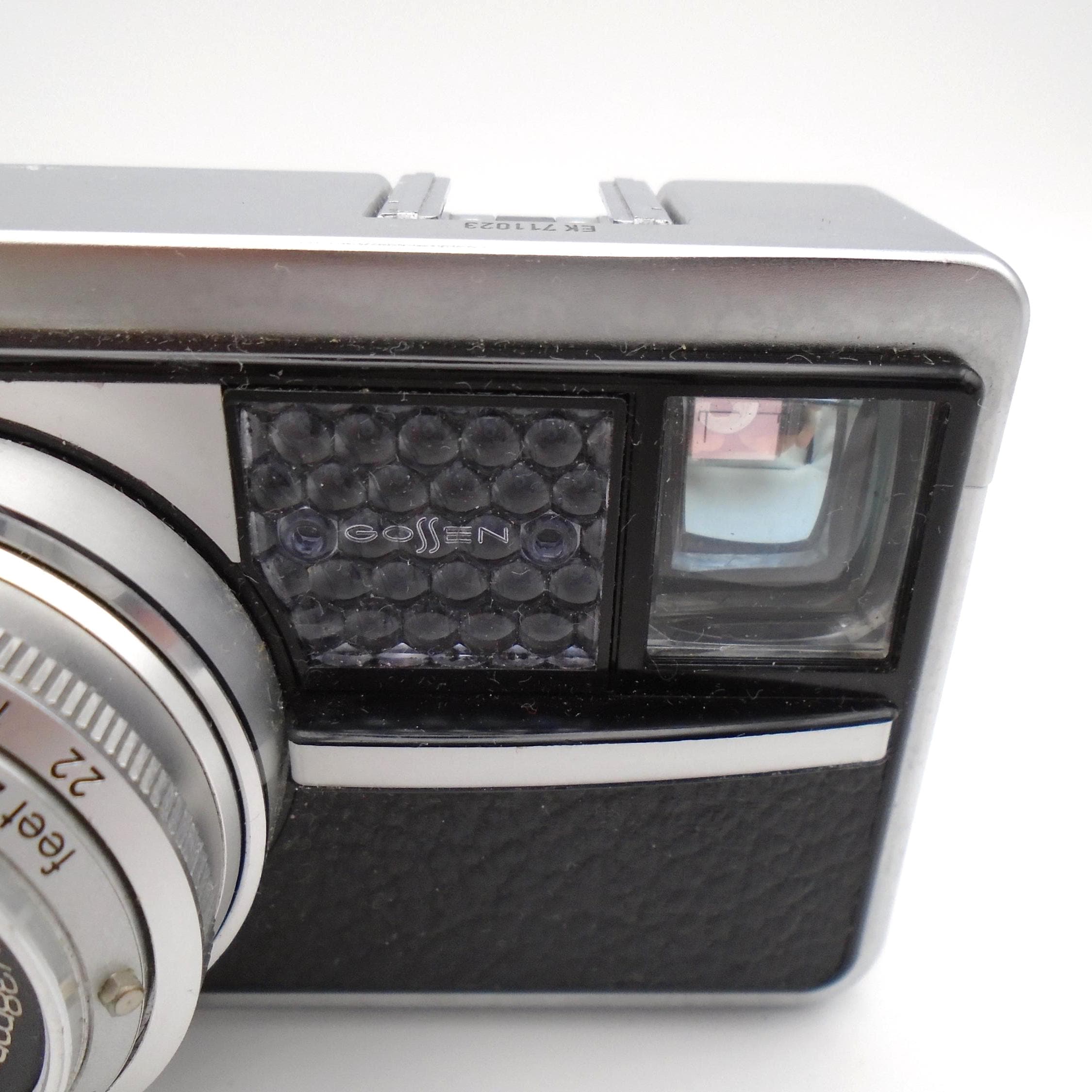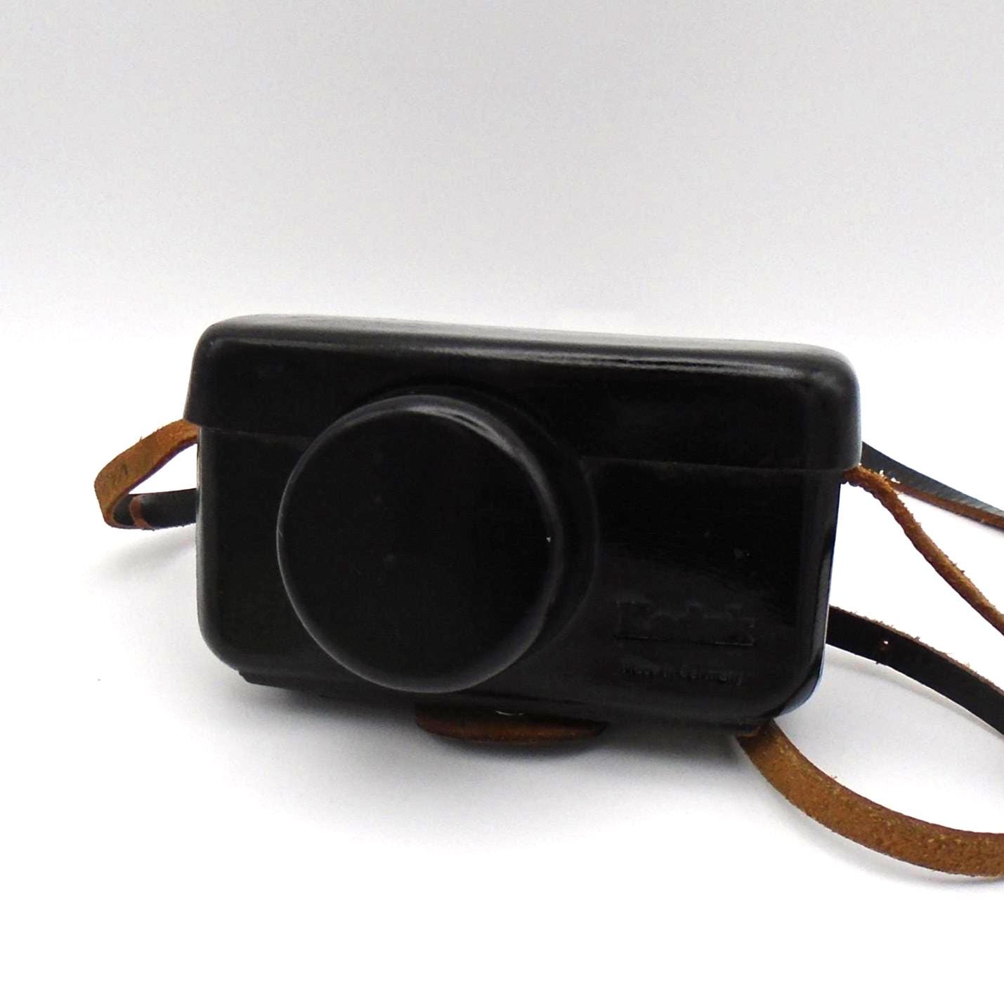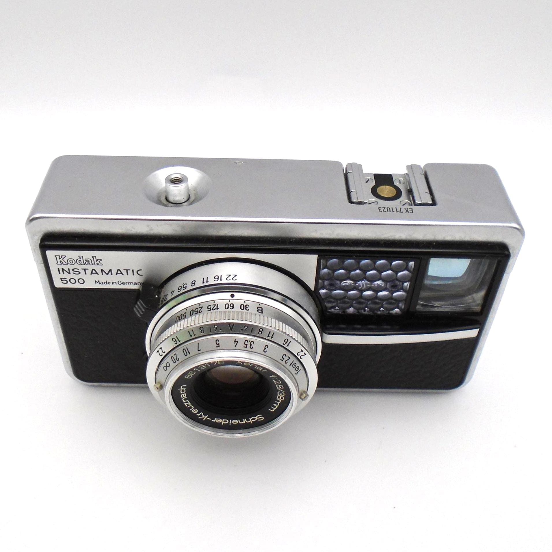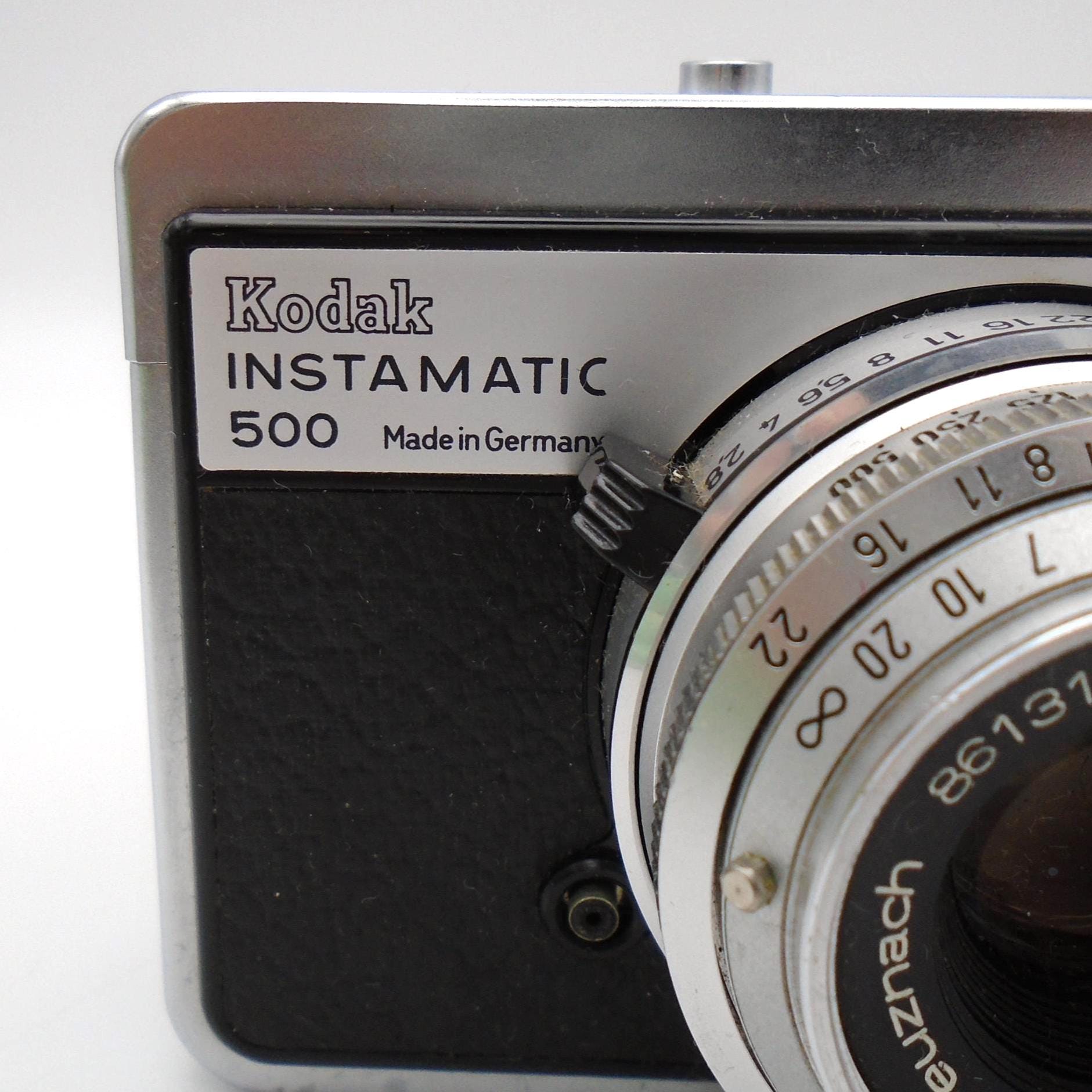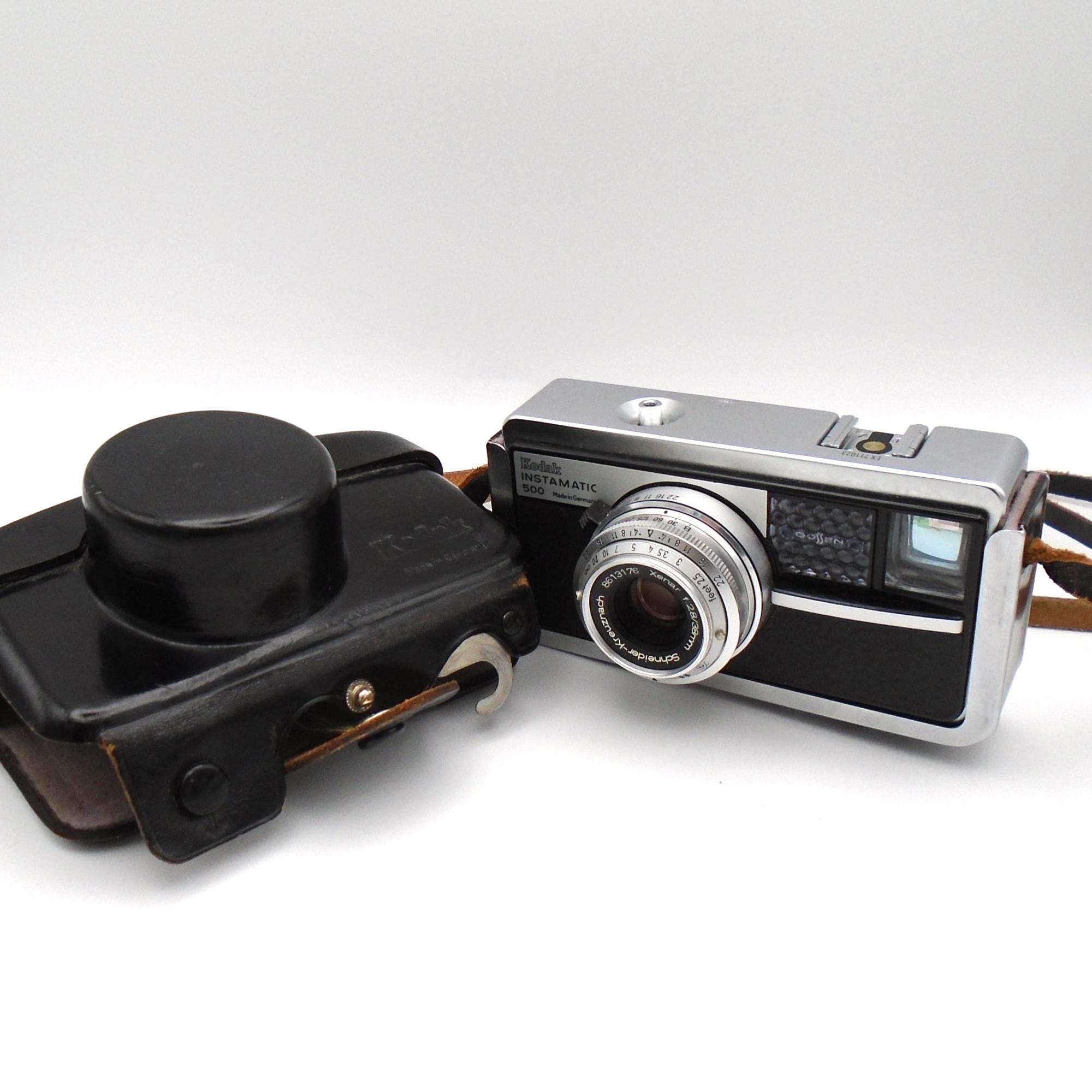 The Kodak Instamatic 500 camera was manufactured from 1963 to 1965 and uses 126 film cartridges. It features a 38mm f/2.8 Schneider Xenar lens and has a coupled Gossen selenium-cell light meter and a Compur leaf shutter with speeds from 1/30th to 1/500th of a second. This is a high-quality camera manufactured in Germany, with a brushed metal body and original black leather case with metal bracket.