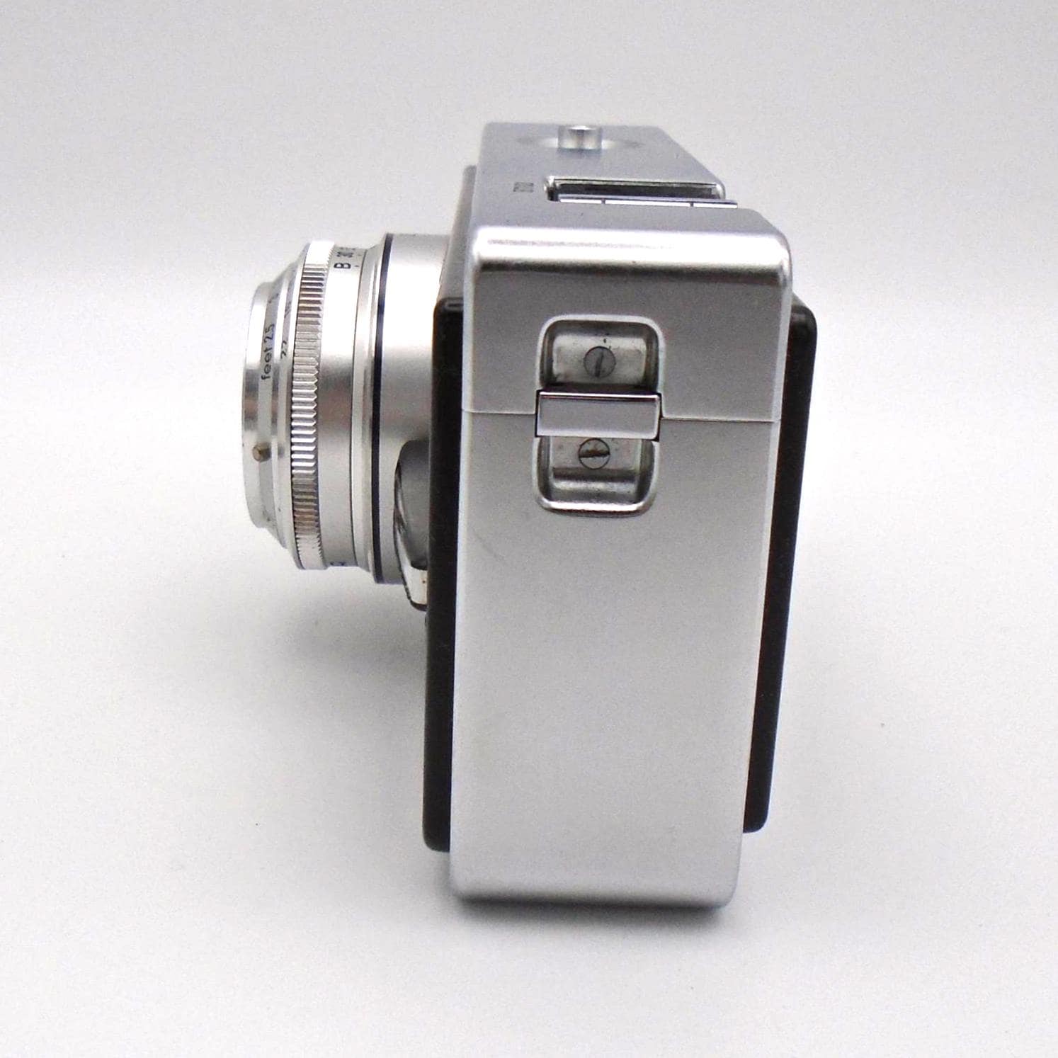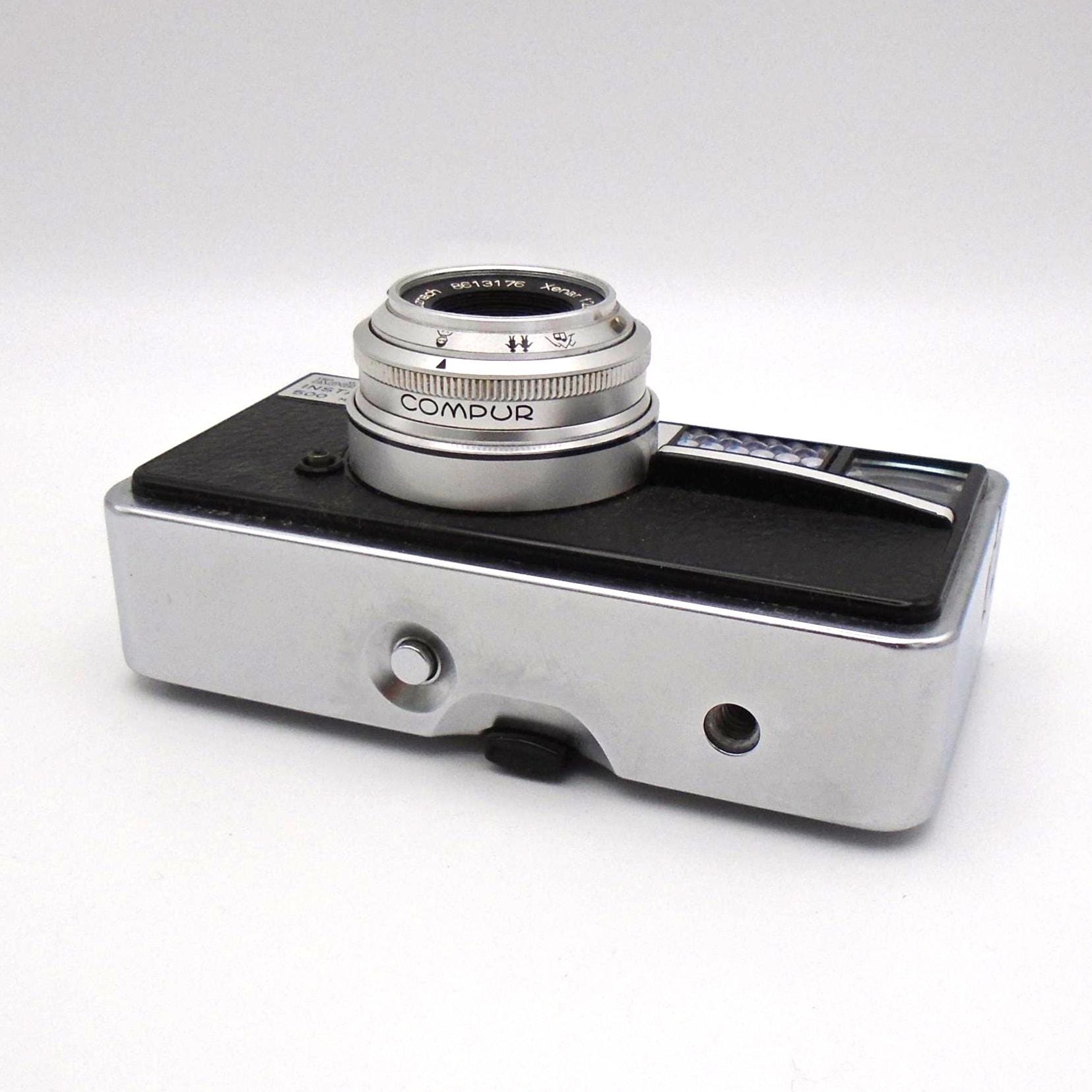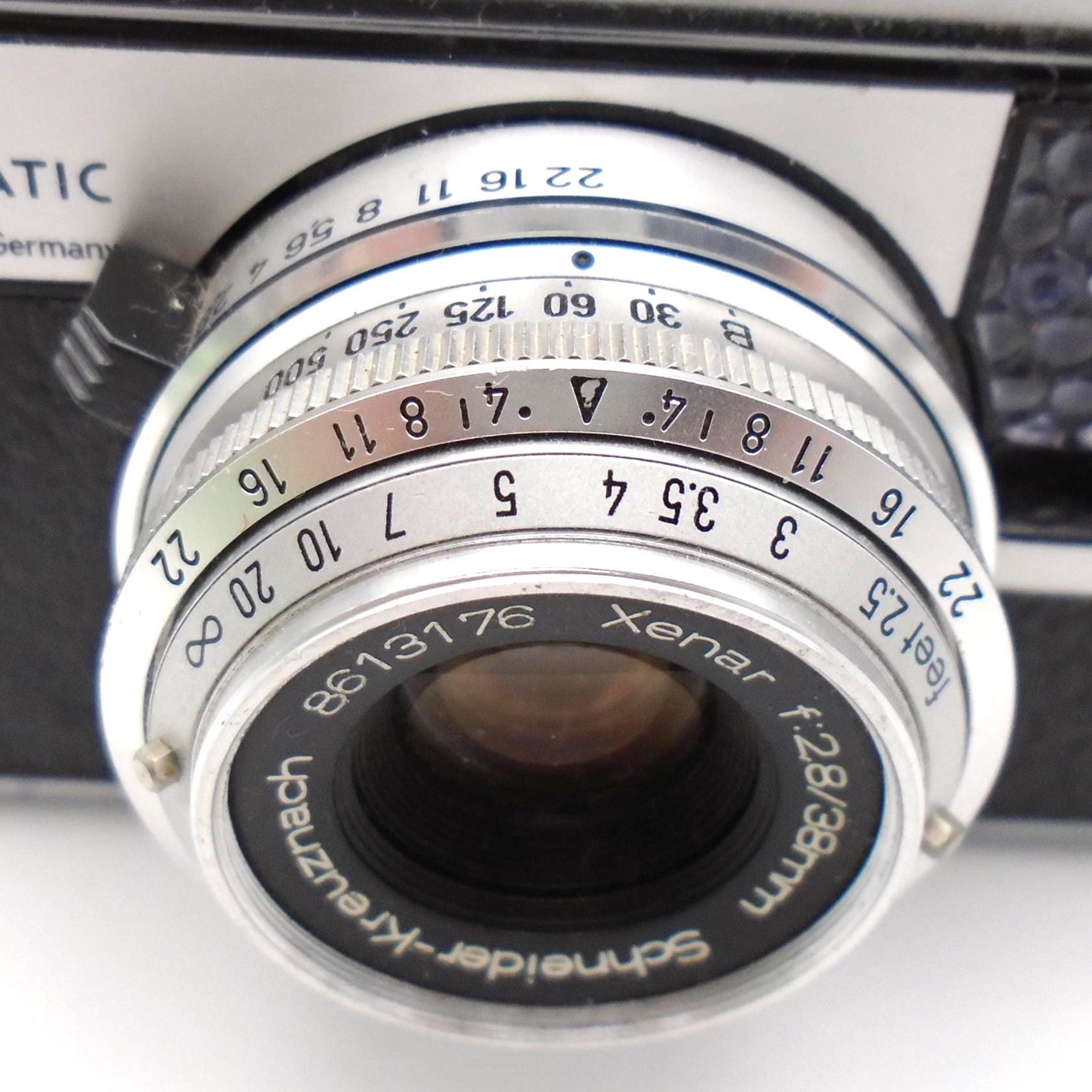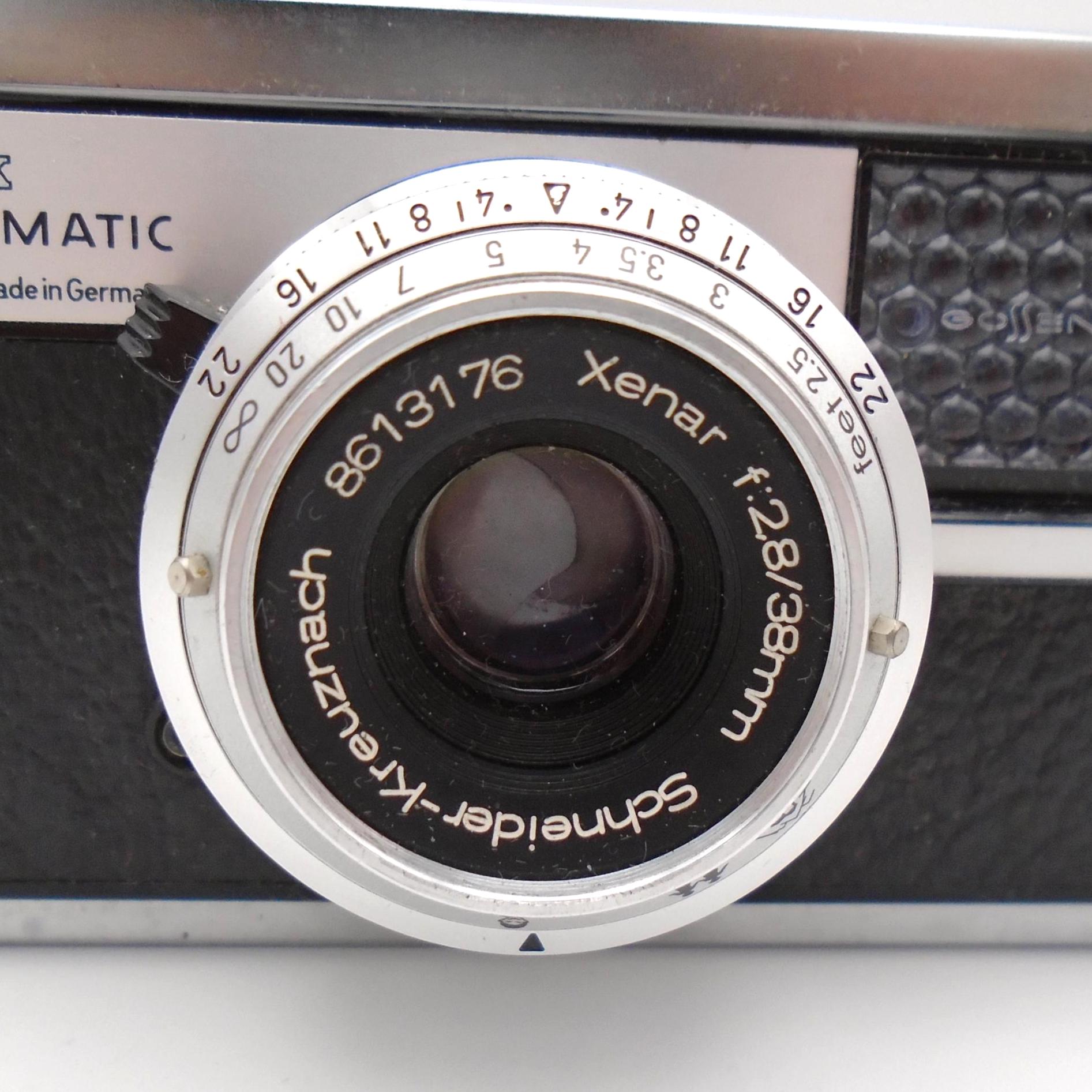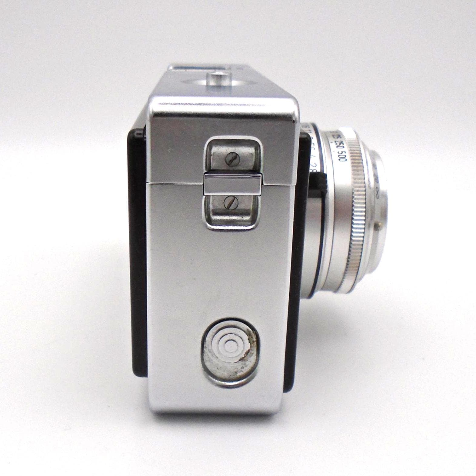The Kodak Instamatic 500 camera was manufactured from 1963 to 1965 and uses 126 film cartridges. It features a 38mm f/2.8 Schneider Xenar lens and has a coupled Gossen selenium-cell light meter and a Compur leaf shutter with speeds from 1/30th to 1/500th of a second. This is a high-quality camera manufactured in Germany, with a brushed metal body and original black leather case with metal bracket.