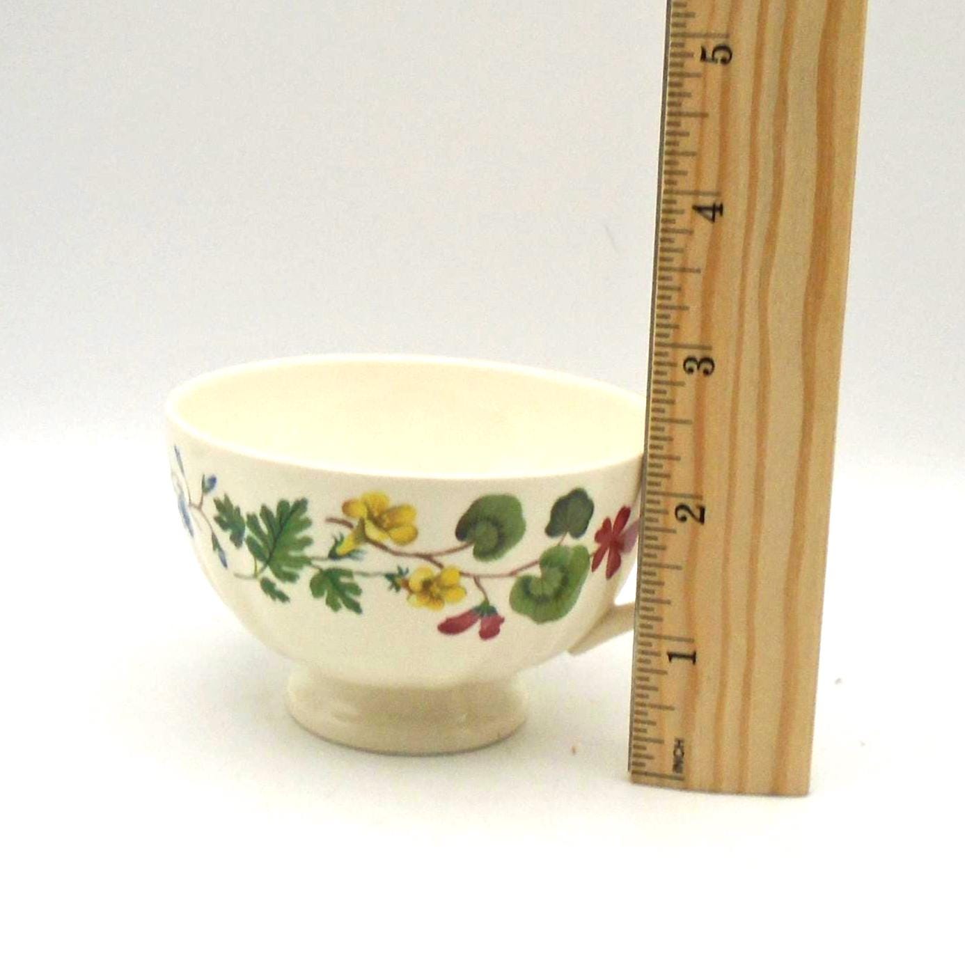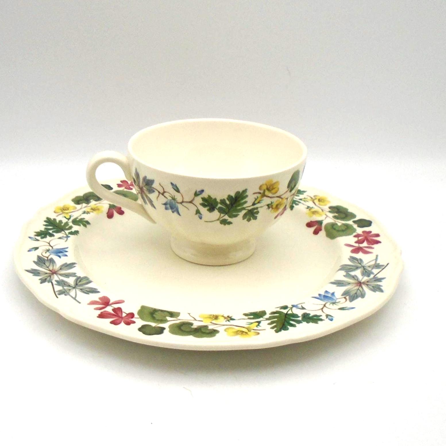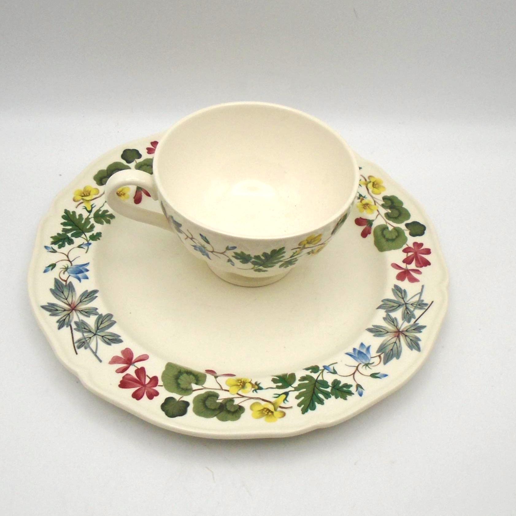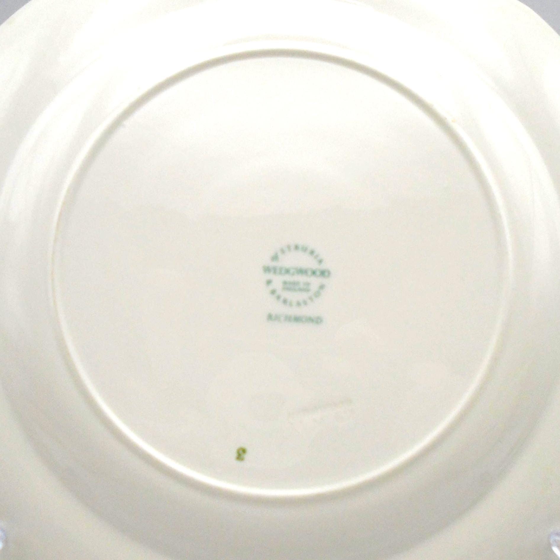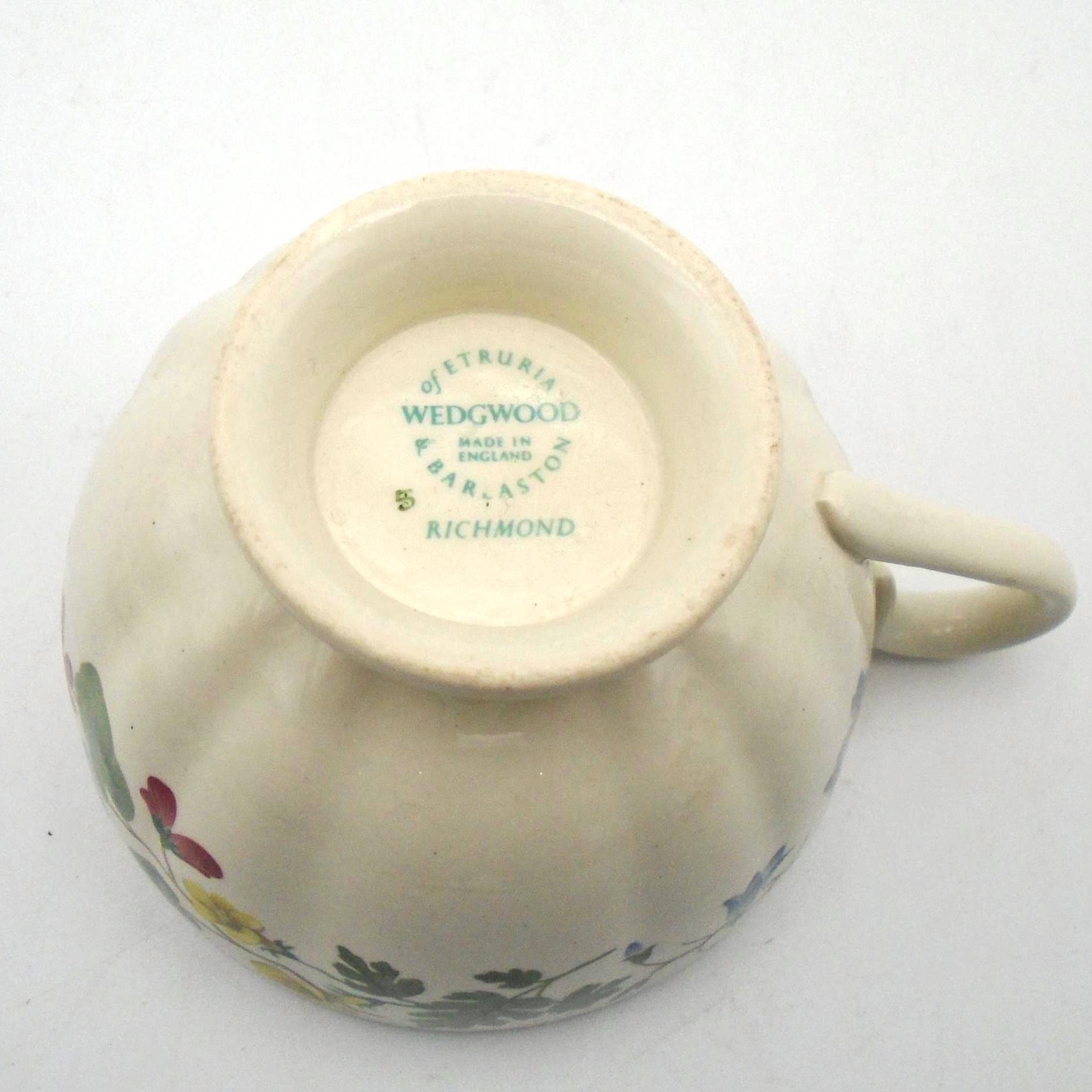 This lovely set of 4 footed tea/coffee cups and 4 salad /luncheon plates are marked "Wedgwood of Etruria & Barlaston, Made in England, Richmond " and feature a design of multi-color leaves, and flowers around a scalloped edge.