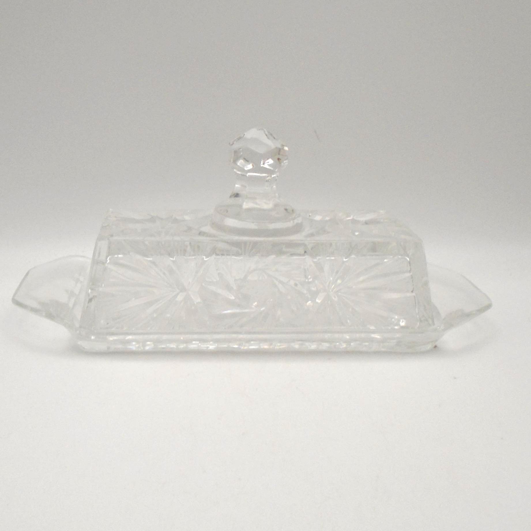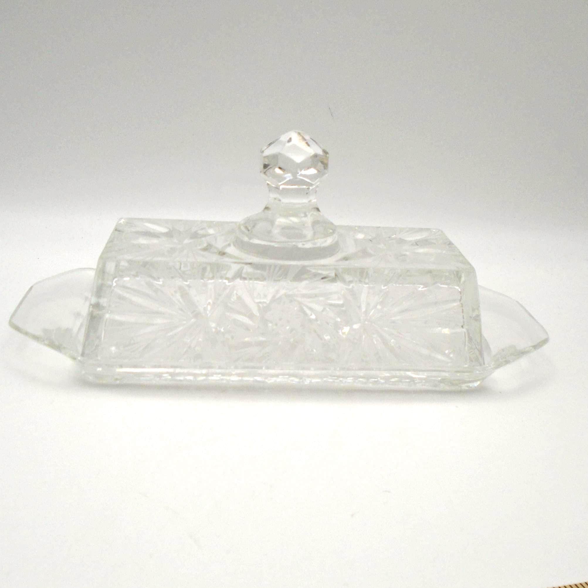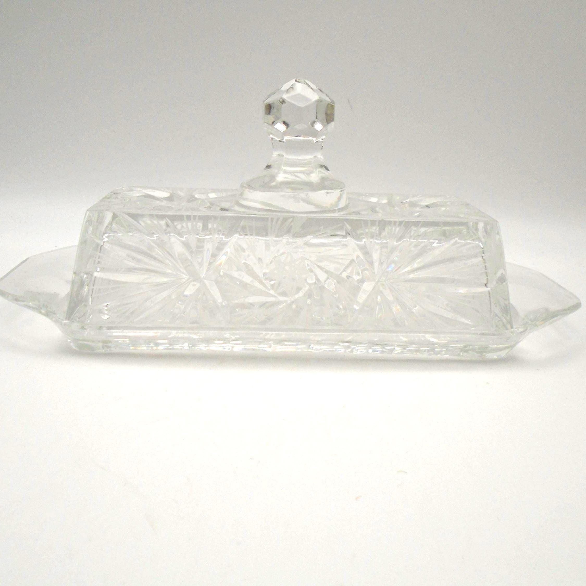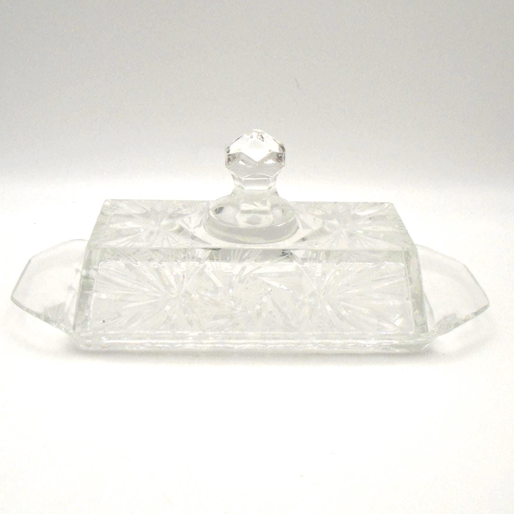 This vintage American Cut crystal butter dish in the "Eleanor" pattern is awesome. This nostalgic butter dish is functional, substantial, and collectible. This specific style features a brilliant-cut glass finish with pinwheel and star designs. This dish holds a 1/4 pound stick of butter and measures approximately 8-1/2"W x 3-1/2" Tall x 3-1/4 Wide (front to back).