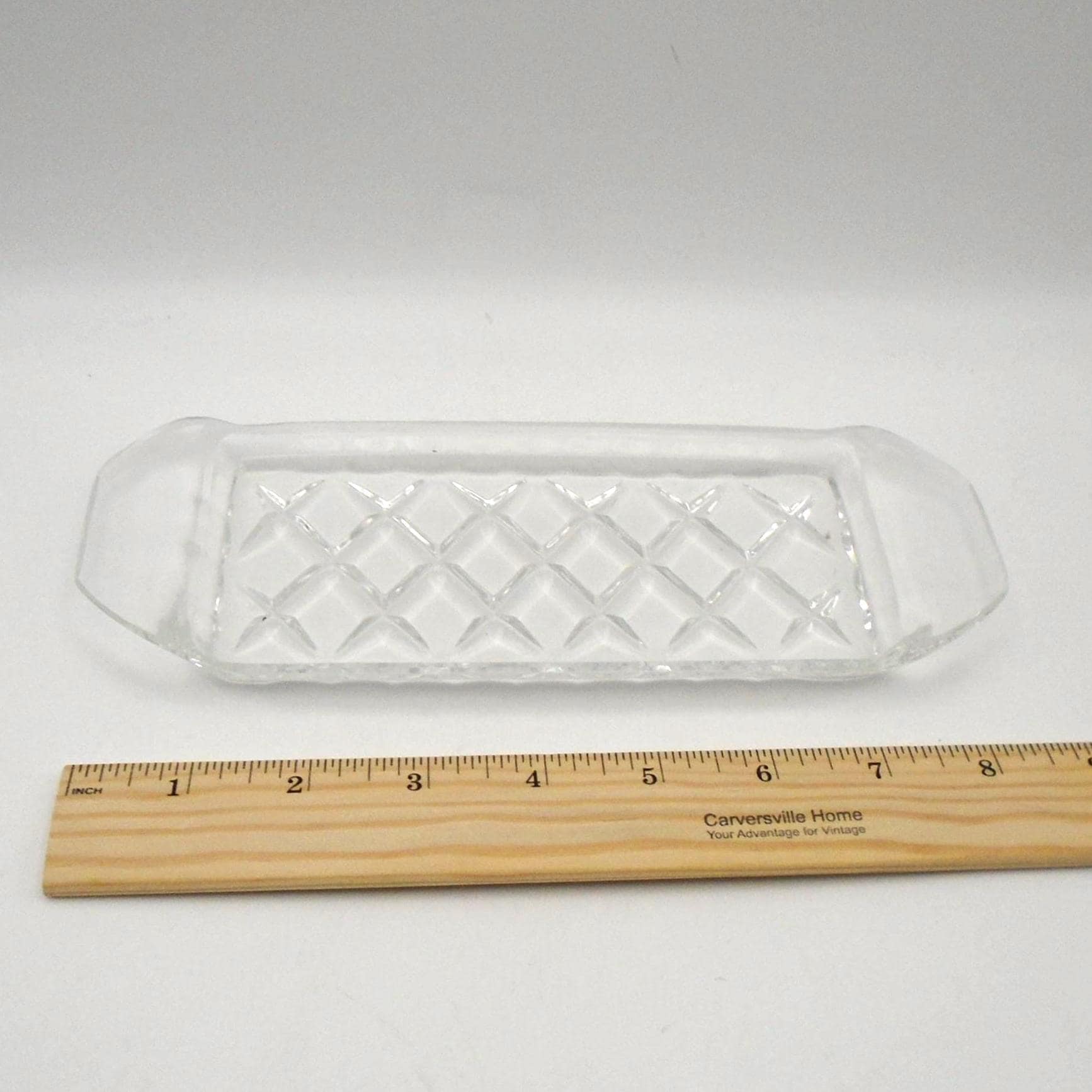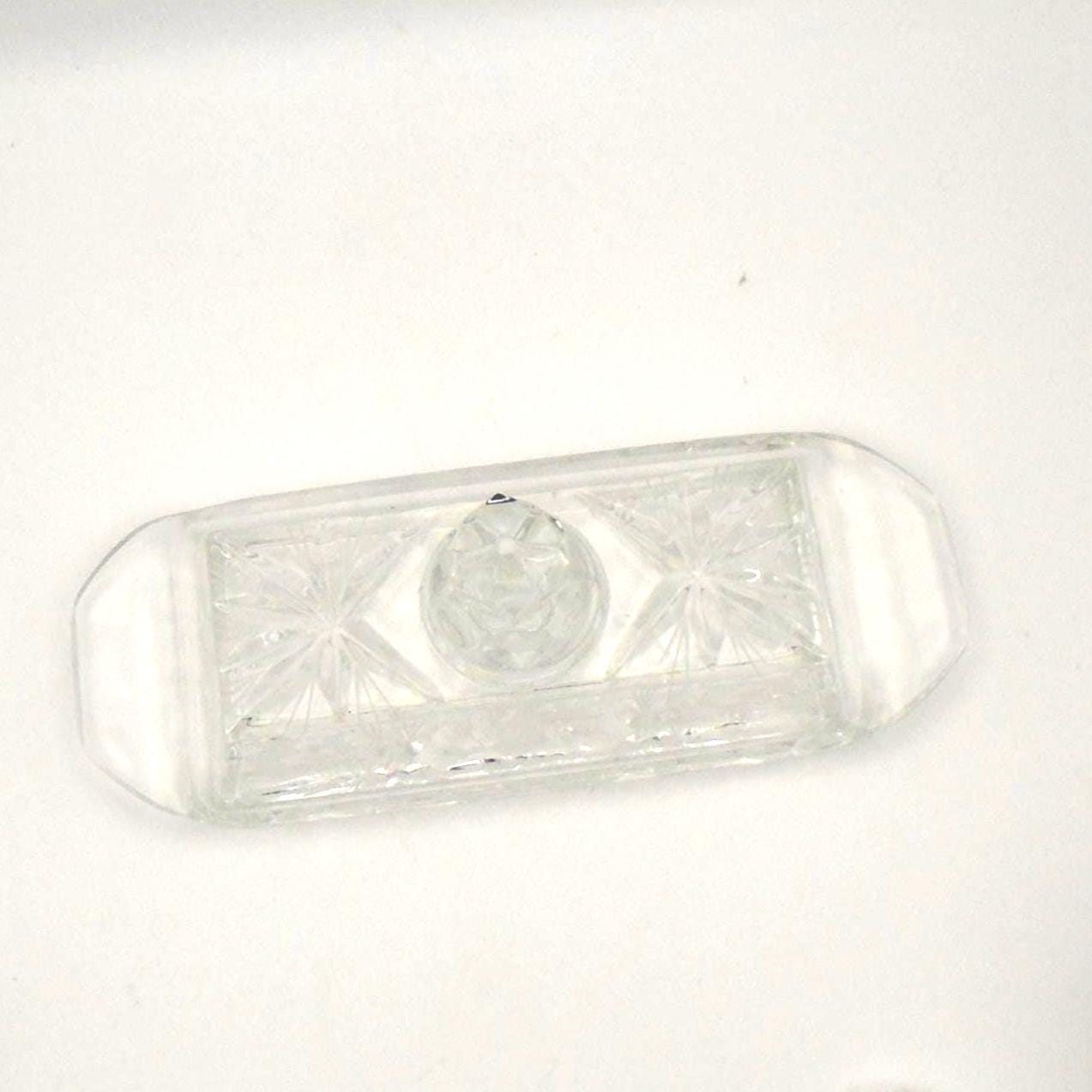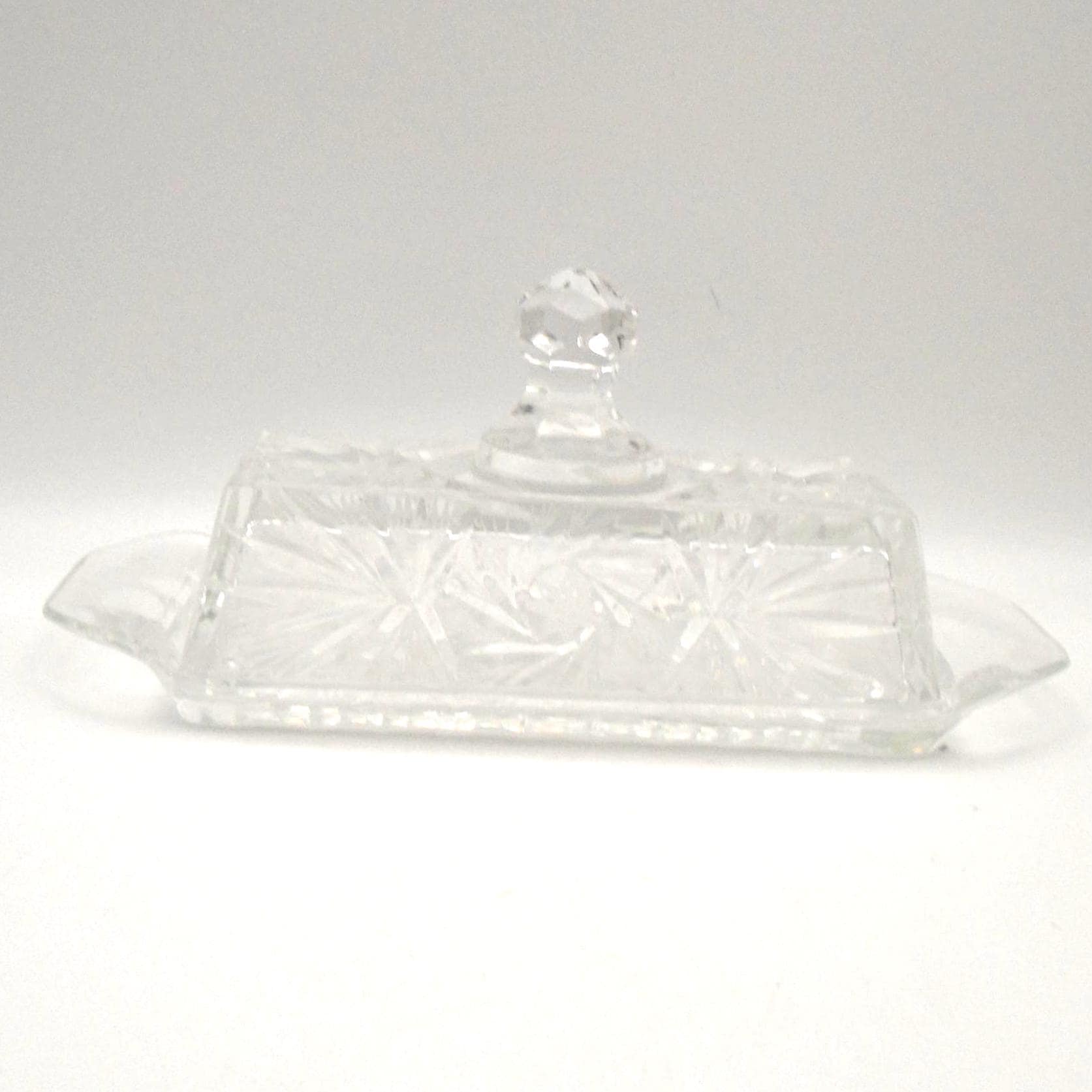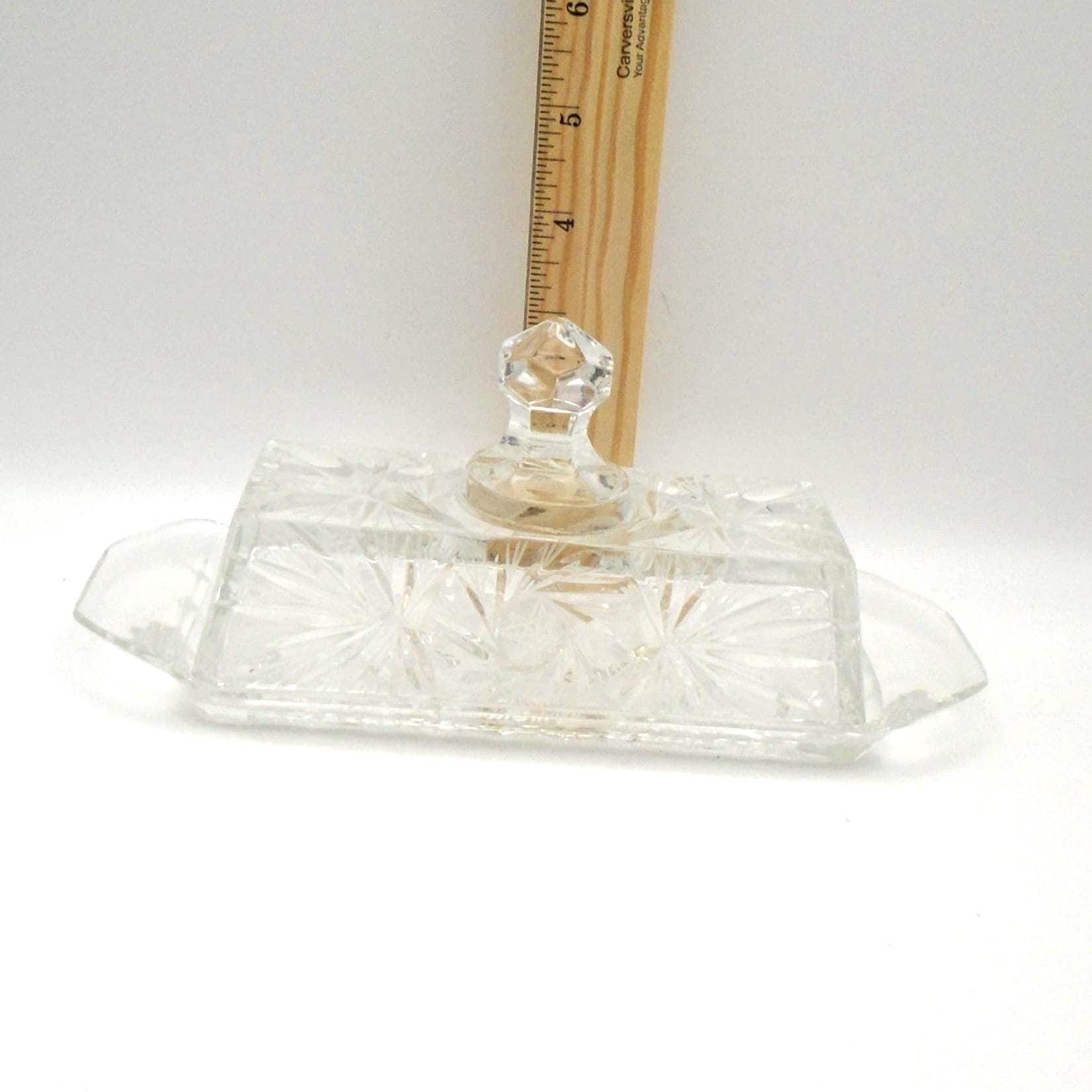 This vintage American Cut crystal butter dish in the "Eleanor" pattern is awesome. This nostalgic butter dish is functional, substantial, and collectible. This specific style features a brilliant-cut glass finish with pinwheel and star designs. This dish holds a 1/4 pound stick of butter and measures approximately 8-1/2"W x 3-1/2" Tall x 3-1/4 Wide (front to back).