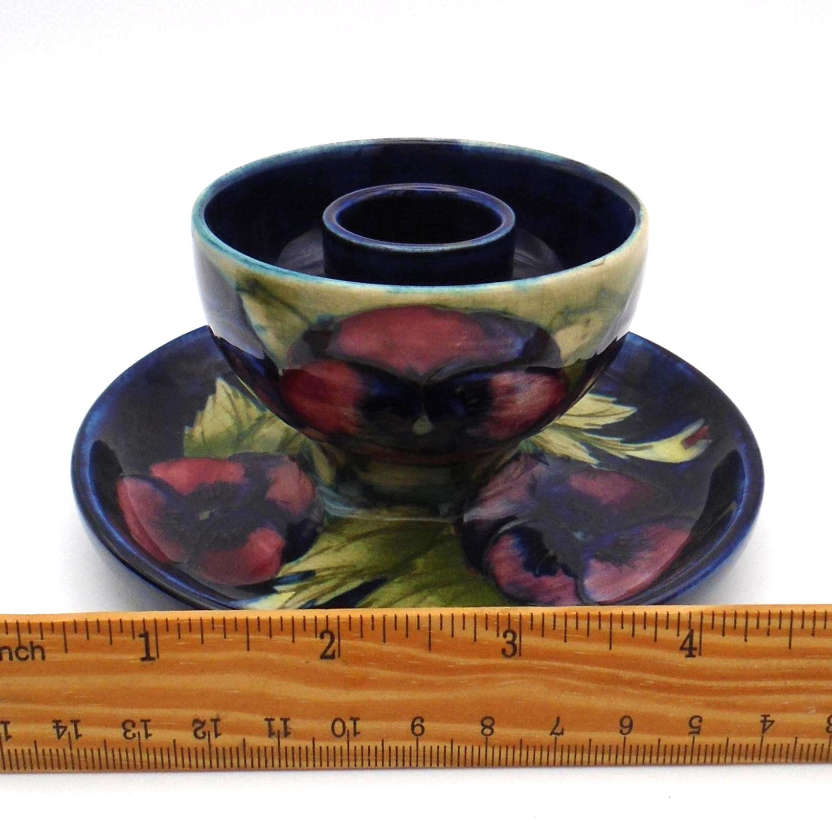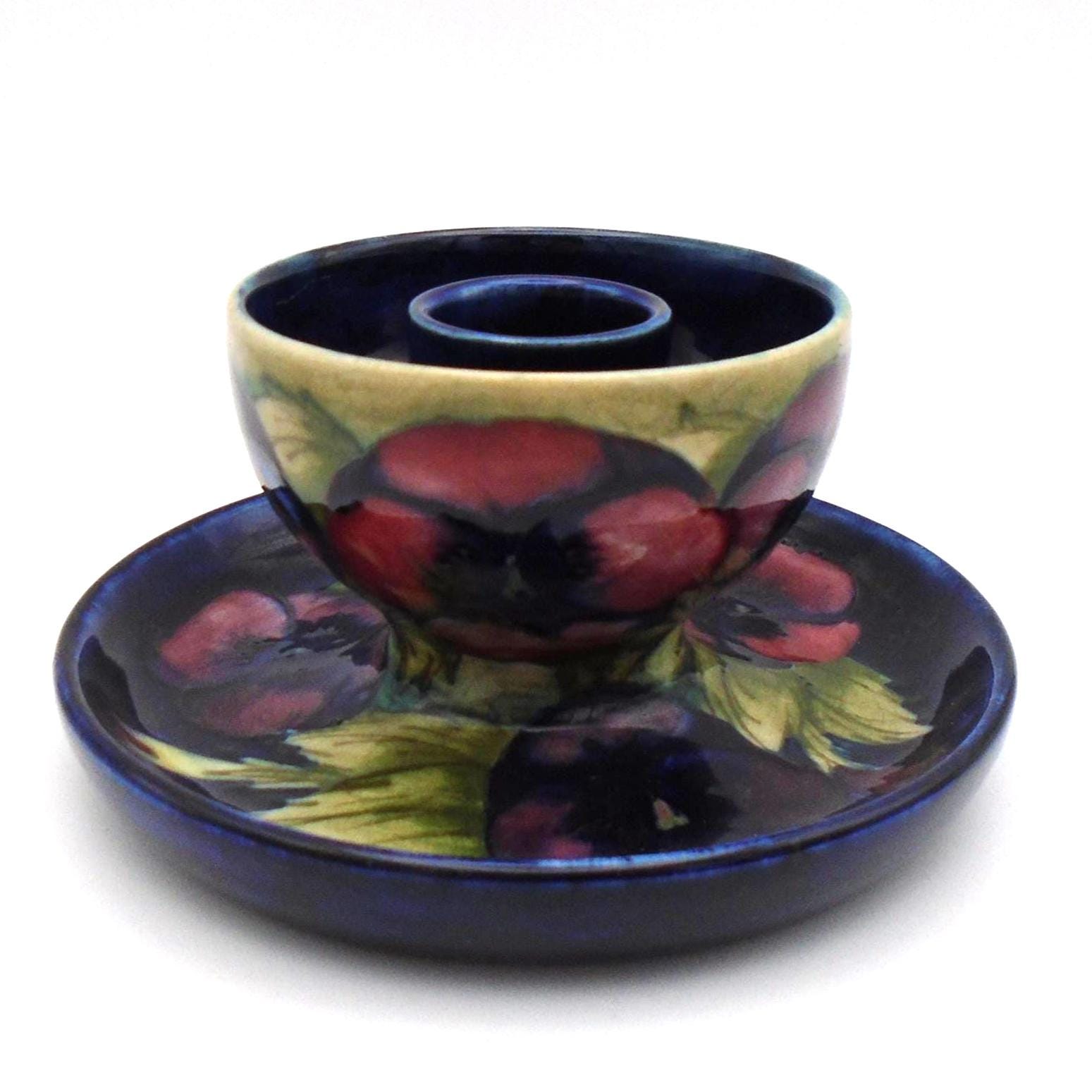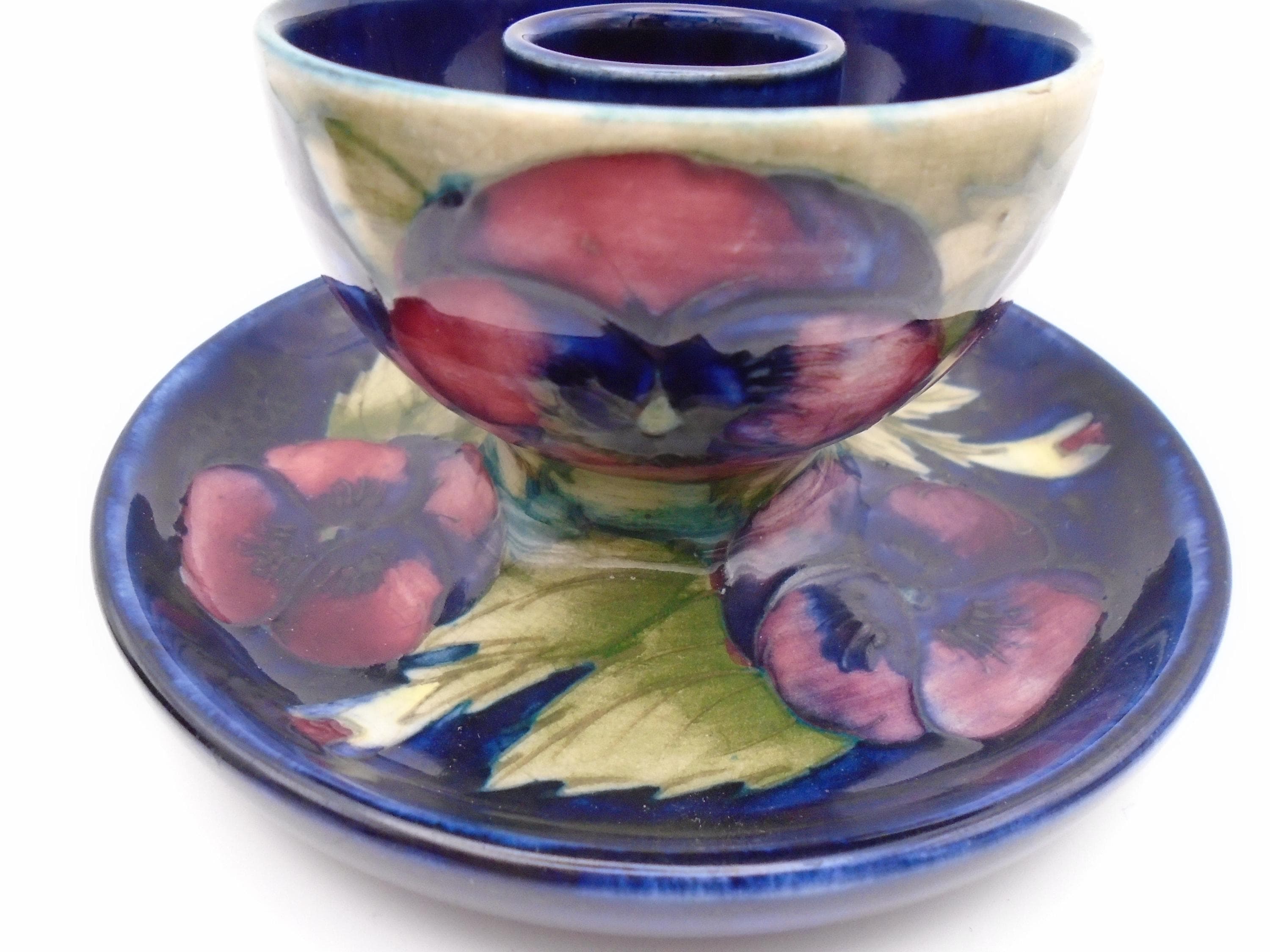 A rare Moorcroft Pottery two-tier candle holder featuring the "Pansy" pattern which includes vibrant hand-painted floral design of red, purple, and green with dark cobalt backgrounds. A classic example of Moorcroft's art pottery style and tube-lining technique.