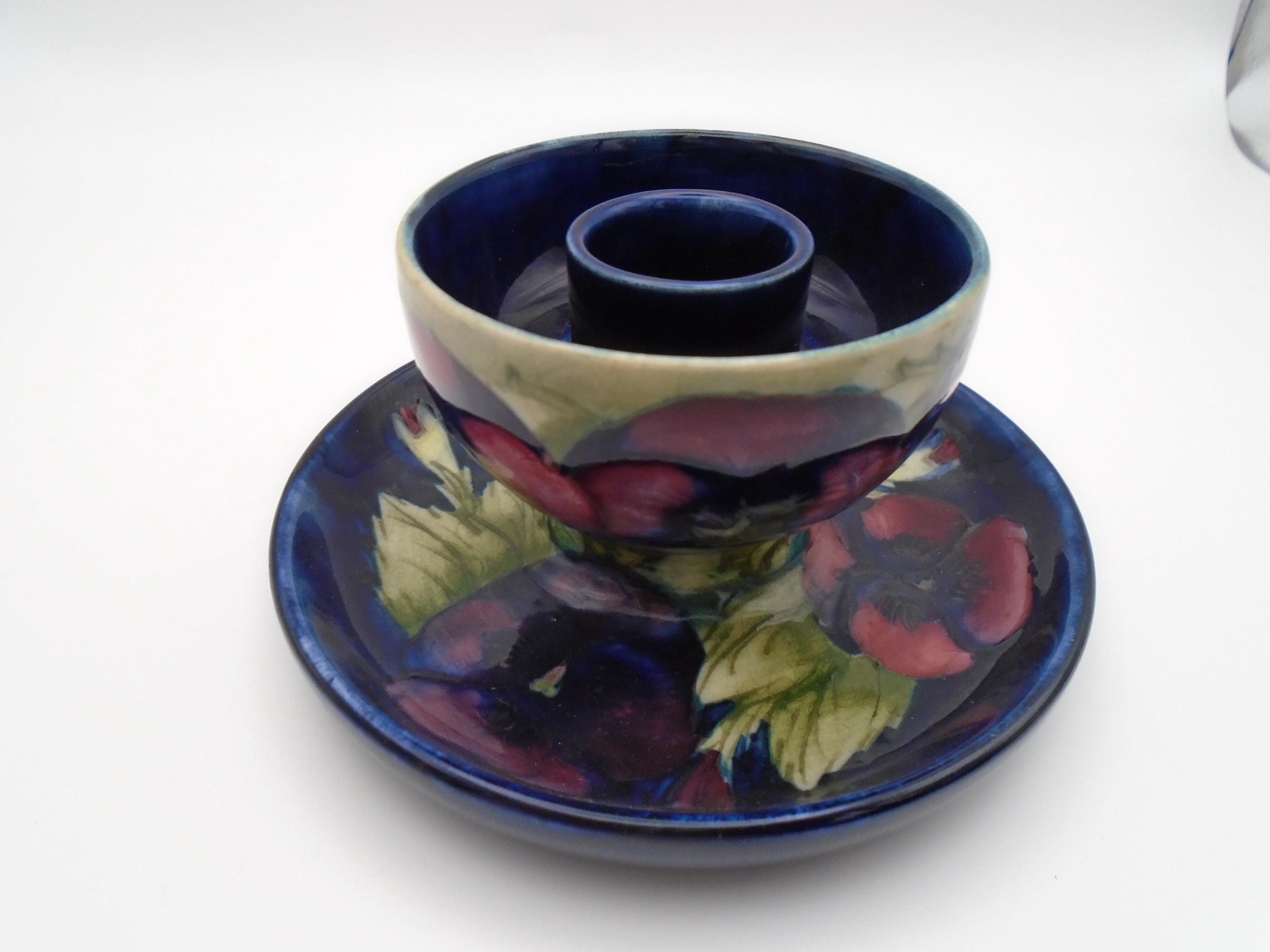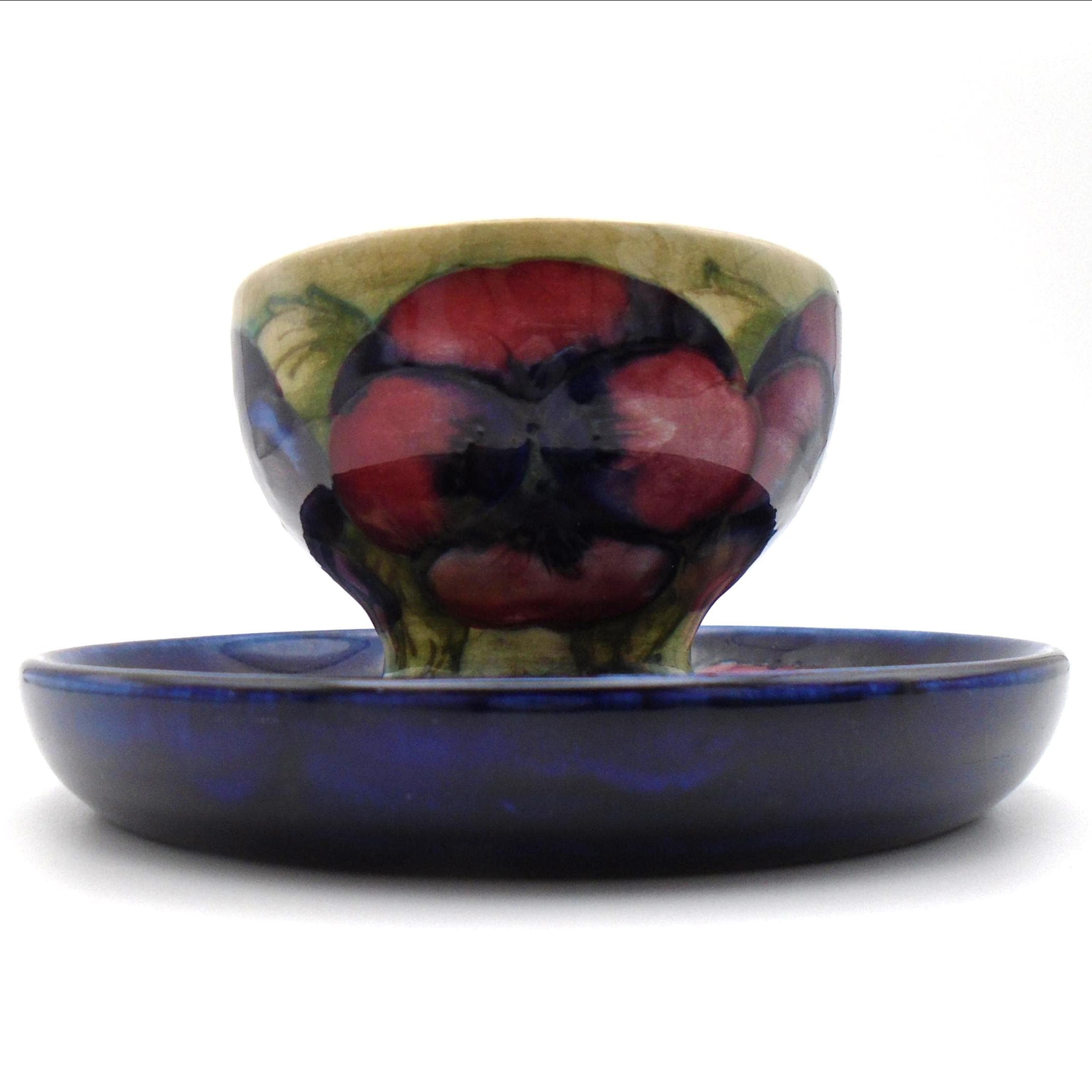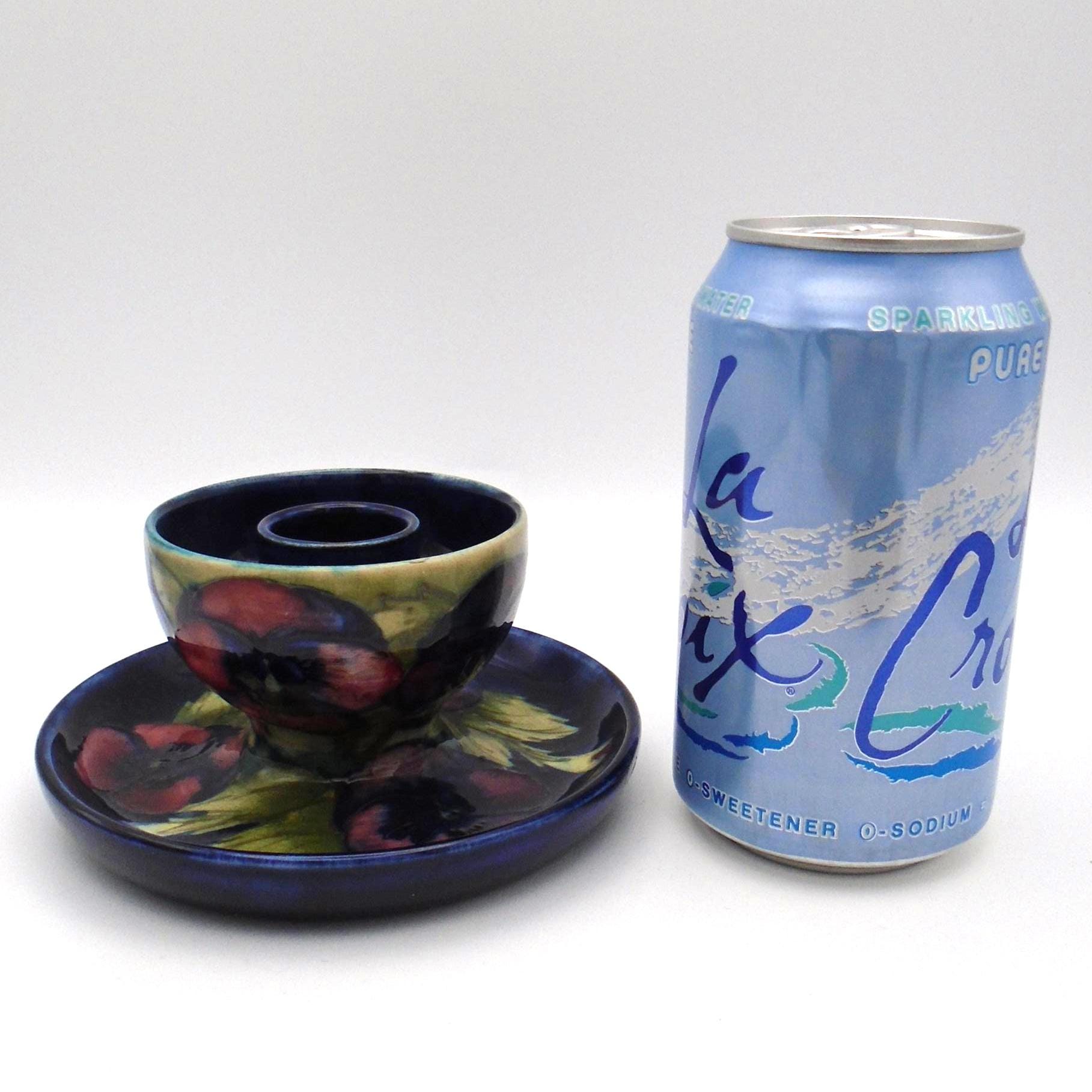 A rare Moorcroft Pottery two-tier candle holder featuring the "Pansy" pattern which includes vibrant hand-painted floral design of red, purple, and green with dark cobalt backgrounds. A classic example of Moorcroft's art pottery style and tube-lining technique.