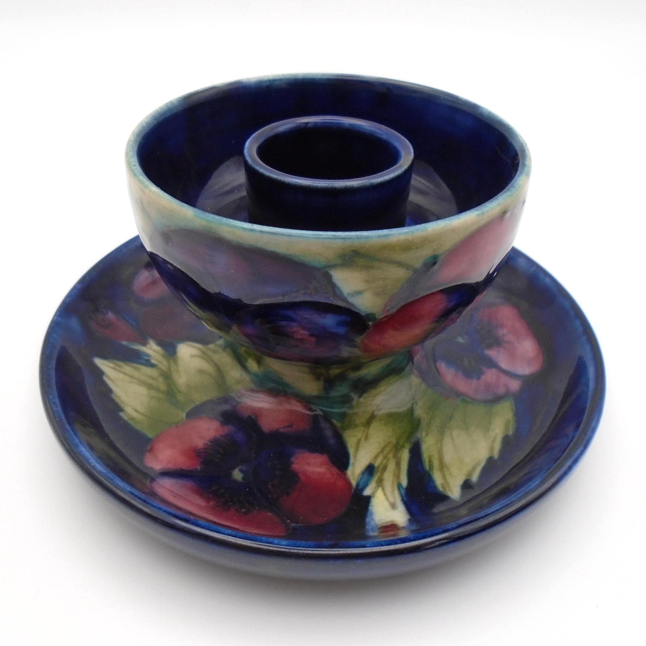 The bottom of this candle holder is impressed with model number, Made In England & Moorcroft. It also has the maker's signature. Attributing to early/mid-20th century based on imprint and signature. In excellent condition. They show normal crazing which is typical for Moorcroft pieces of this age.