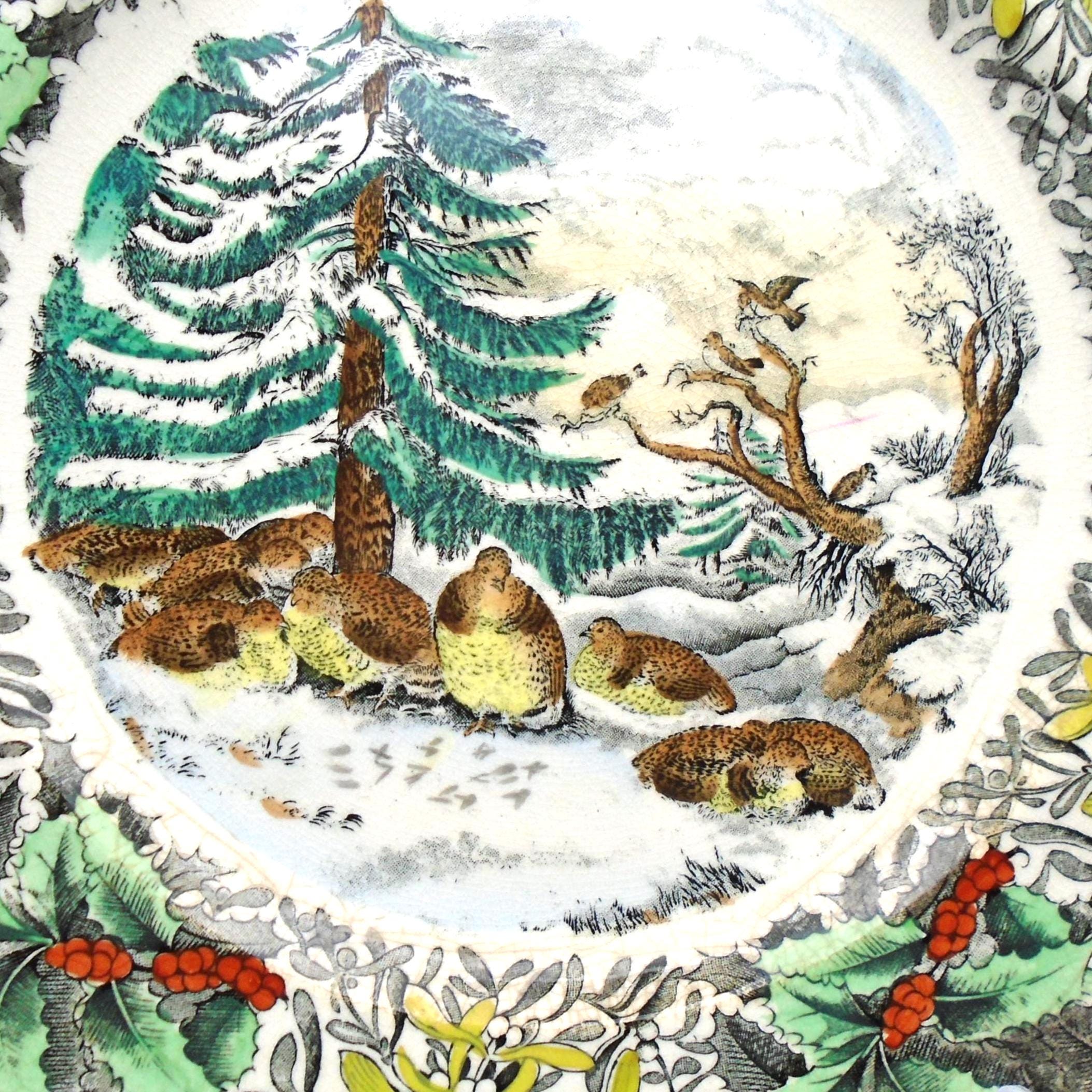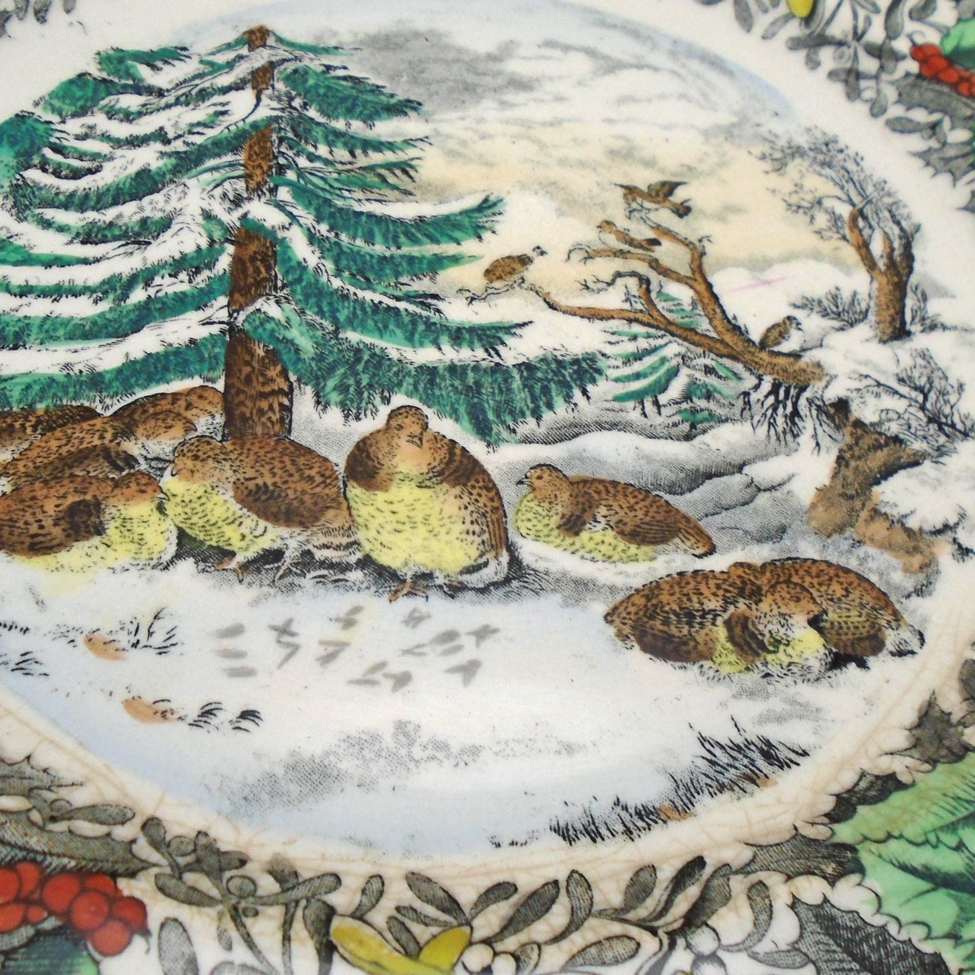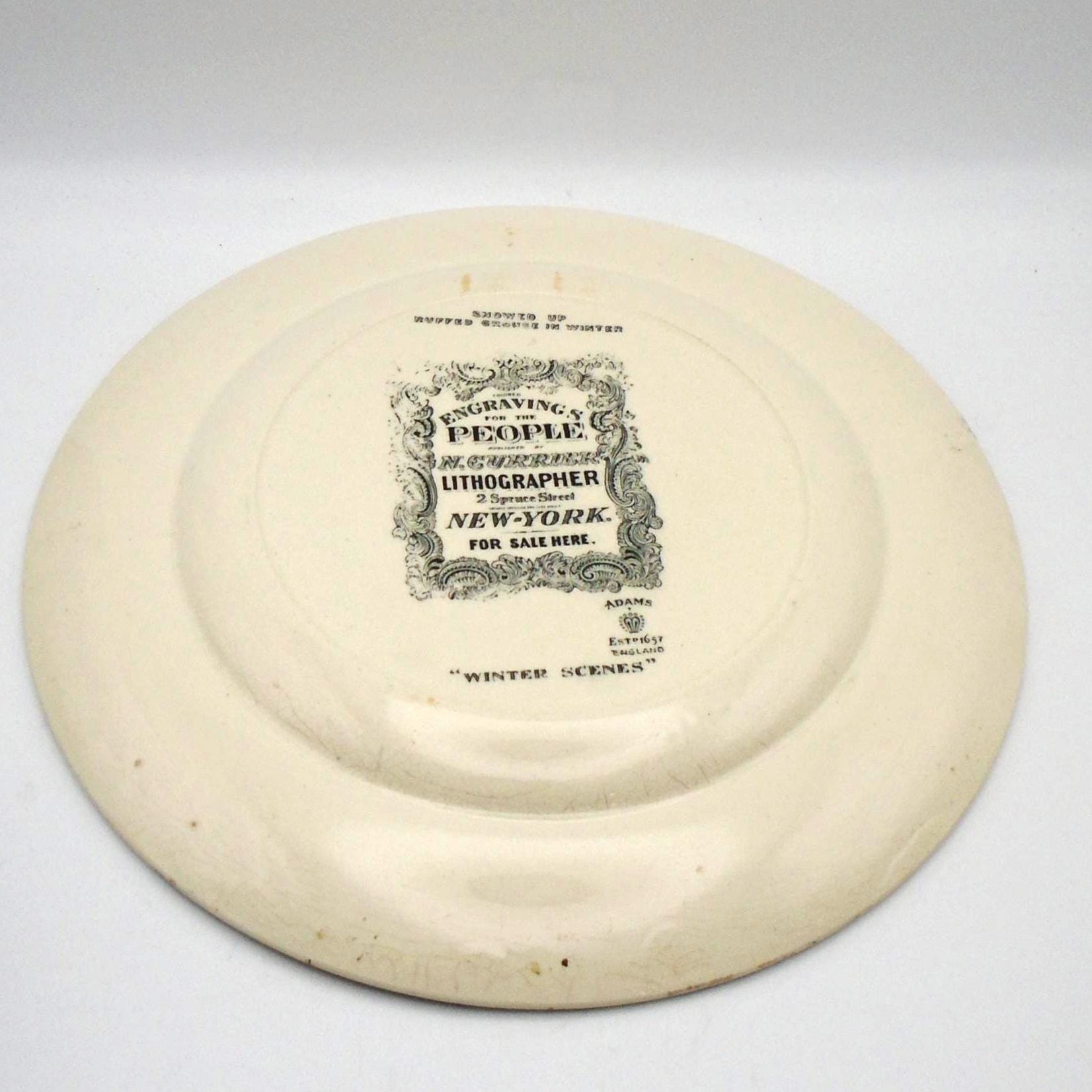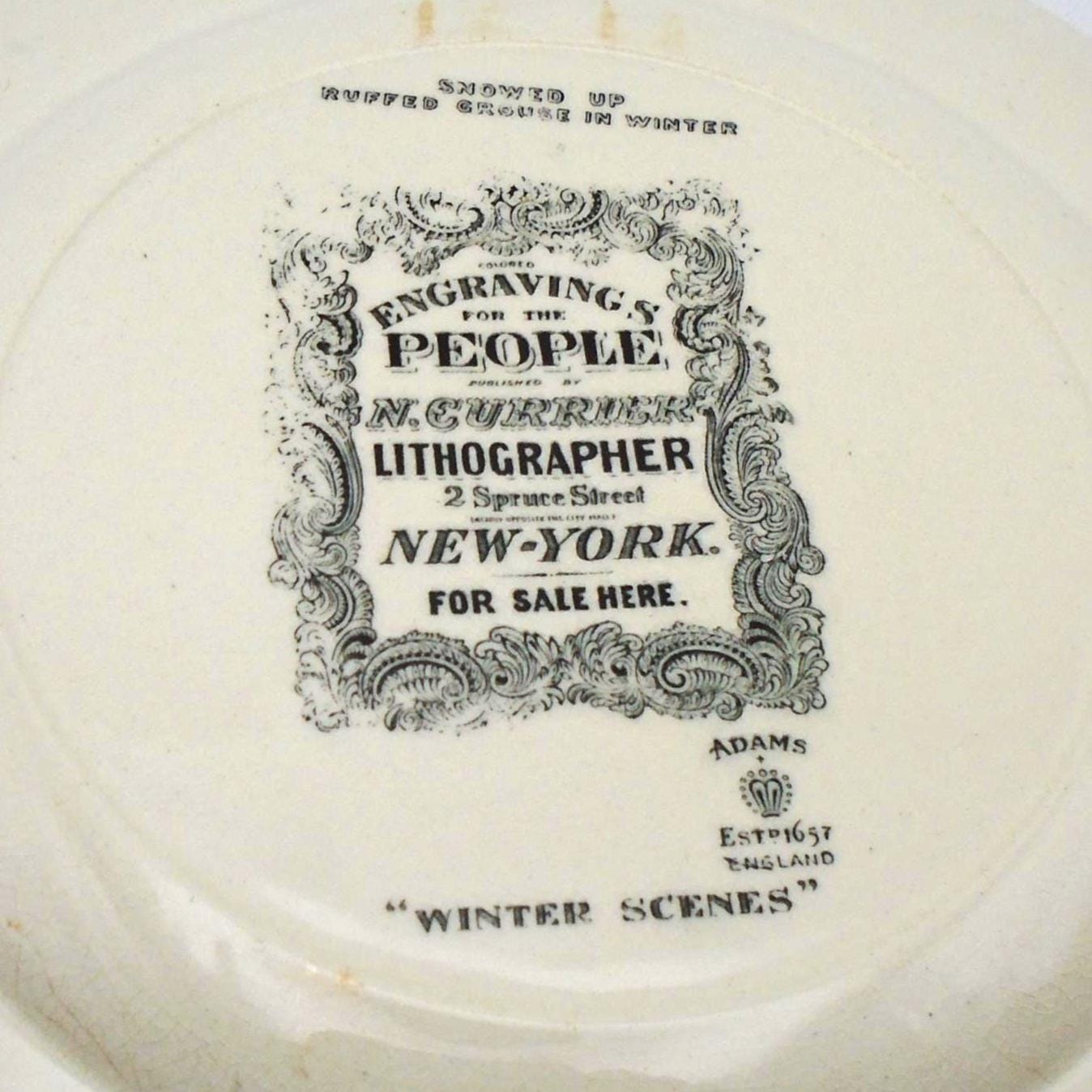 This Adams dinner plate features a beautiful winter scene with a snowed-up ruffled grouse design. This fabulous plate measures approximately 10-1/2" in diameter, and is part of the Adams product line, which was made in England, and features engravings by N. Courier, a New York lithographer. It was produced in the 1920's and is made of high-quality ceramic material. Simply festive and colorful.