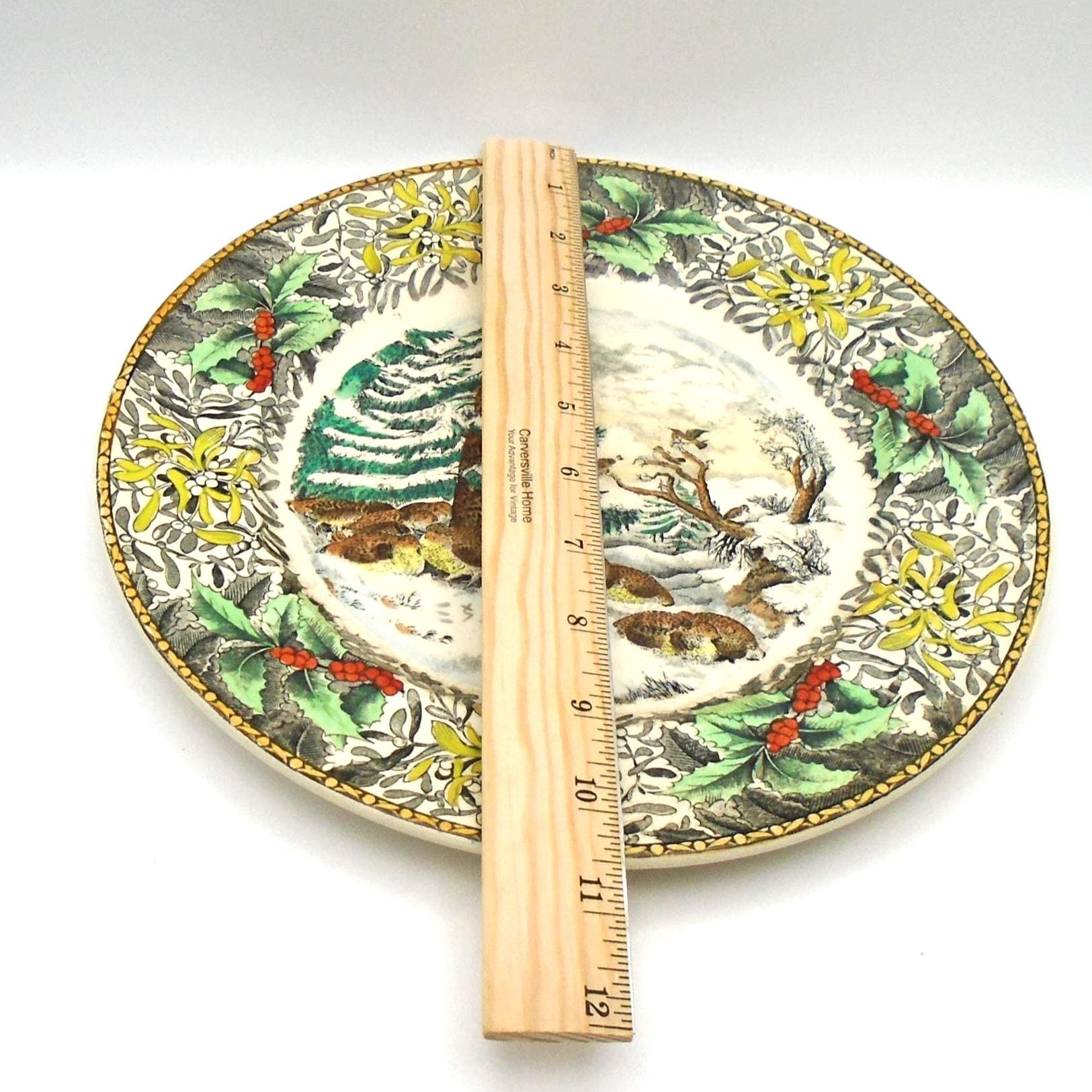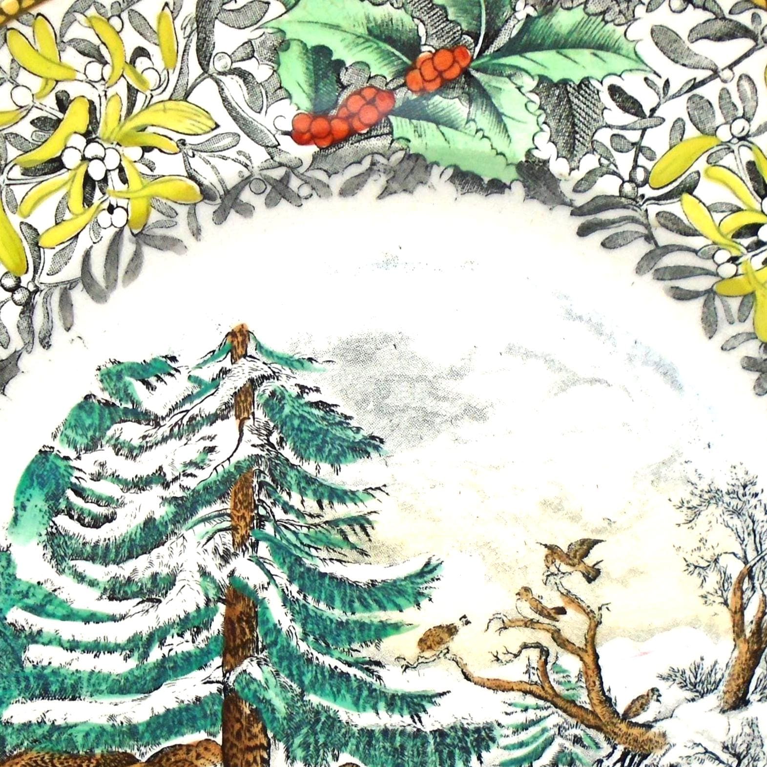 This black and multi-colored design with holly border is vibrant and eye-catching -- the background really pops. The rare find is in very good vintage condition with no chips, cracks, or repairs. There is some slight crazing -- which is not surprising considering the age of the plate -- we think it actually adds to the charm.