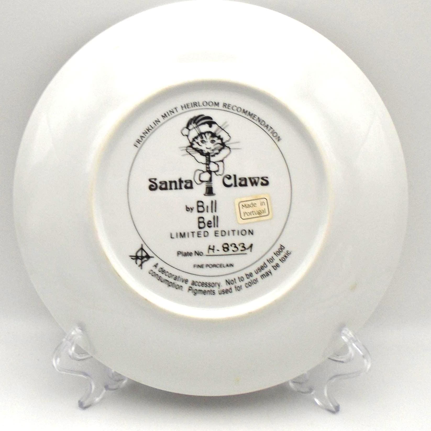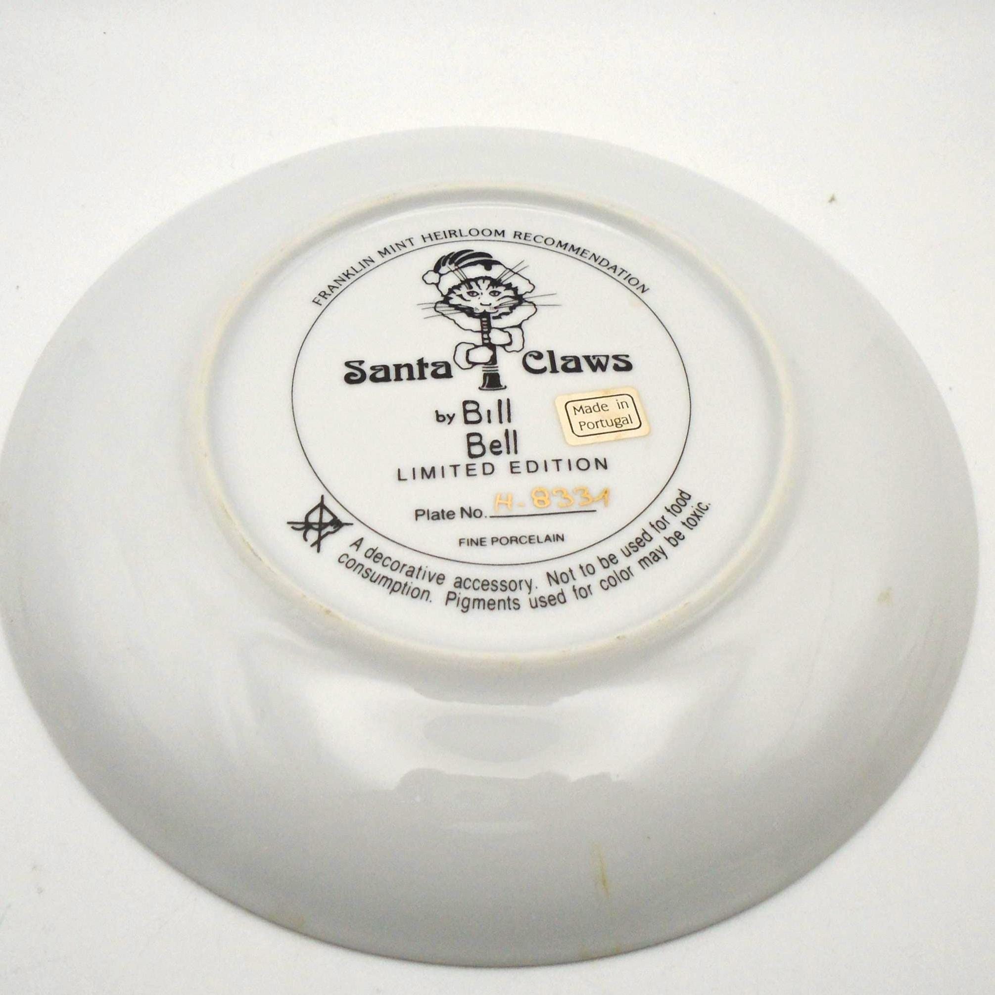 This vintage Franklin Mint limited-edition "Santa Claws" collector plate, designed by Bill Bell, is whimsical, festive and fun! This plate measures approximately 8-1/4" in Diameter, and is made of fine porcelain with a rim that's lined in gold. The front is signed by Bill Bell and is numbered on the back.