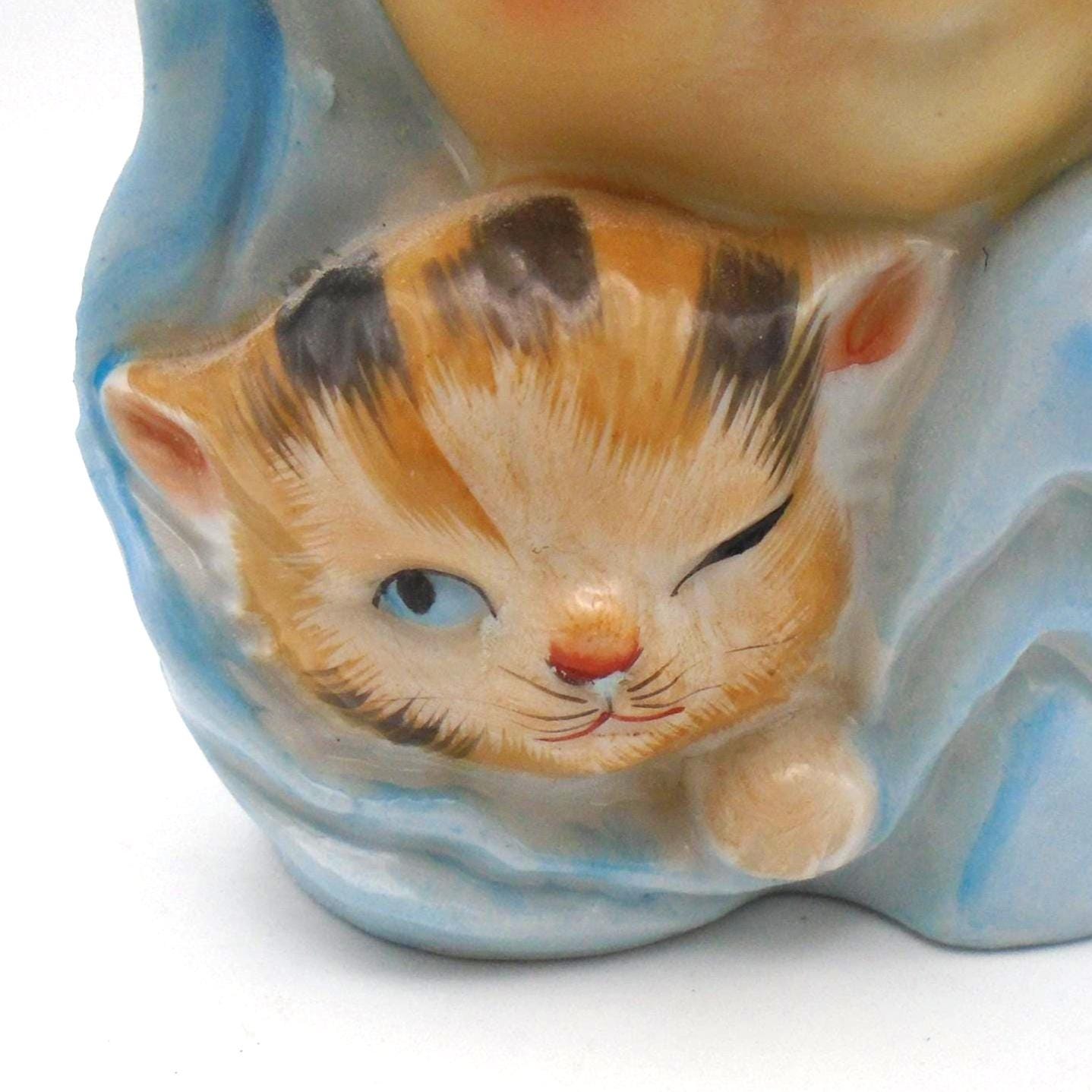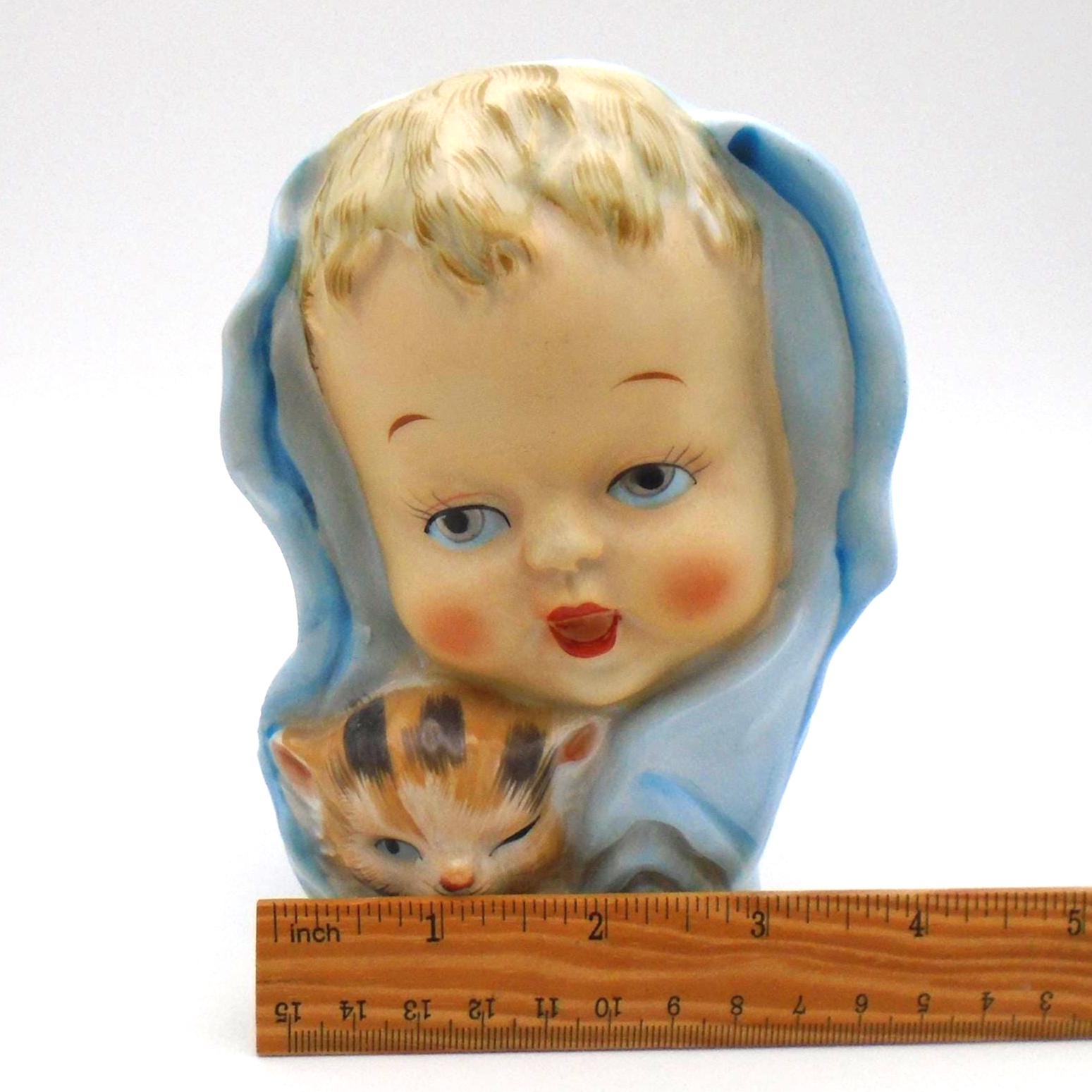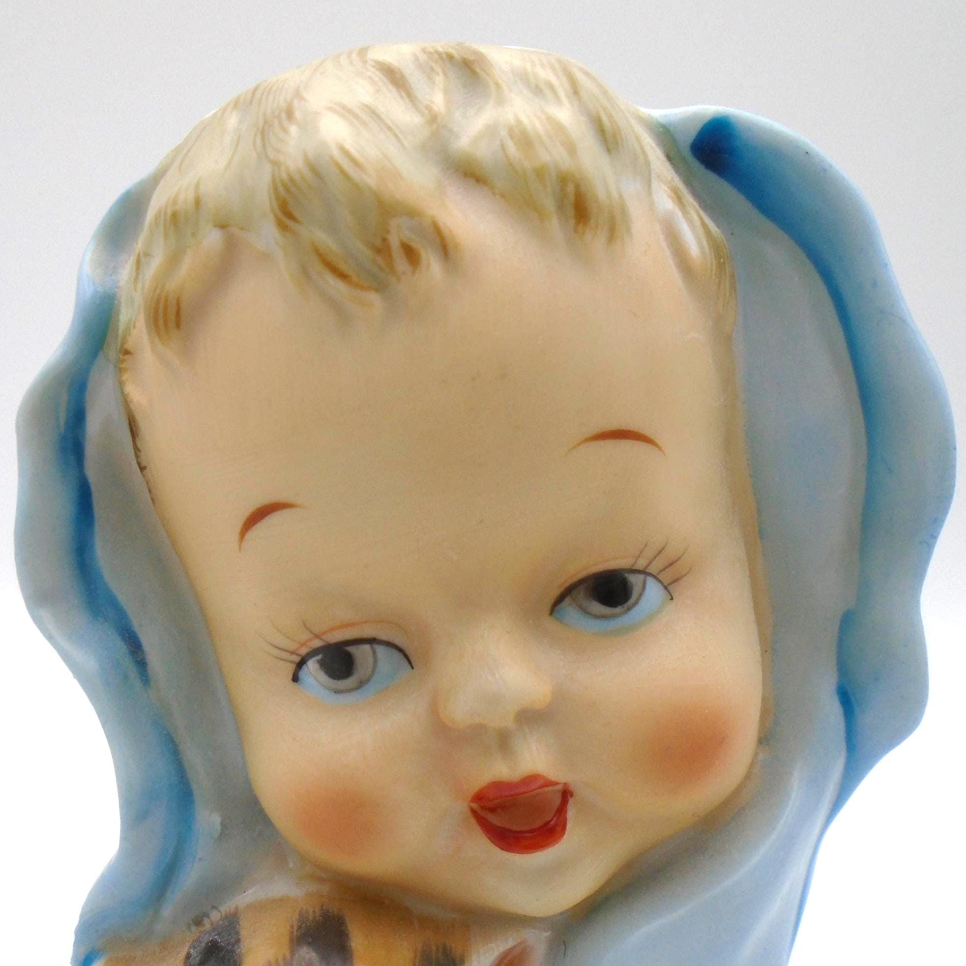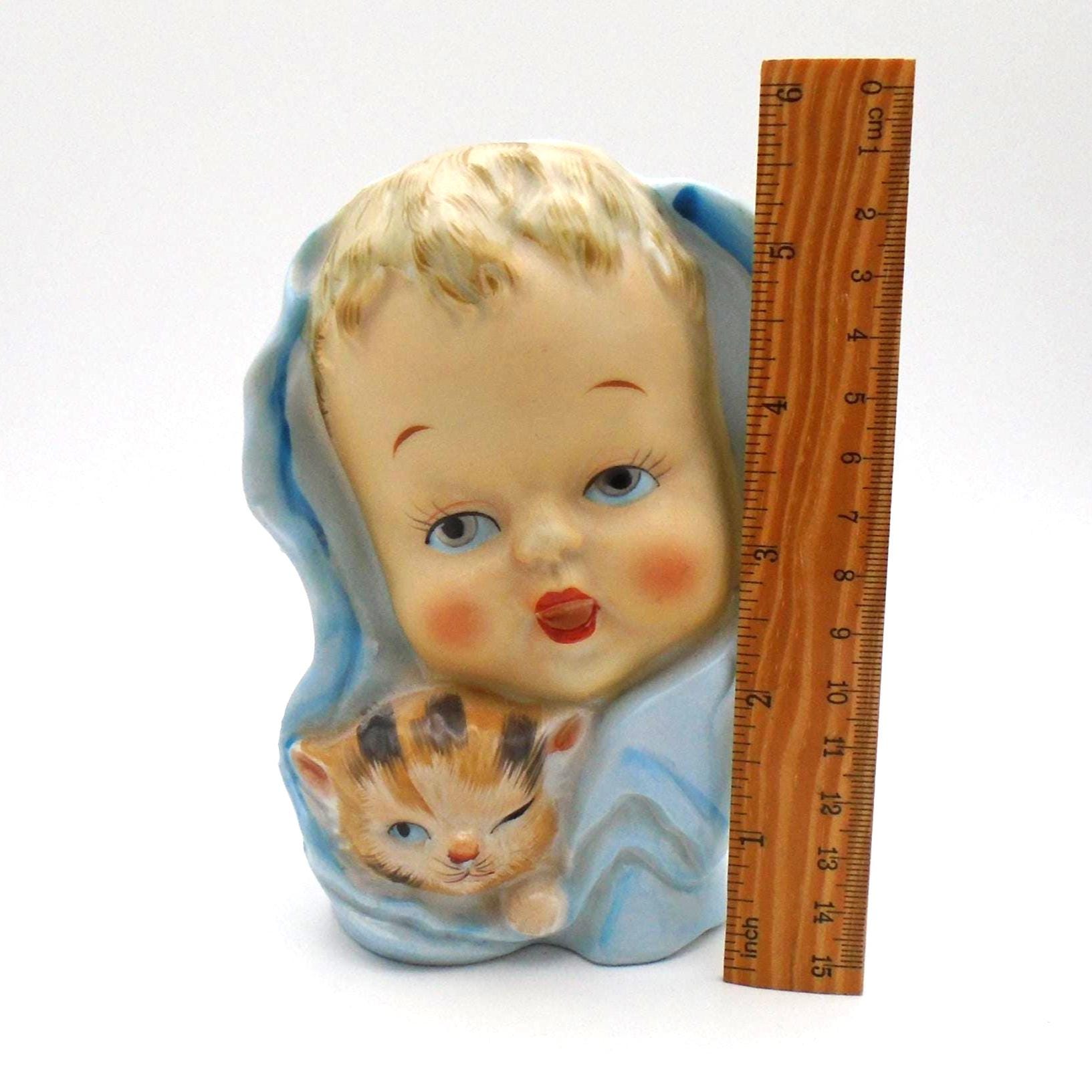 Vintage 1950-60's Baby Head Vase with winking Kitten and Blue Blanket. A great addition for the collector, or as MCM decor for a retro child's room. In excellent vintage condition with no chips, cracks, or repairs. Minor wear from use, inside is very clean. Any imperfections seen are from the manufacturing process. As sourced with no attempt to clean or alter.