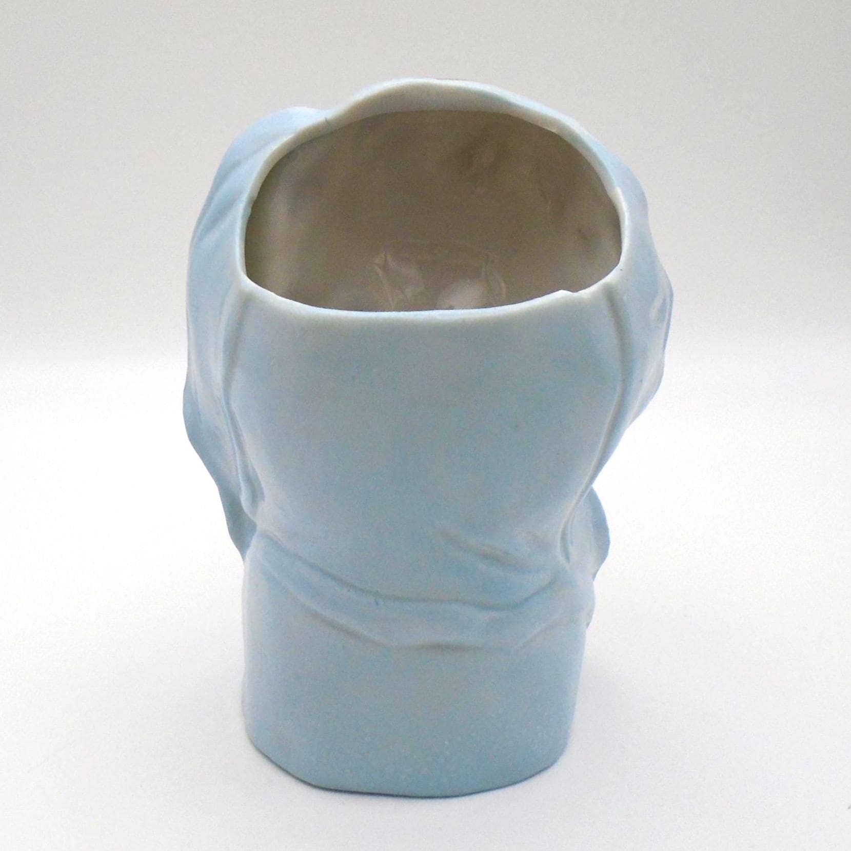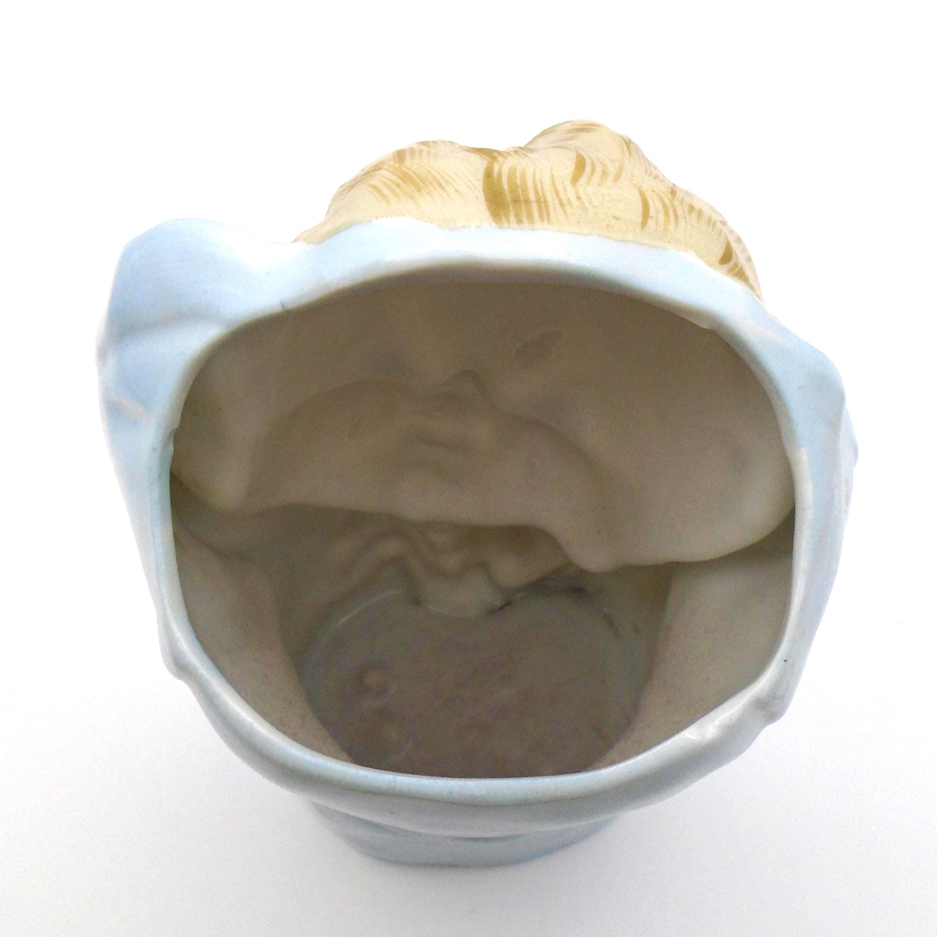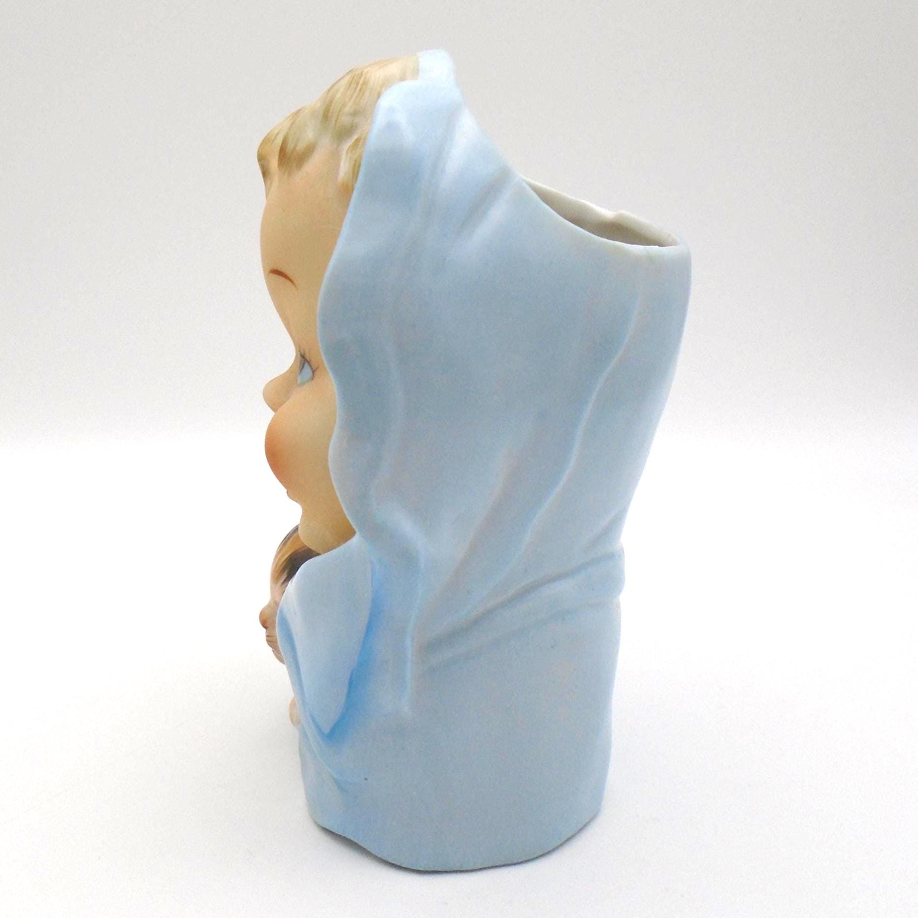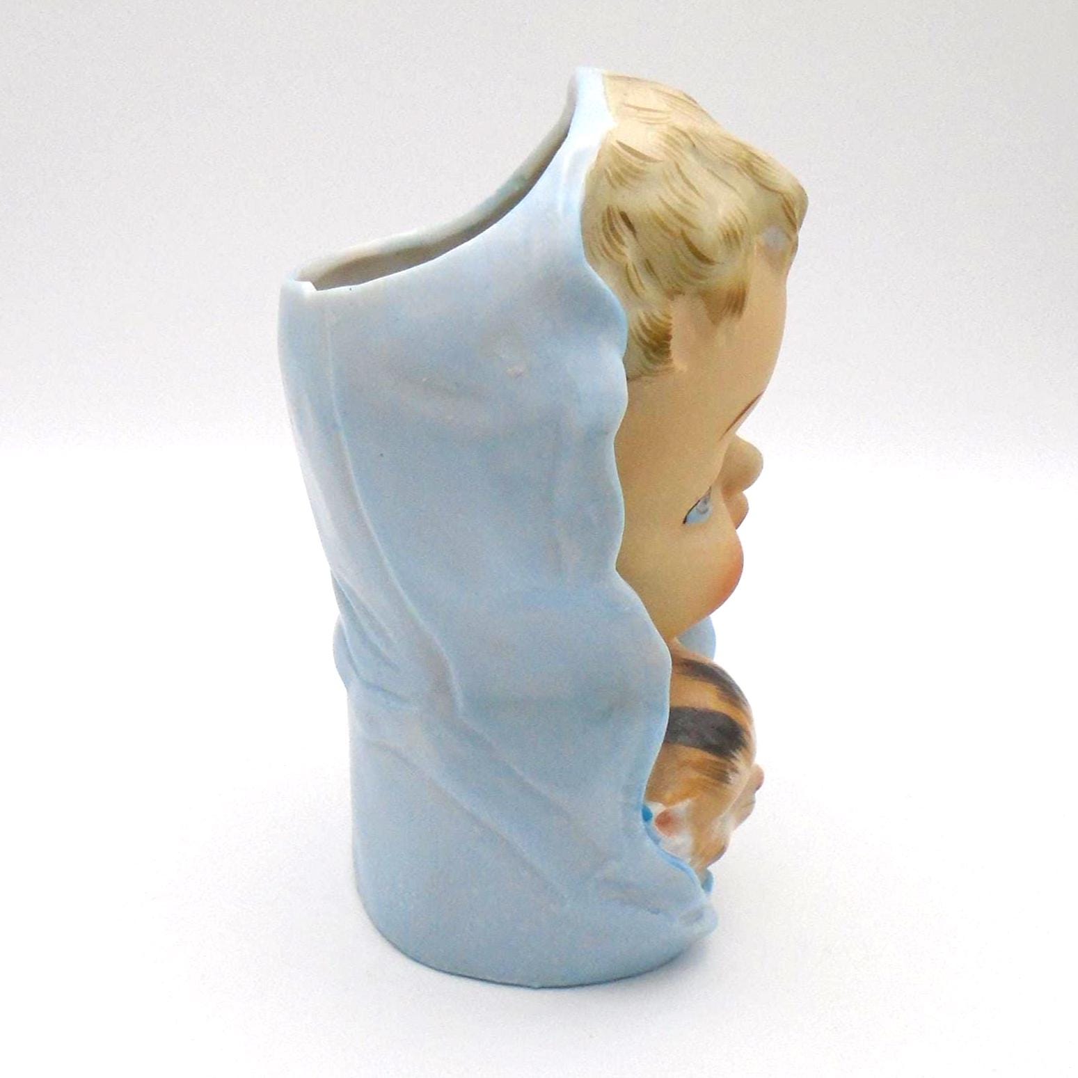 Vintage 1950-60's Baby Head Vase with winking Kitten and Blue Blanket. A great addition for the collector, or as MCM decor for a retro child's room. In excellent vintage condition with no chips, cracks, or repairs. Minor wear from use, inside is very clean. Any imperfections seen are from the manufacturing process. As sourced with no attempt to clean or alter.