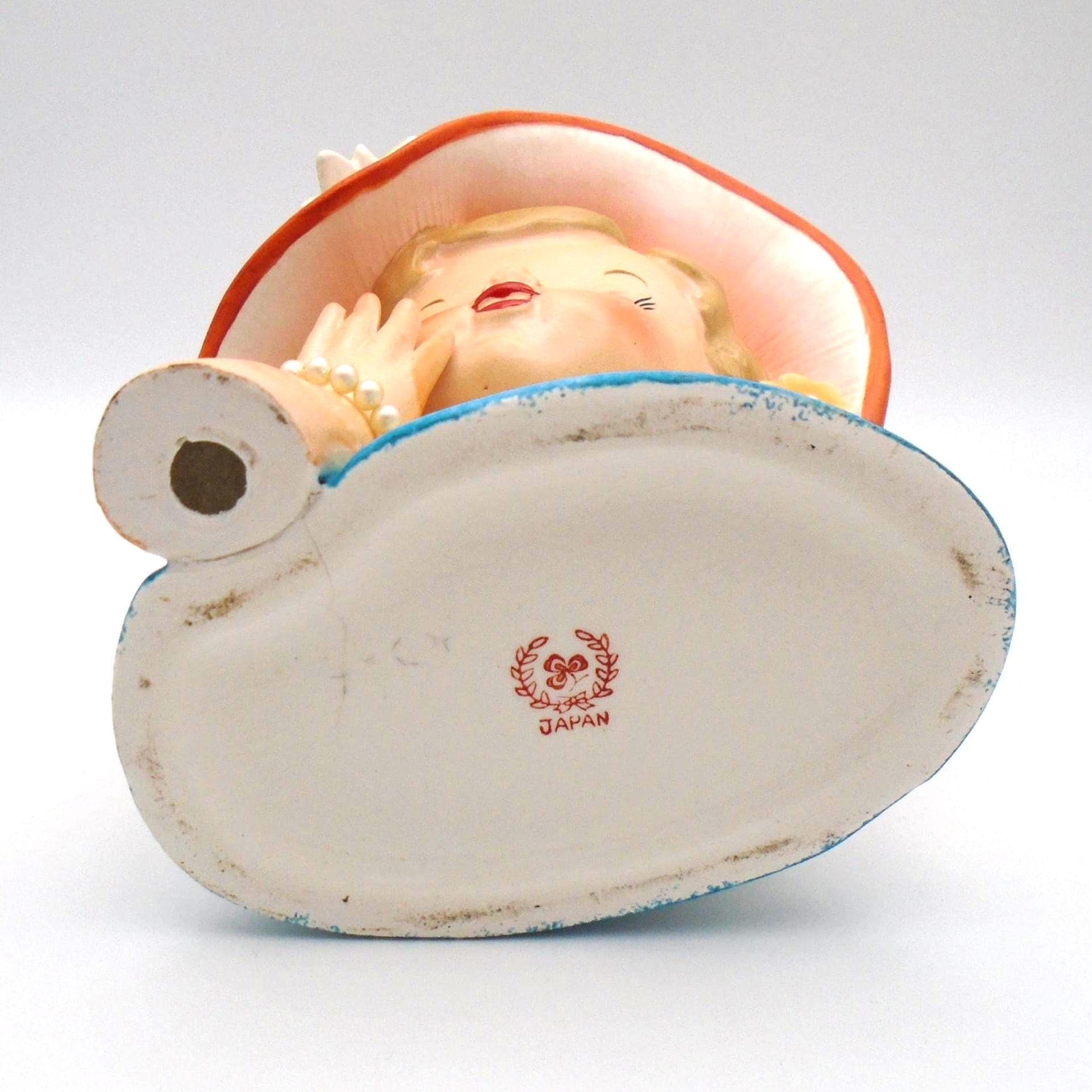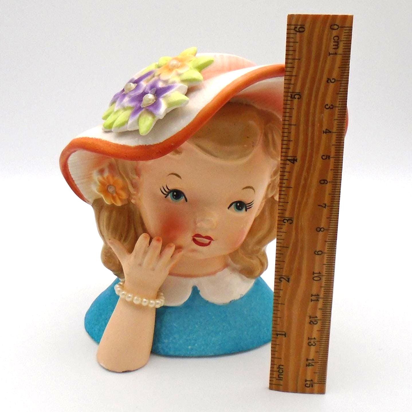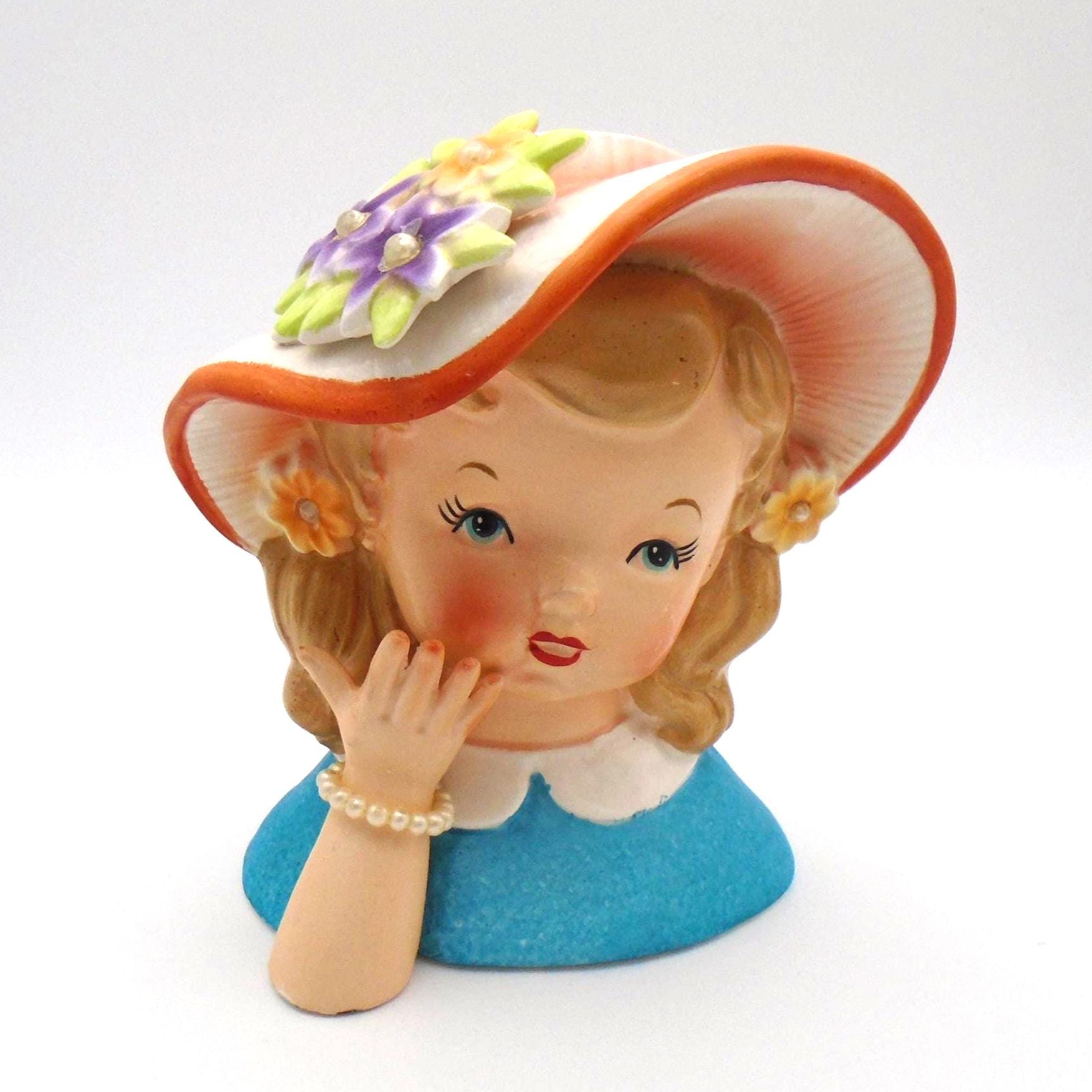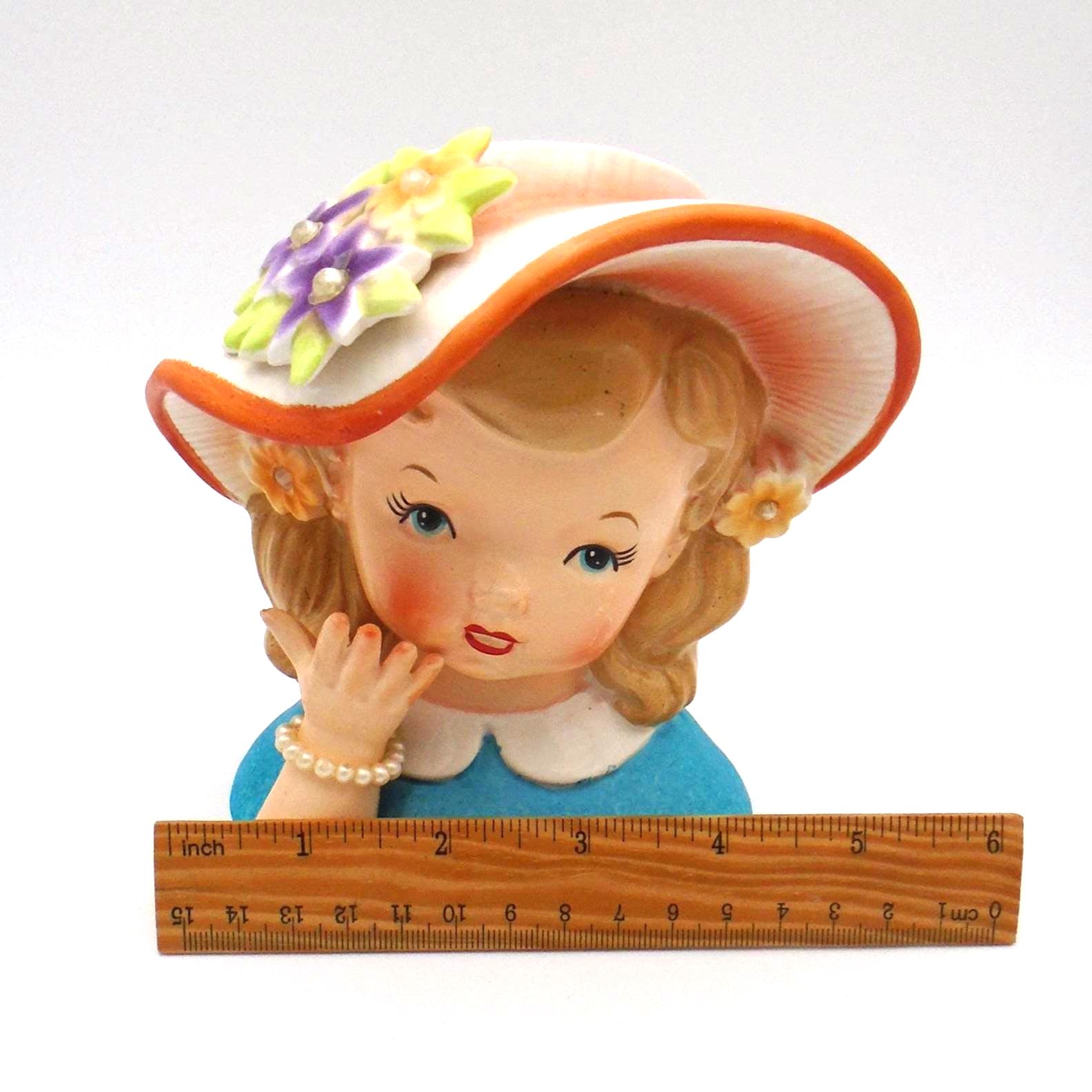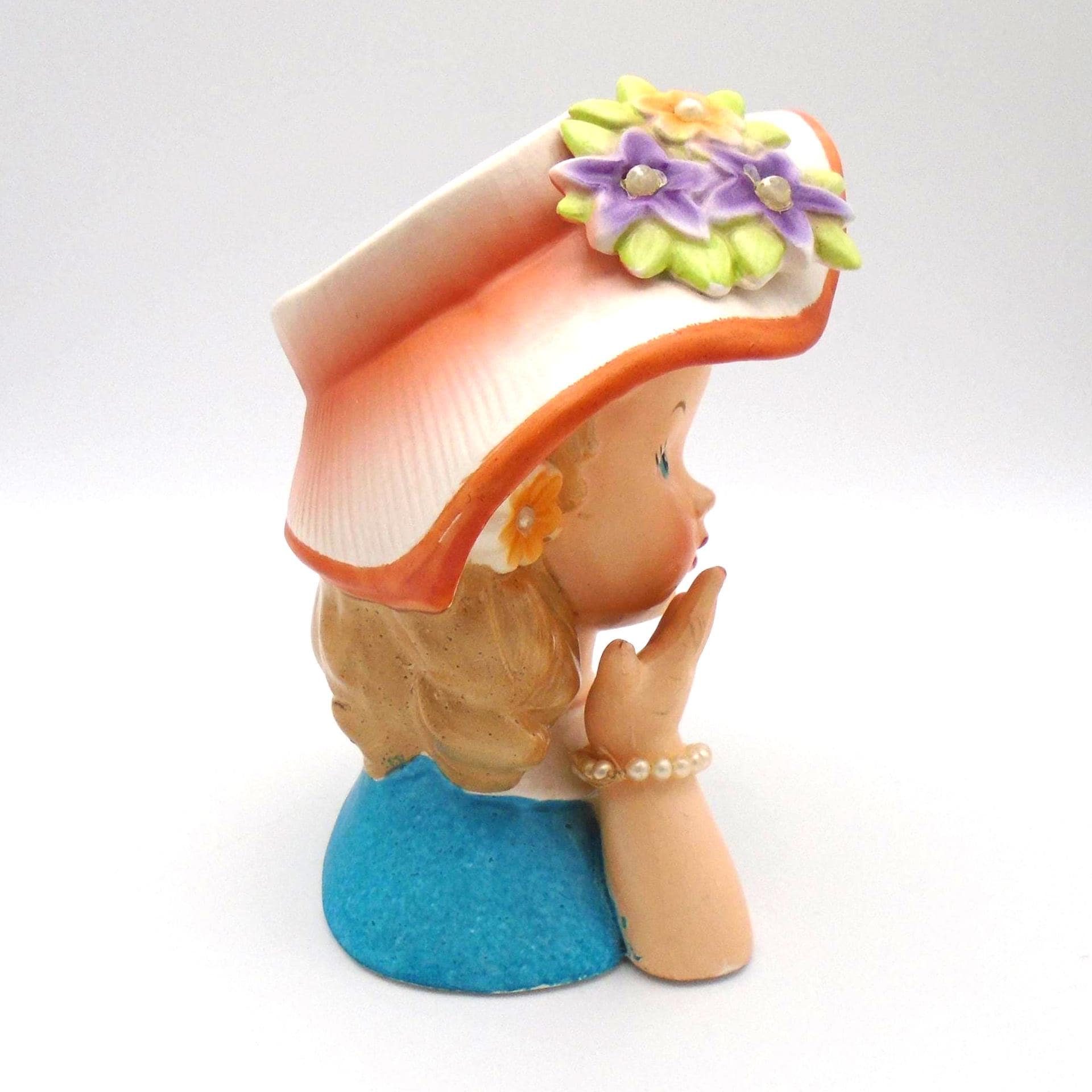 Vintage 1950s-60s, Girl wearing Hat with Flowers Head Vase, Nippon Yoko Book Co, Japan. A great addition for the collector, or as MCM decor for a retro child's room. In excellent vintage condition with no chips, or repairs. Minor crazing and some scuffs from wear from use, inside is very clean. Any imperfections seen are from the manufacturing process. With original faux pearl bracelet.