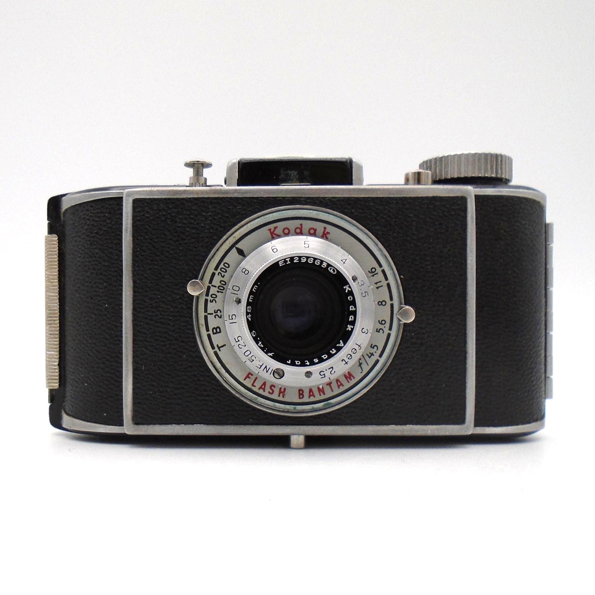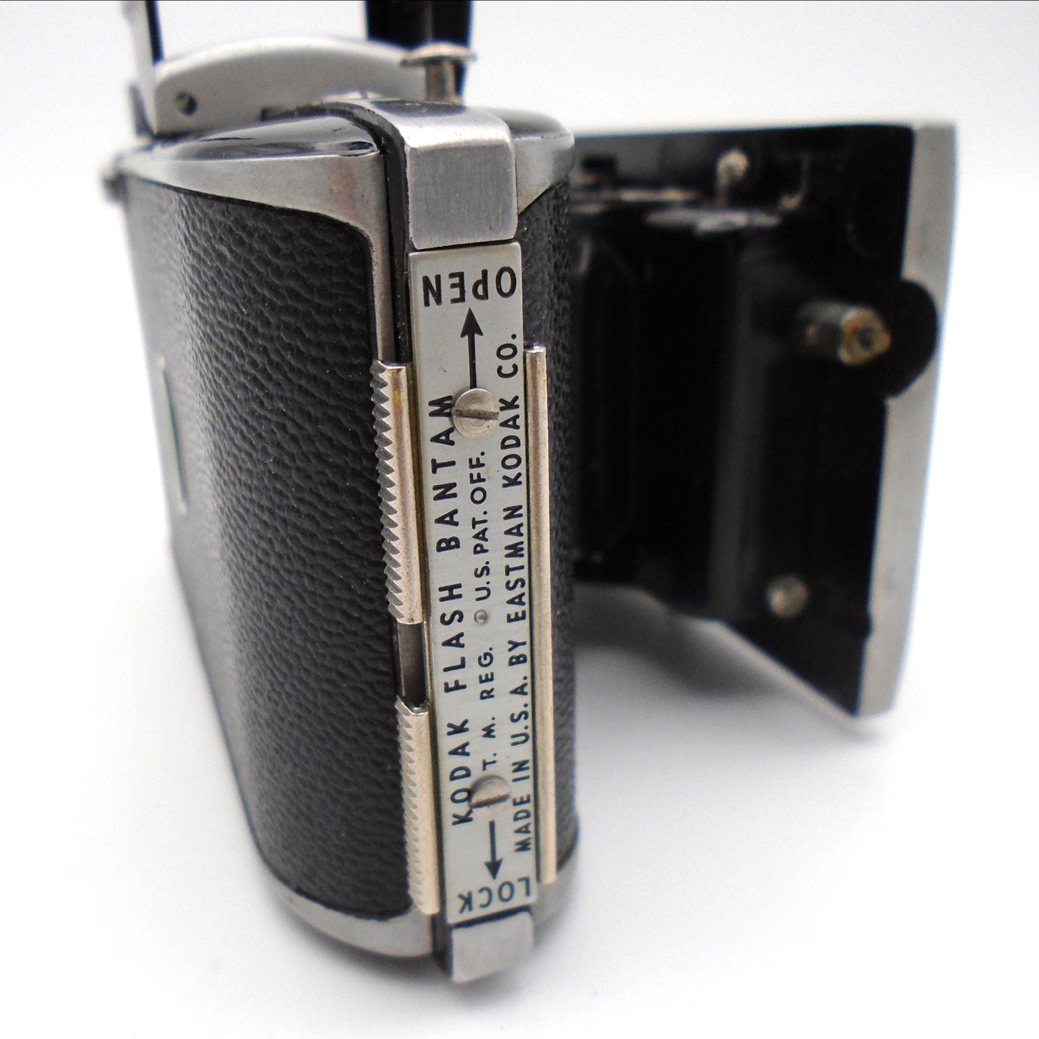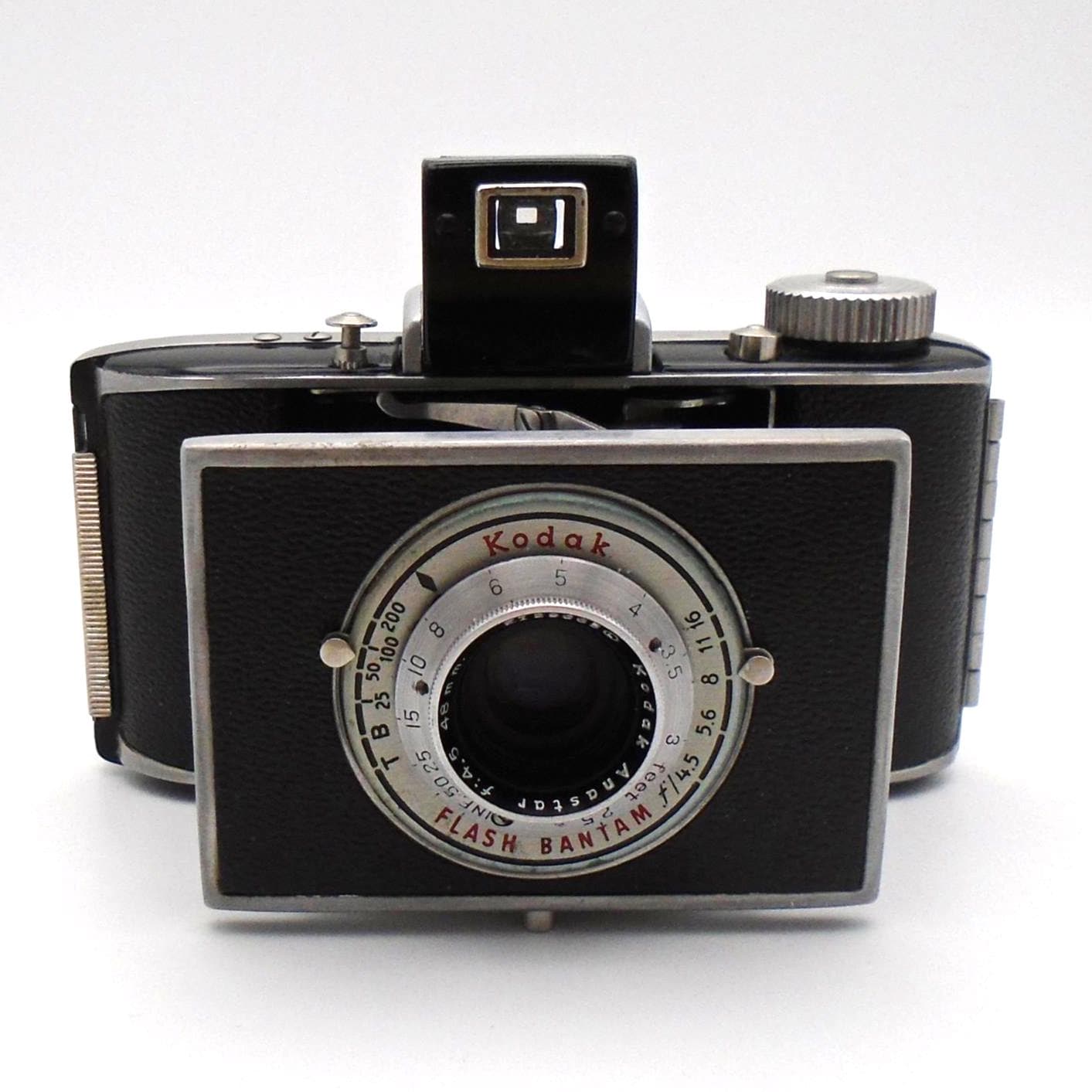 This late 1940's to early 1950's Kodak Flash Bantam is a vintage folding camera designed to use 828 roll film. In excellent vintage condition, minor wear from age. Shutter fires, bellows intact and the camera is clean. Comes in the original box (with scuffs) with manual (see pics) and leather case with strap.