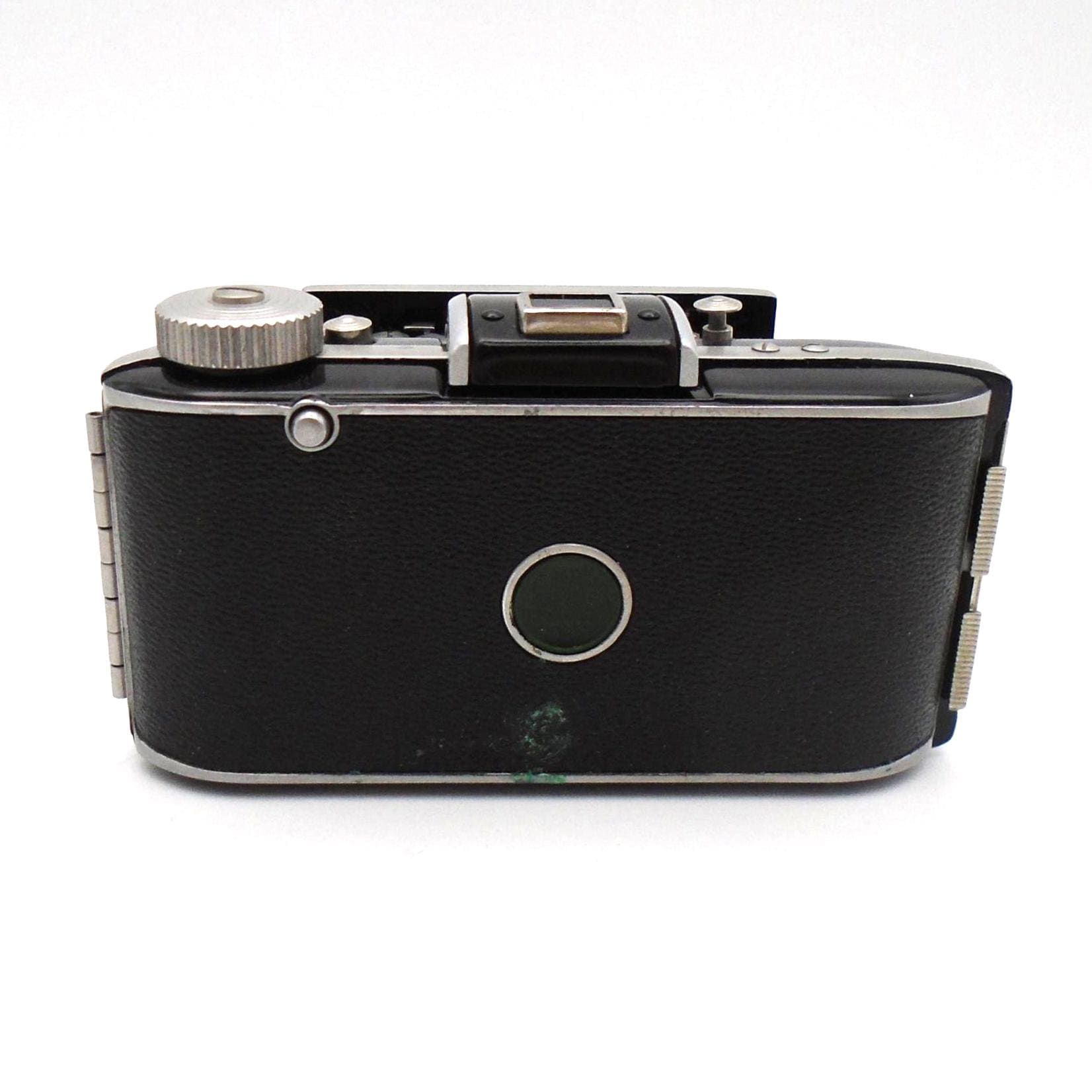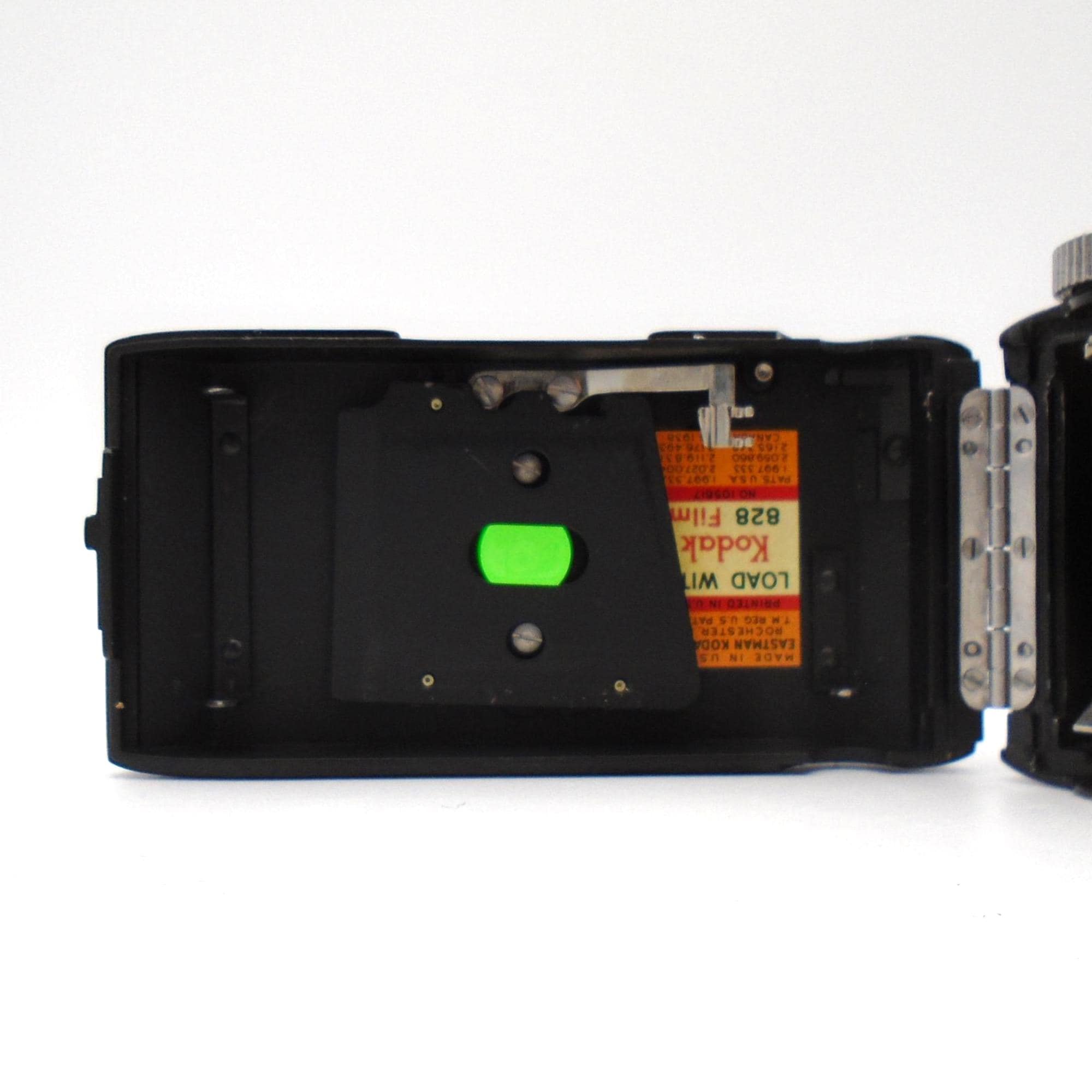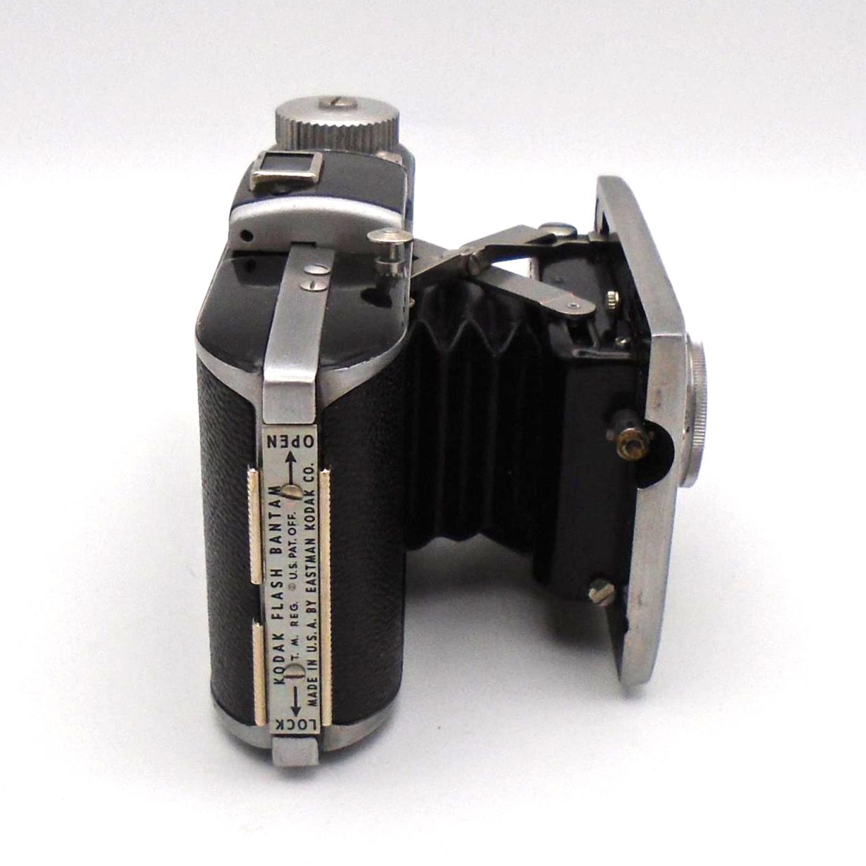 This late 1940's to early 1950's Kodak Flash Bantam is a vintage folding camera designed to use 828 roll film. In excellent vintage condition, minor wear from age. Shutter fires, bellows intact and the camera is clean. Comes in the original box (with scuffs) with manual (see pics) and leather case with strap.