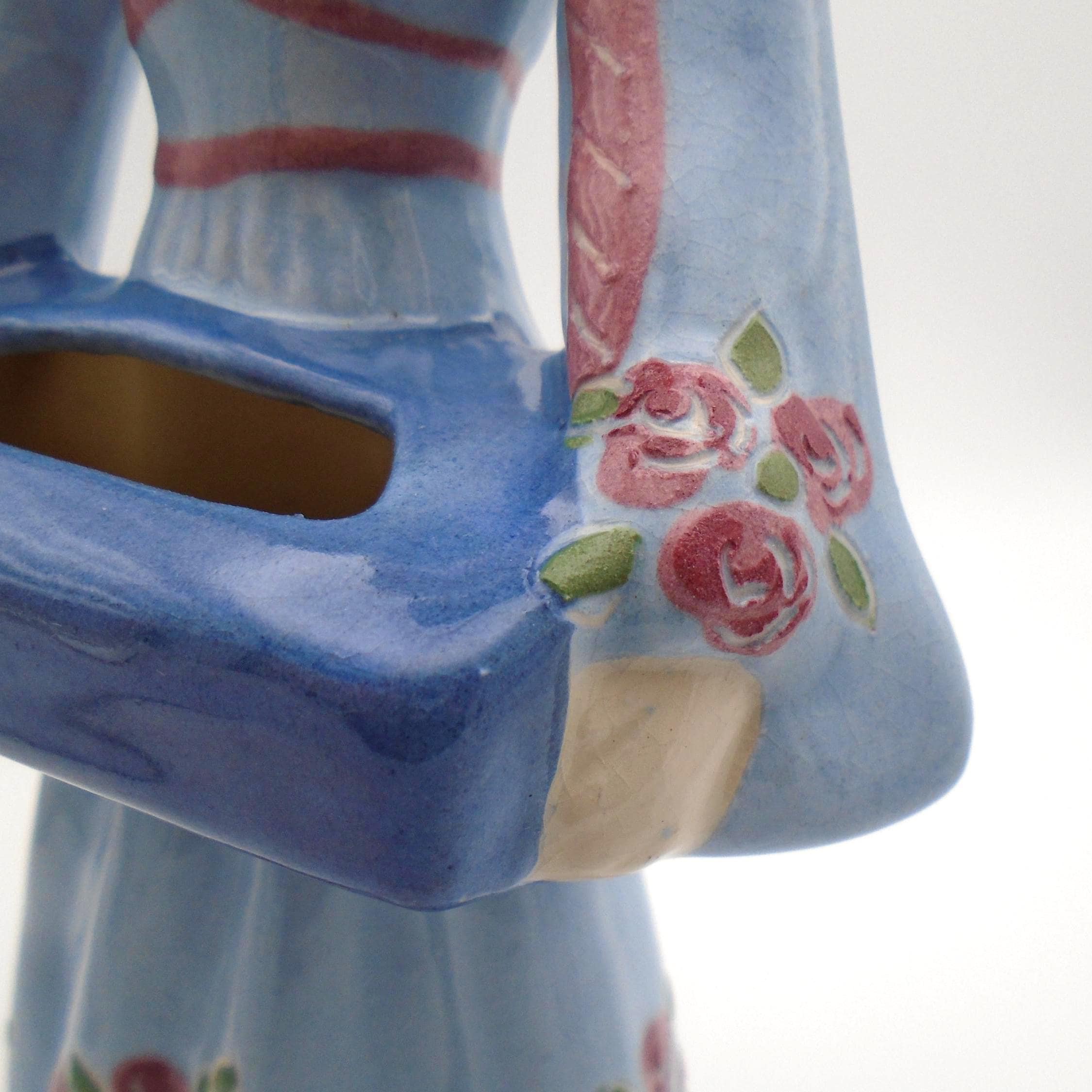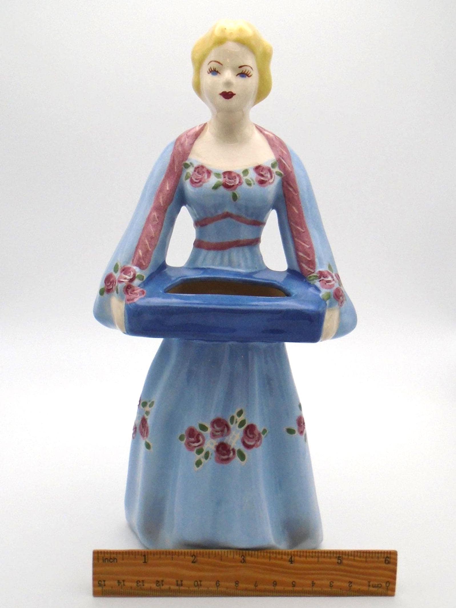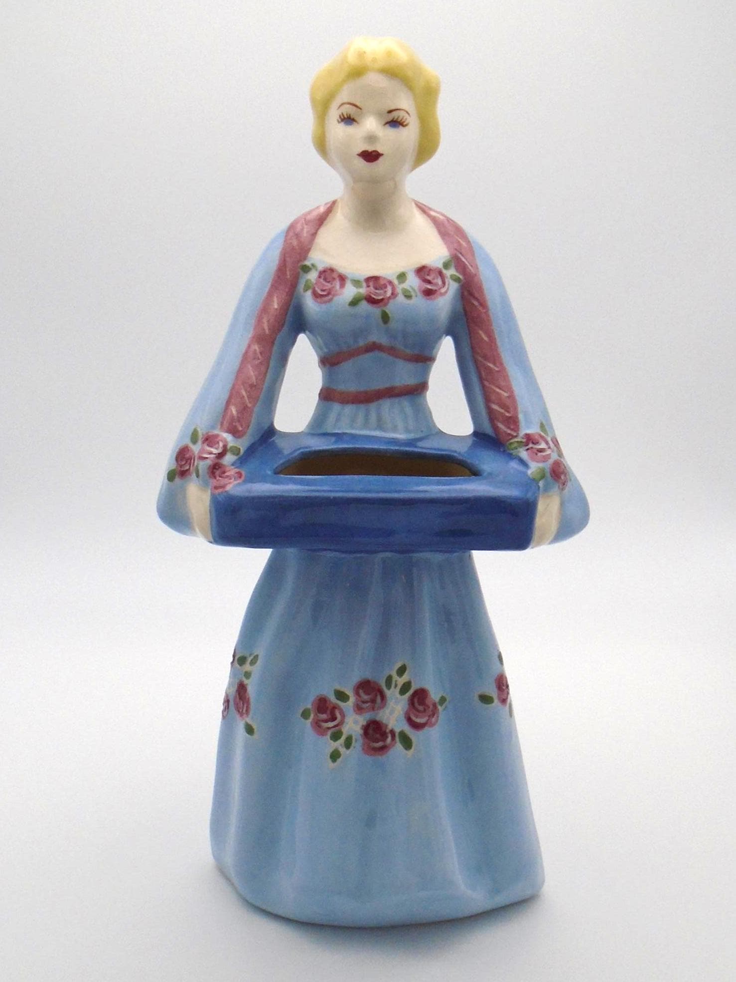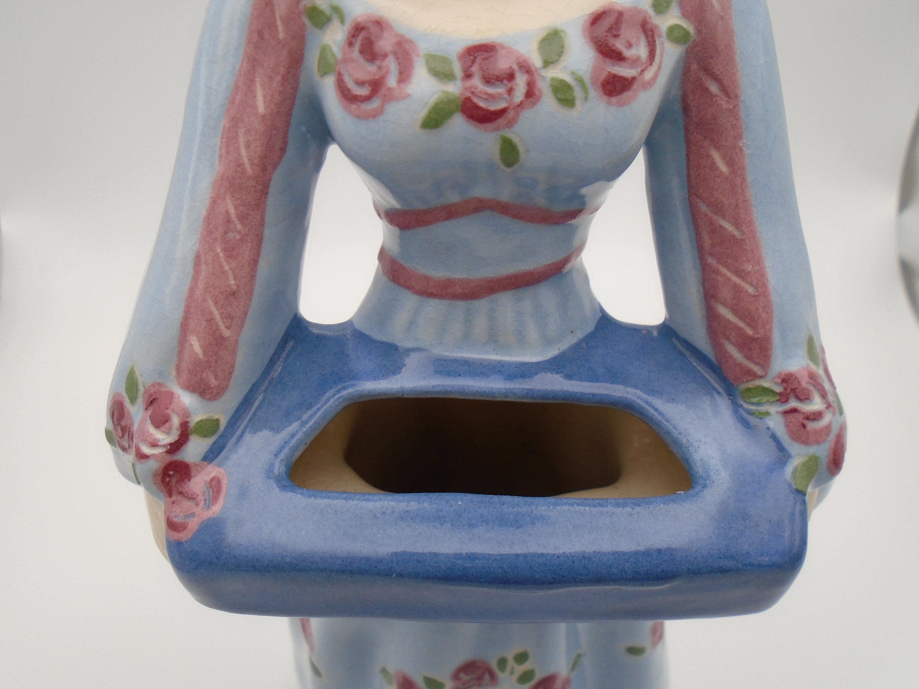 True MCM California Pottery attributed to Weil Ware/Kaye of Hollywood, this figural Lady planter/vase is marked "3052" on the bottom, Featuring a light blue dress with pink rose accents holding an open blue tray/basket for plants or flowers. Great accent for mid-century decor,