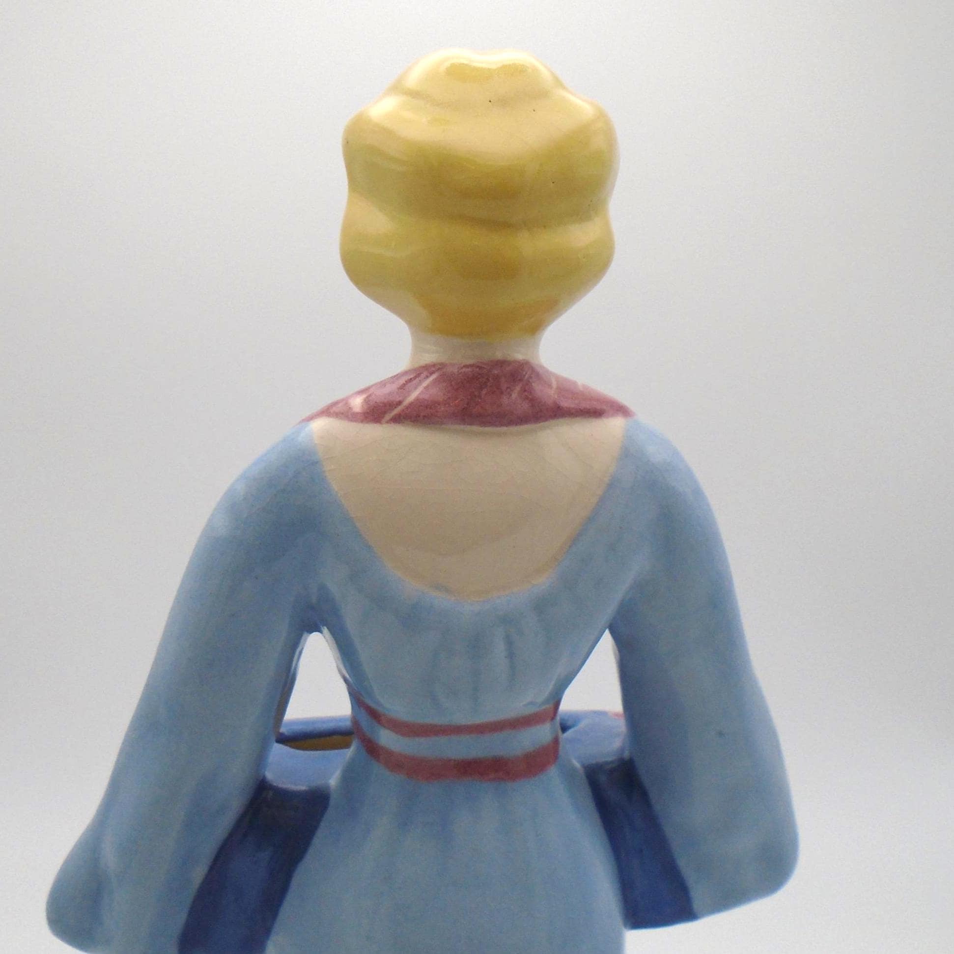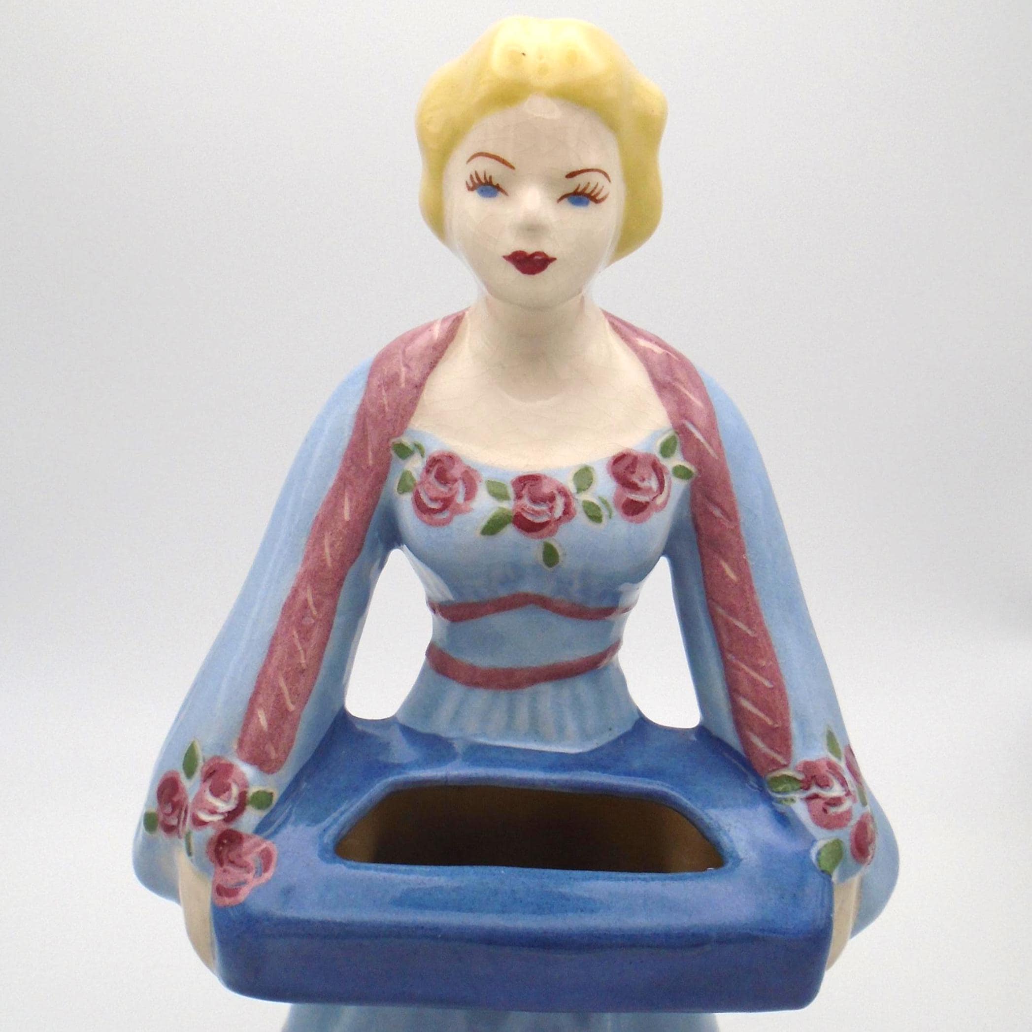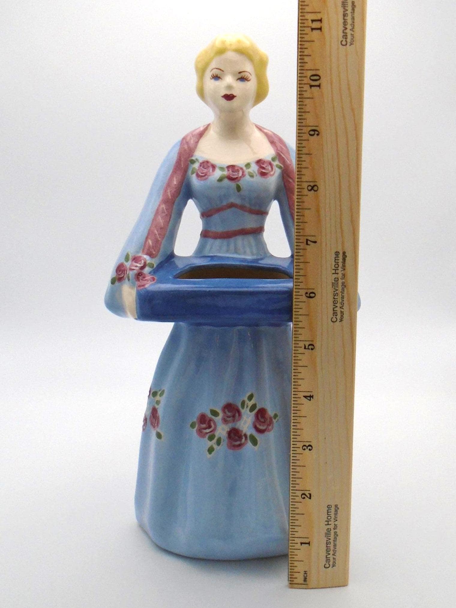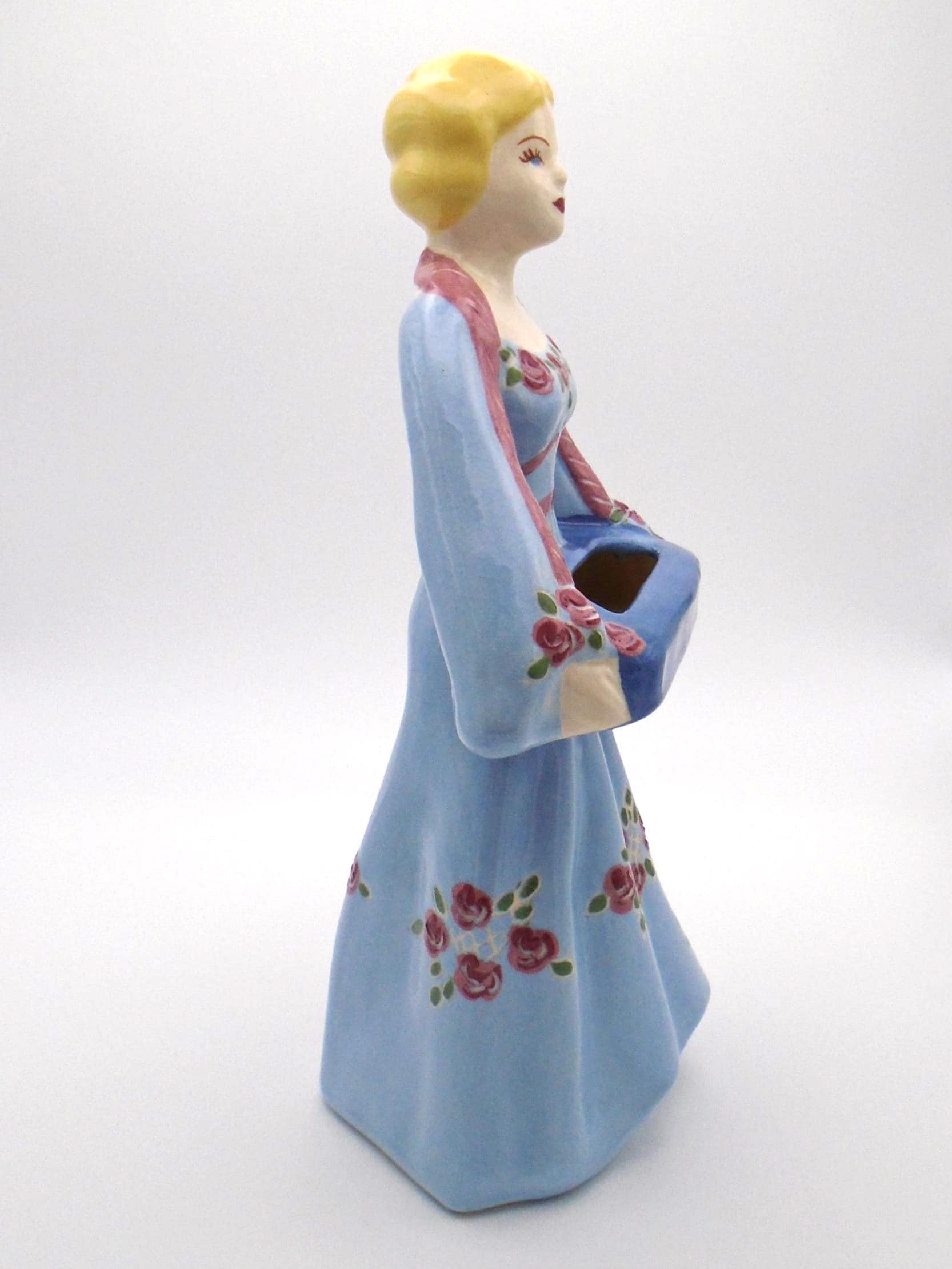 True MCM California Pottery attributed to Weil Ware/Kaye of Hollywood, this figural Lady planter/vase is marked "3052" on the bottom, Featuring a light blue dress with pink rose accents holding an open blue tray/basket for plants or flowers. Great accent for mid-century decor,
