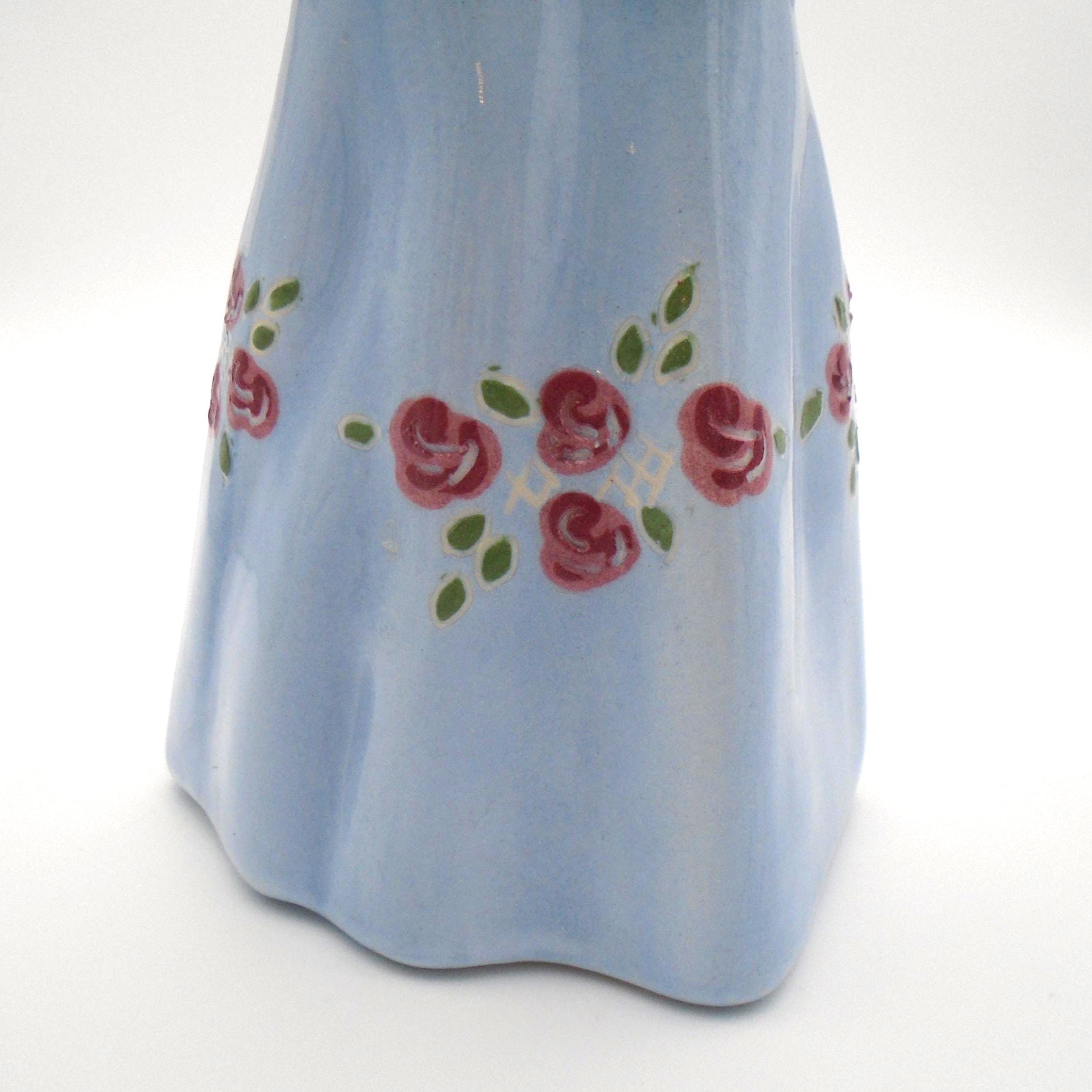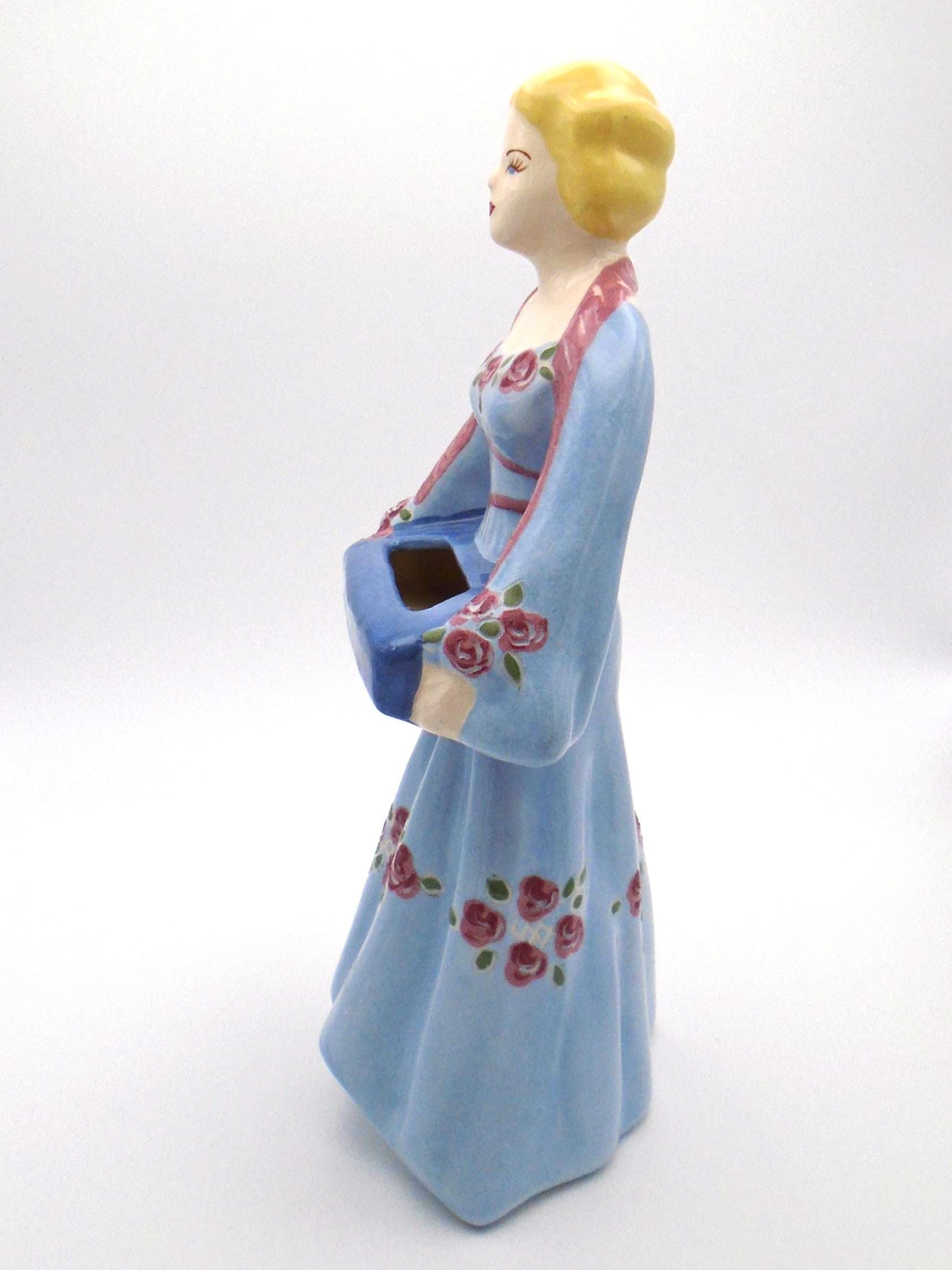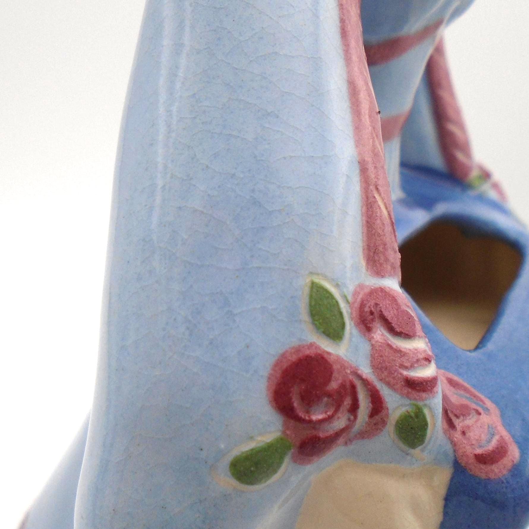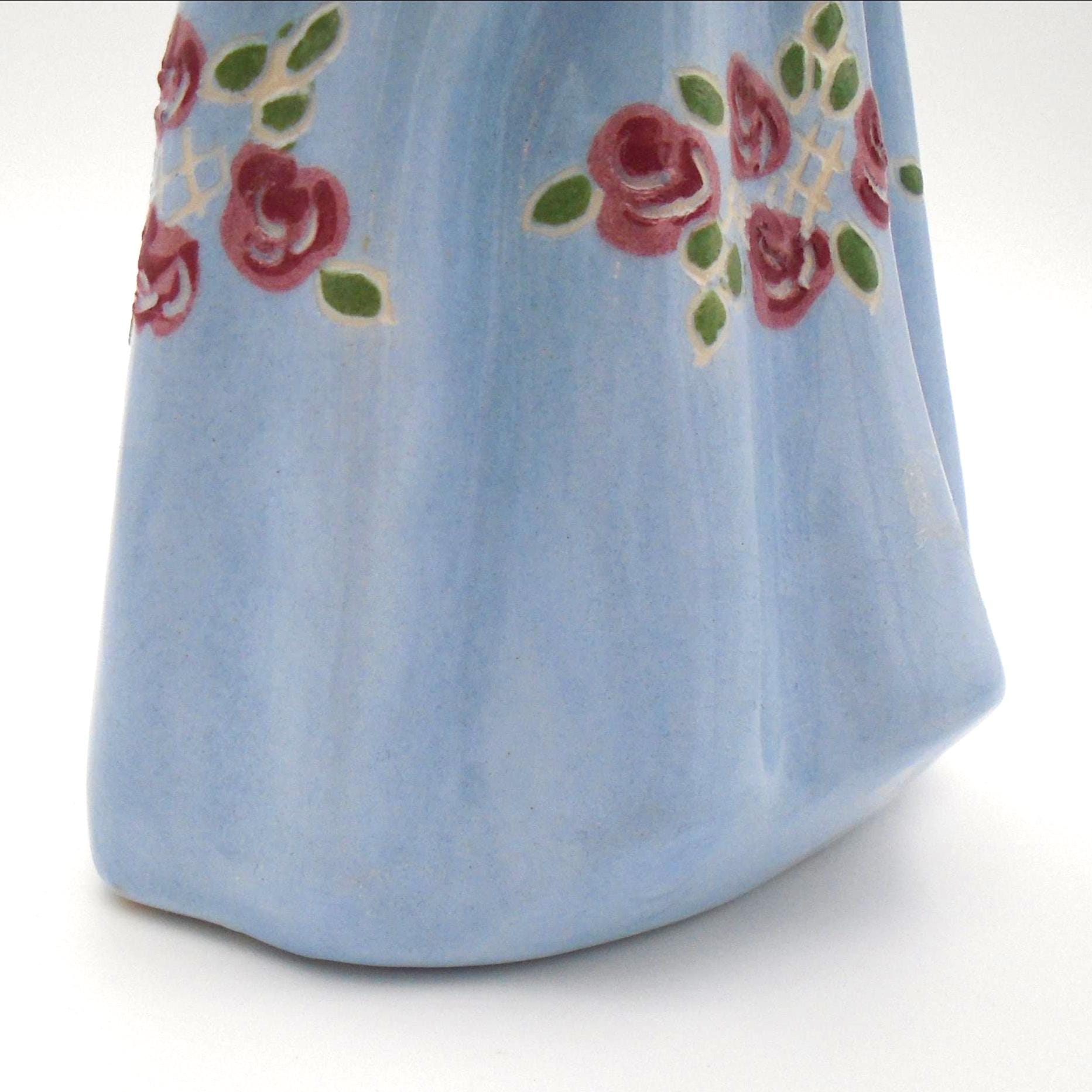 True MCM California Pottery attributed to Weil Ware/Kaye of Hollywood, this figural Lady planter/vase is marked "3052" on the bottom, Featuring a light blue dress with pink rose accents holding an open blue tray/basket for plants or flowers. Great accent for mid-century decor,