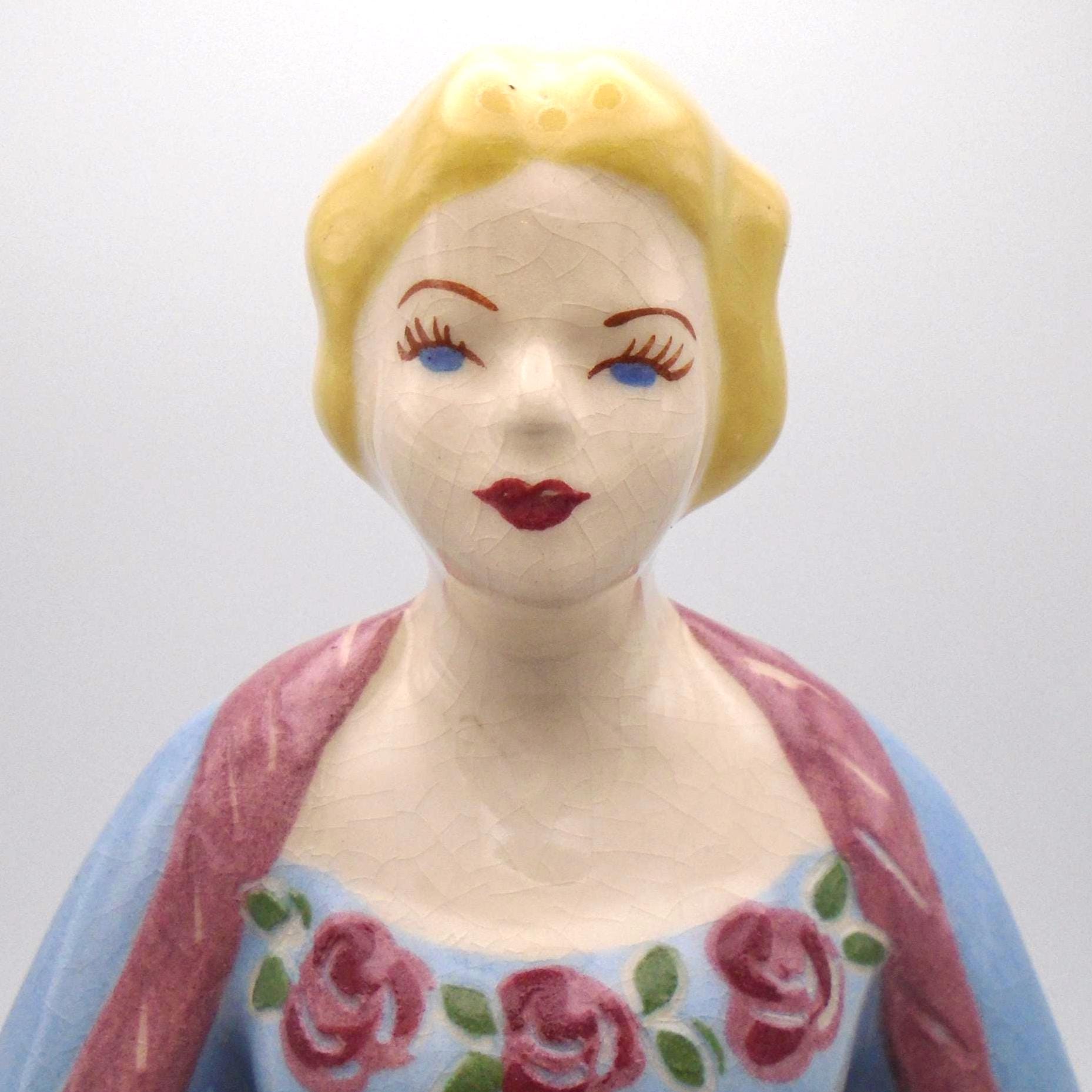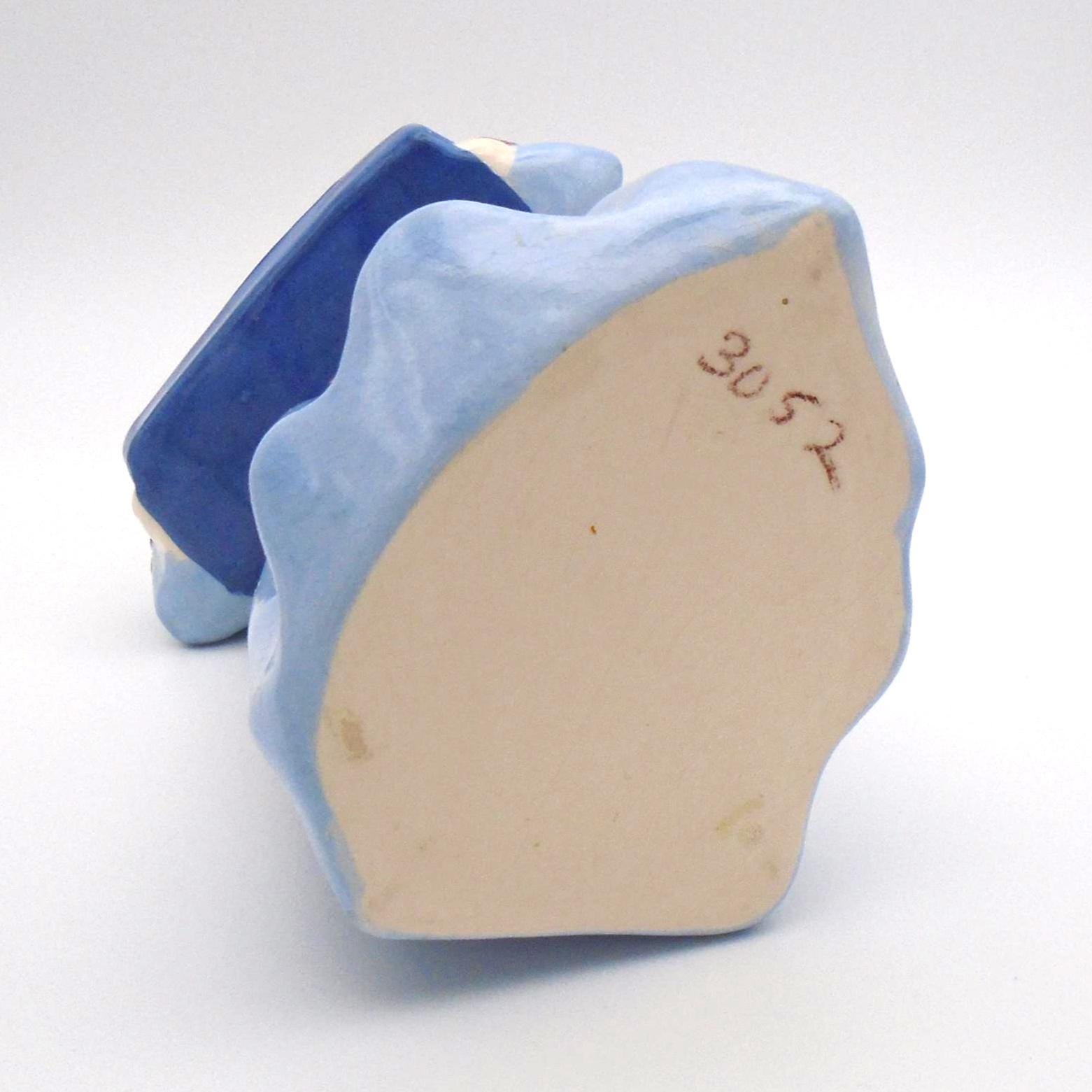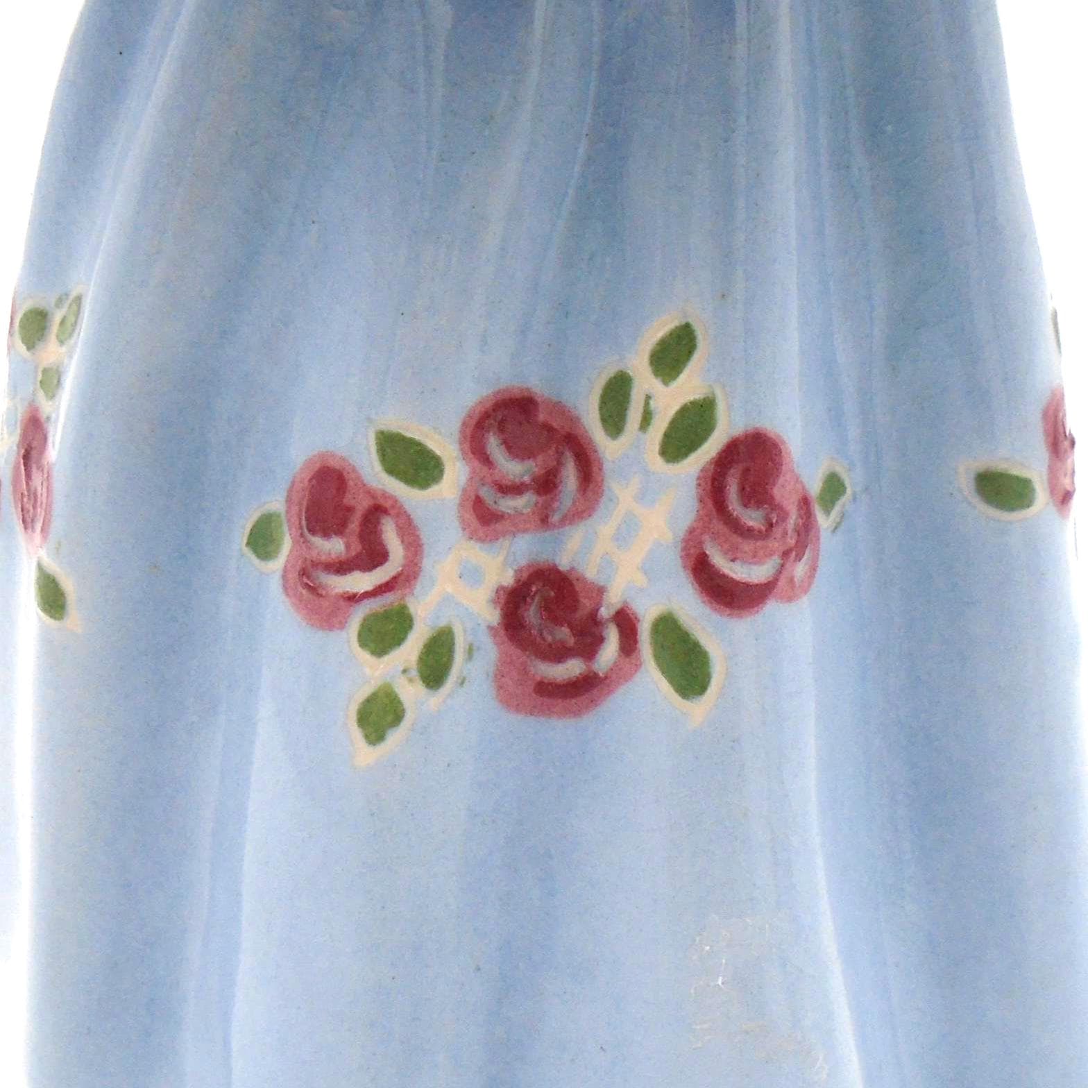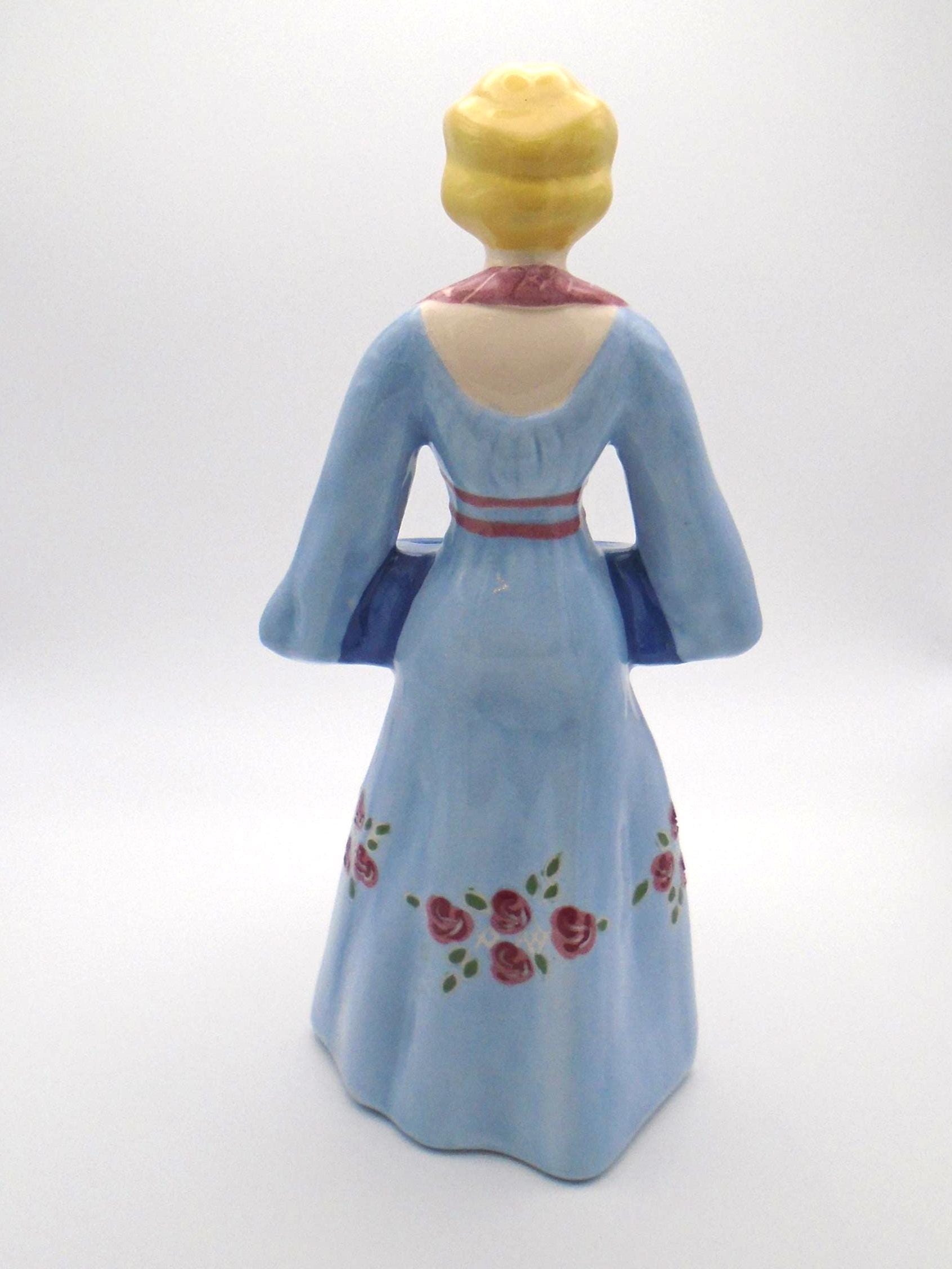 True MCM California Pottery attributed to Weil Ware/Kaye of Hollywood, this figural Lady planter/vase is marked "3052" on the bottom, Featuring a light blue dress with pink rose accents holding an open blue tray/basket for plants or flowers. Great accent for mid-century decor,