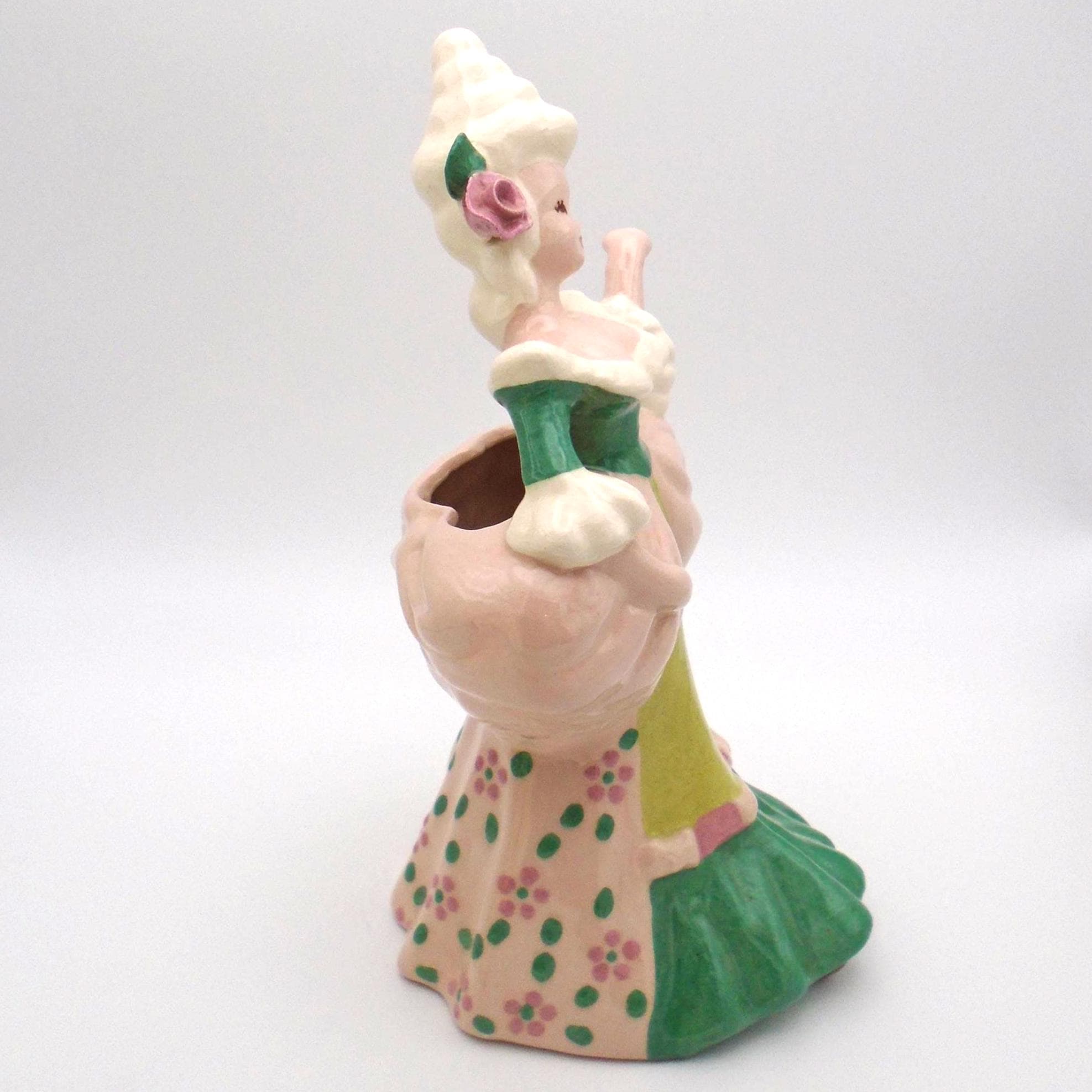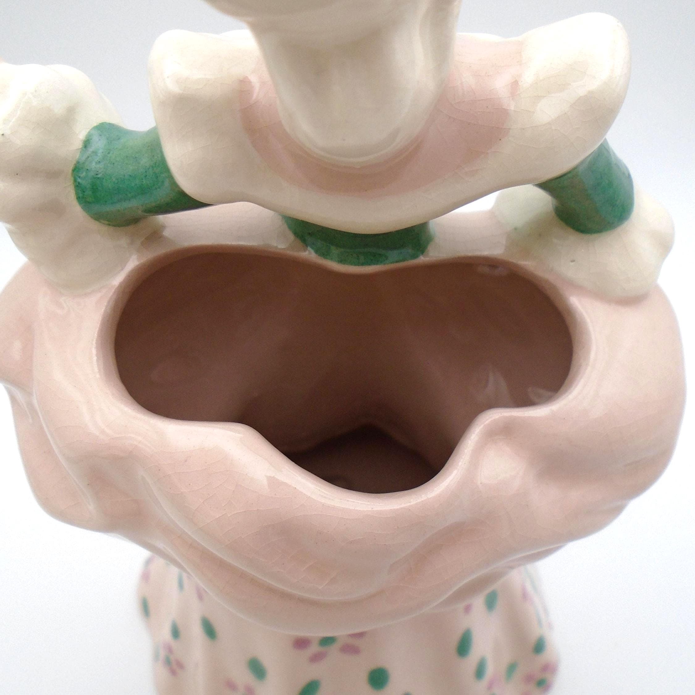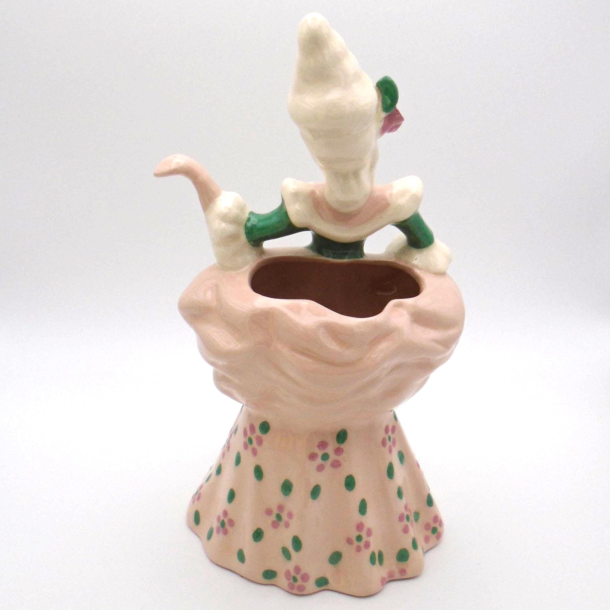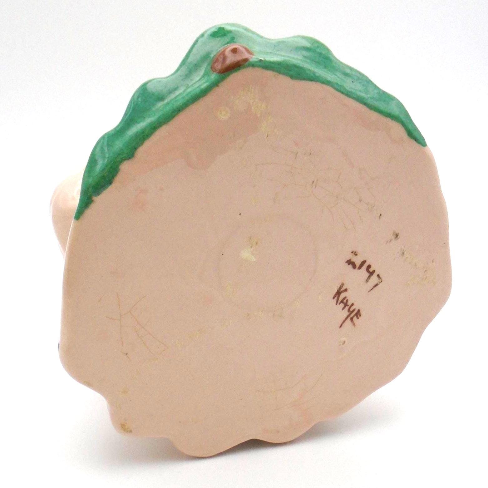 True MCM California Pottery attributed to Kaye of Hollywood, this figural Lady planter/vase is marked on the bottom "2147 and Kaye". Featuring pinks and greens and a pink rose over the ear. Opening in back for plants or flowers. Great accent for mid-century decor.