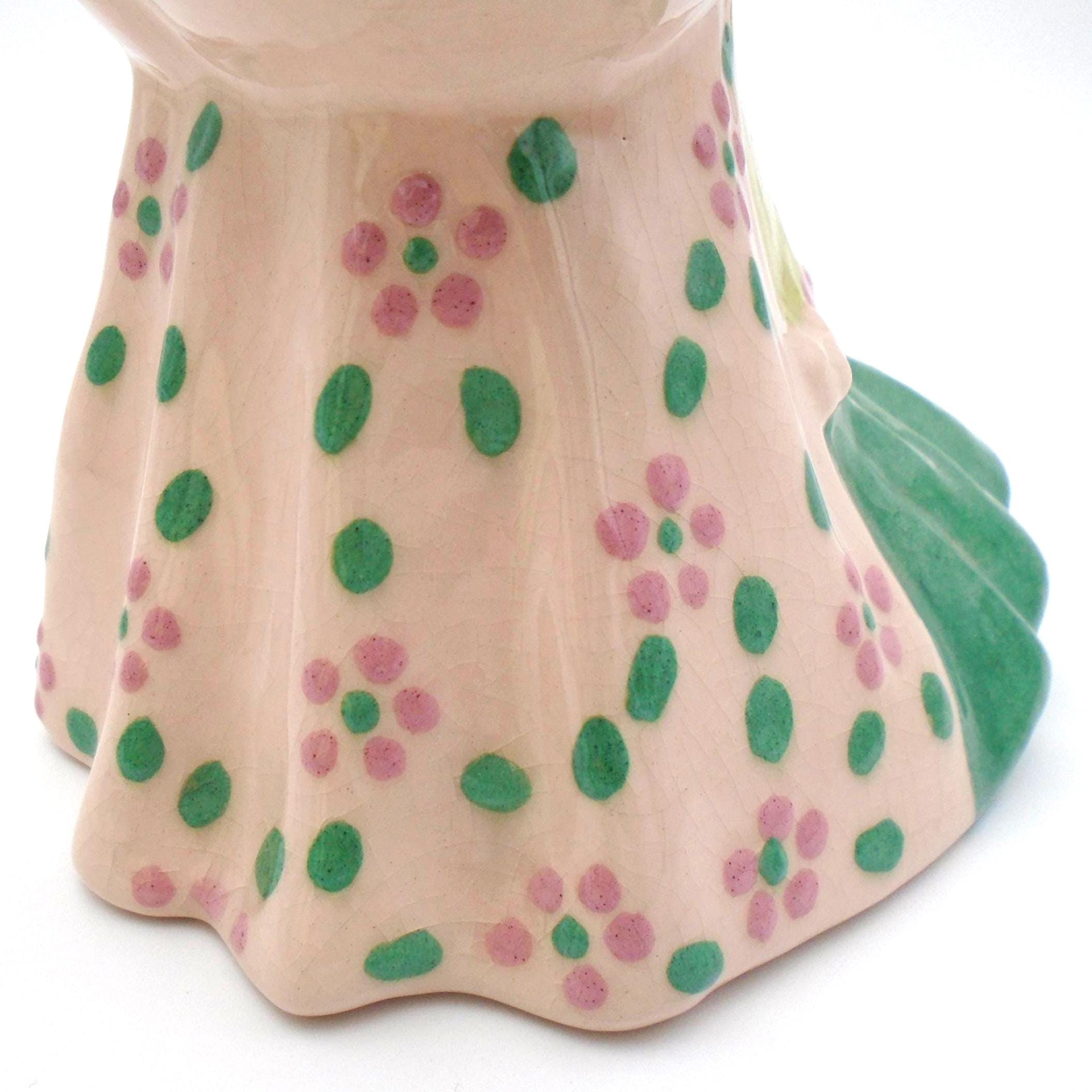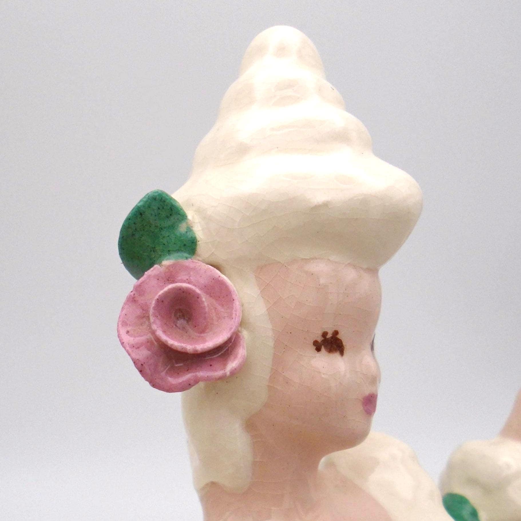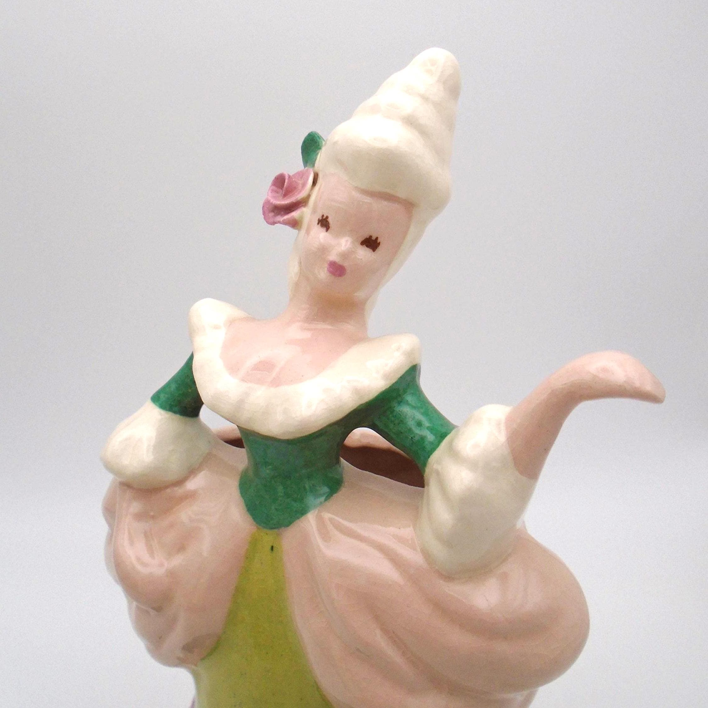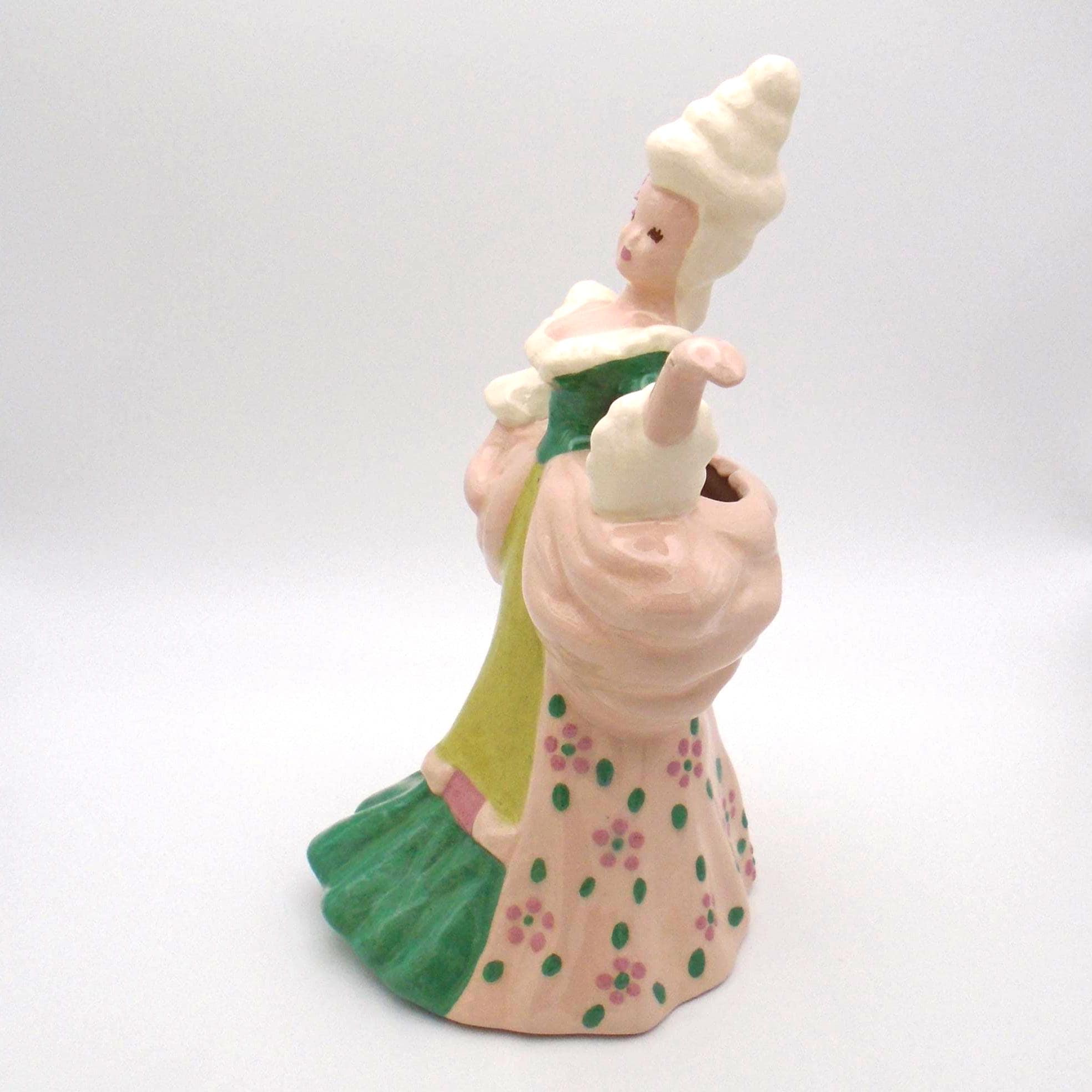 True MCM California Pottery attributed to Kaye of Hollywood, this figural Lady planter/vase is marked on the bottom "2147 and Kaye". Featuring pinks and greens and a pink rose over the ear. Opening in back for plants or flowers. Great accent for mid-century decor.