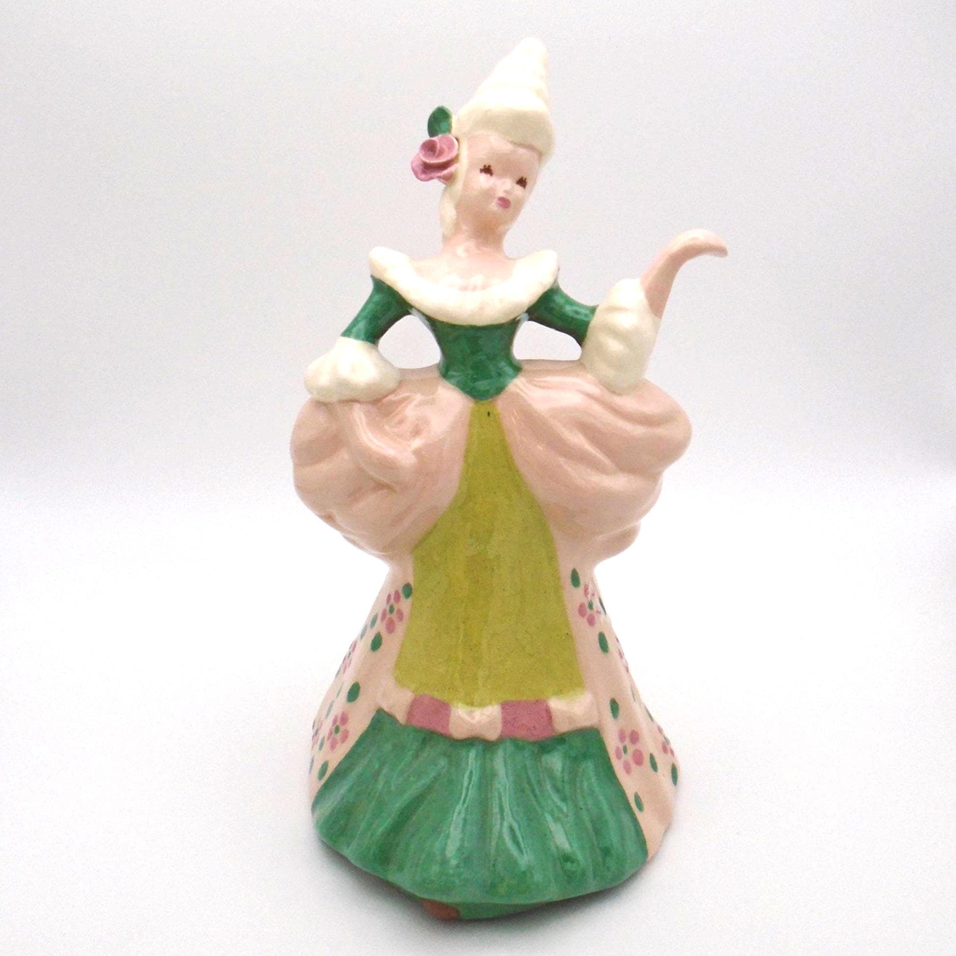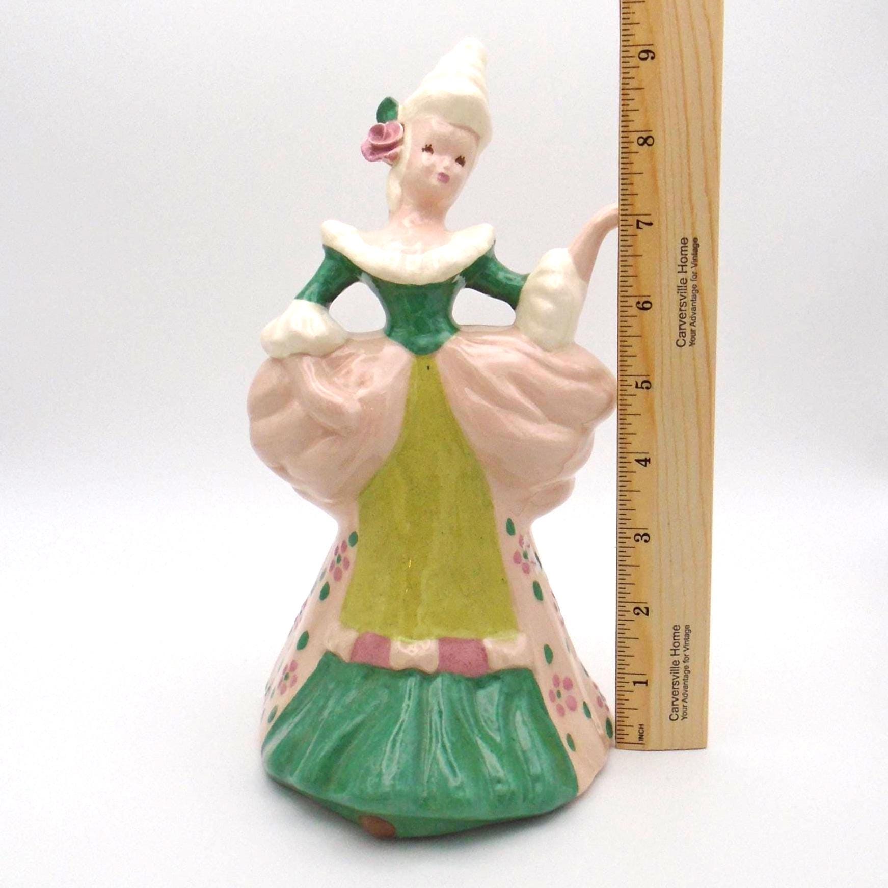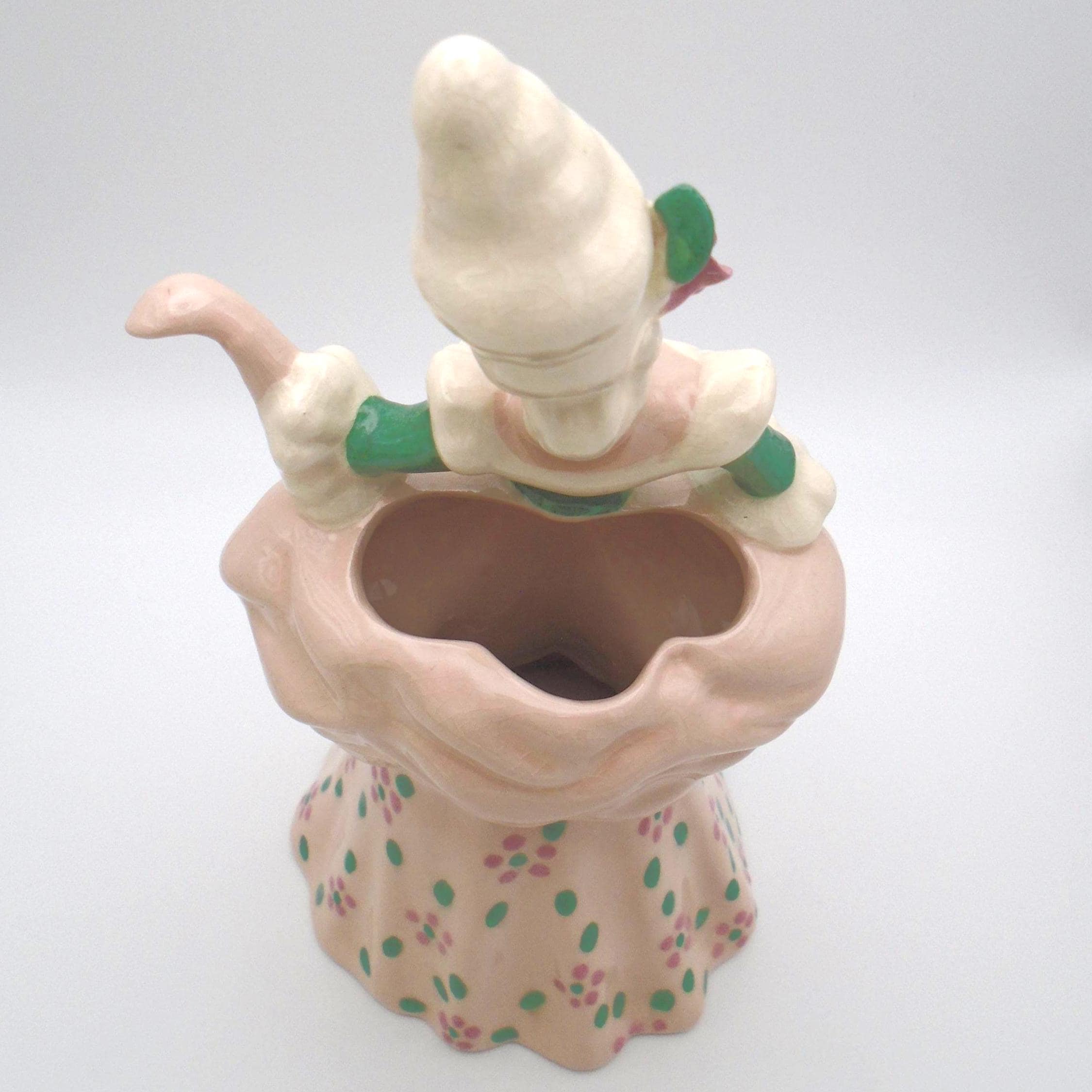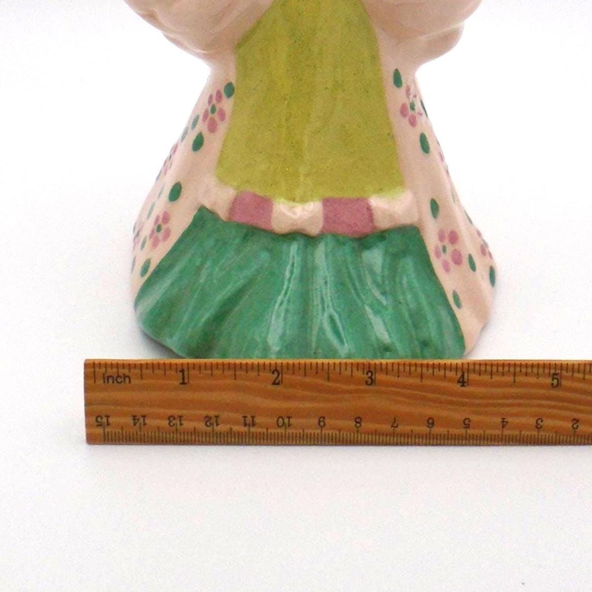 True MCM California Pottery attributed to Kaye of Hollywood, this figural Lady planter/vase is marked on the bottom "2147 and Kaye". Featuring pinks and greens and a pink rose over the ear. Opening in back for plants or flowers. Great accent for mid-century decor.