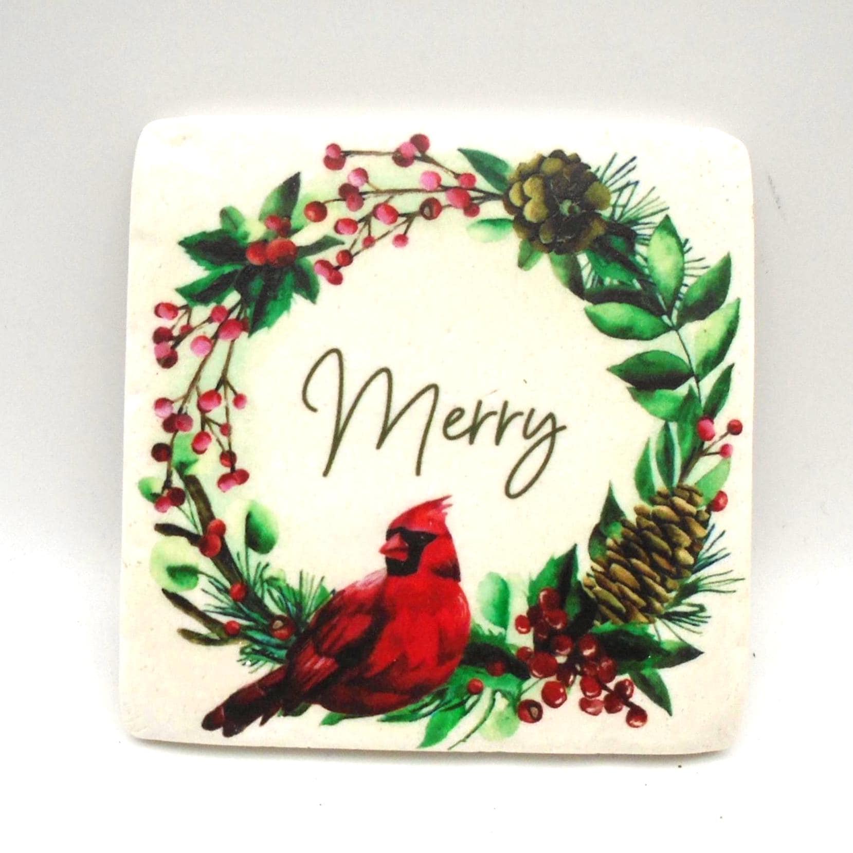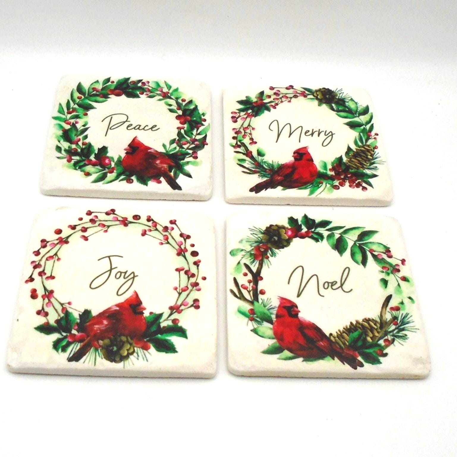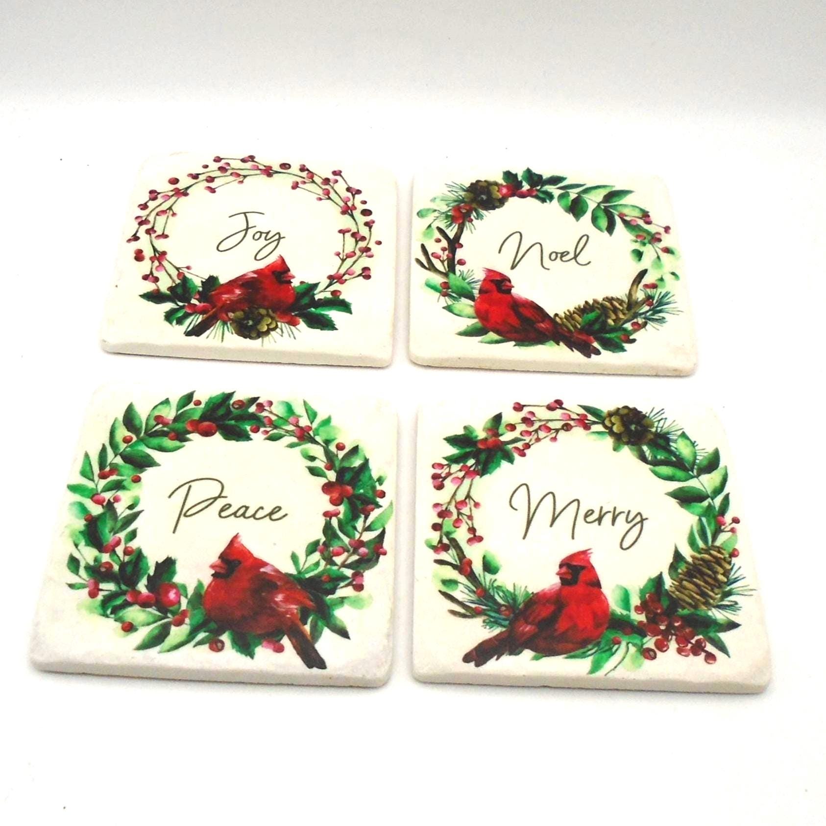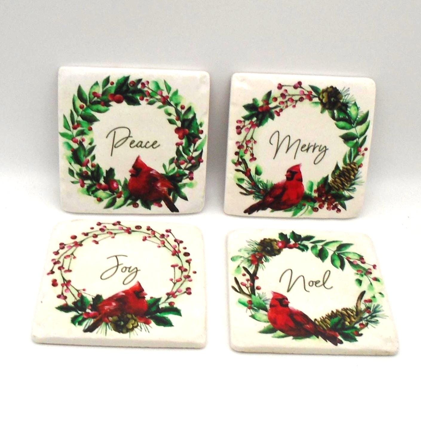 This set of 4 vintage Christmas coasters are simply fun and festive. From Midwest of Cannon Falls, these coasters are a great accent for your holiday table. They measure approximately 4" in diameter and features 4 different designs. Each design contains a single cardinal on a wreath. They were designed with tumbled edges and a cork back.
