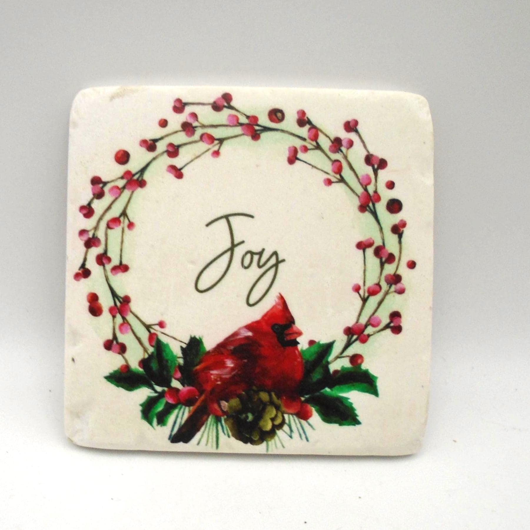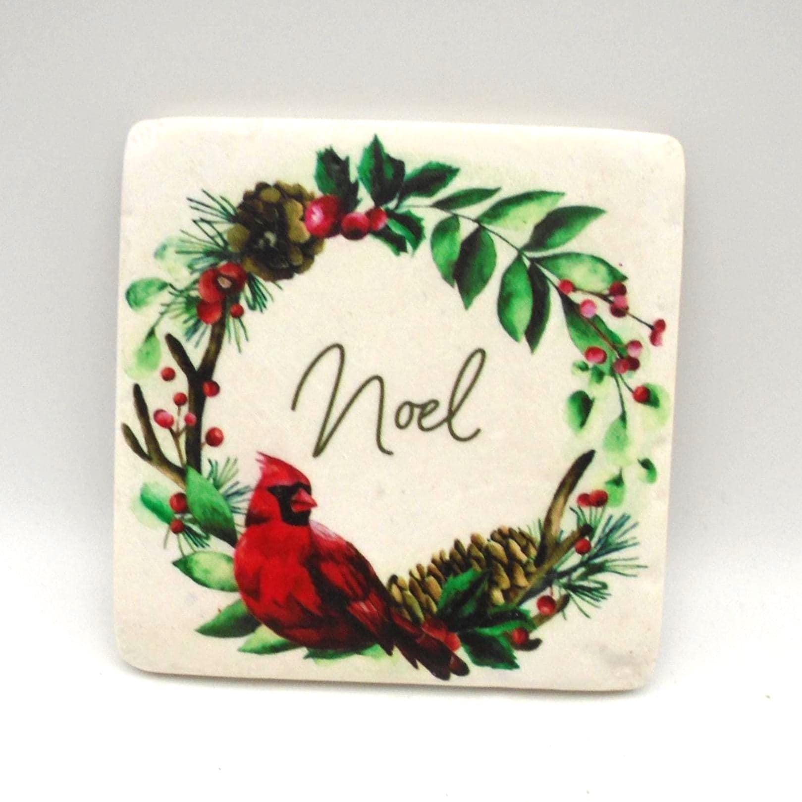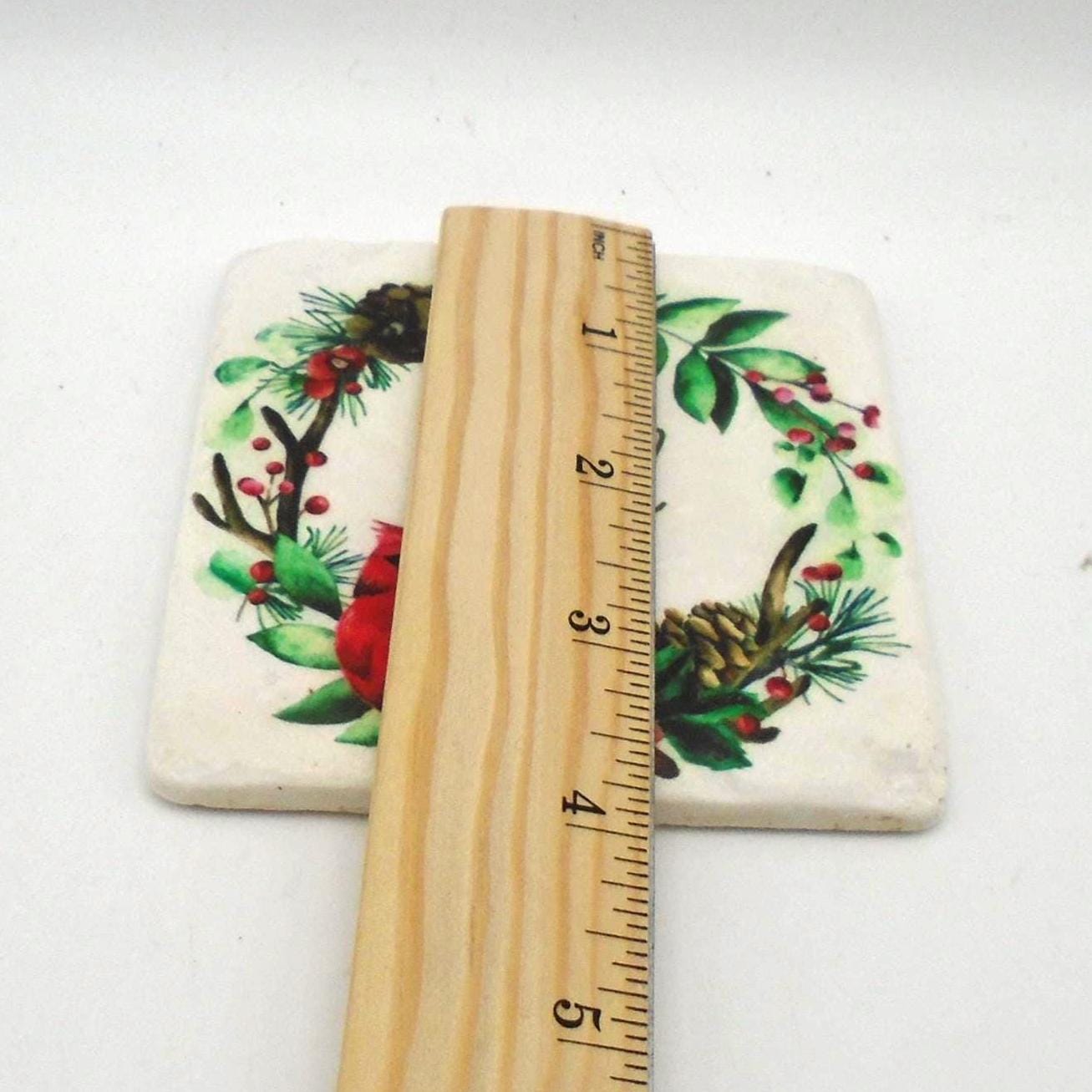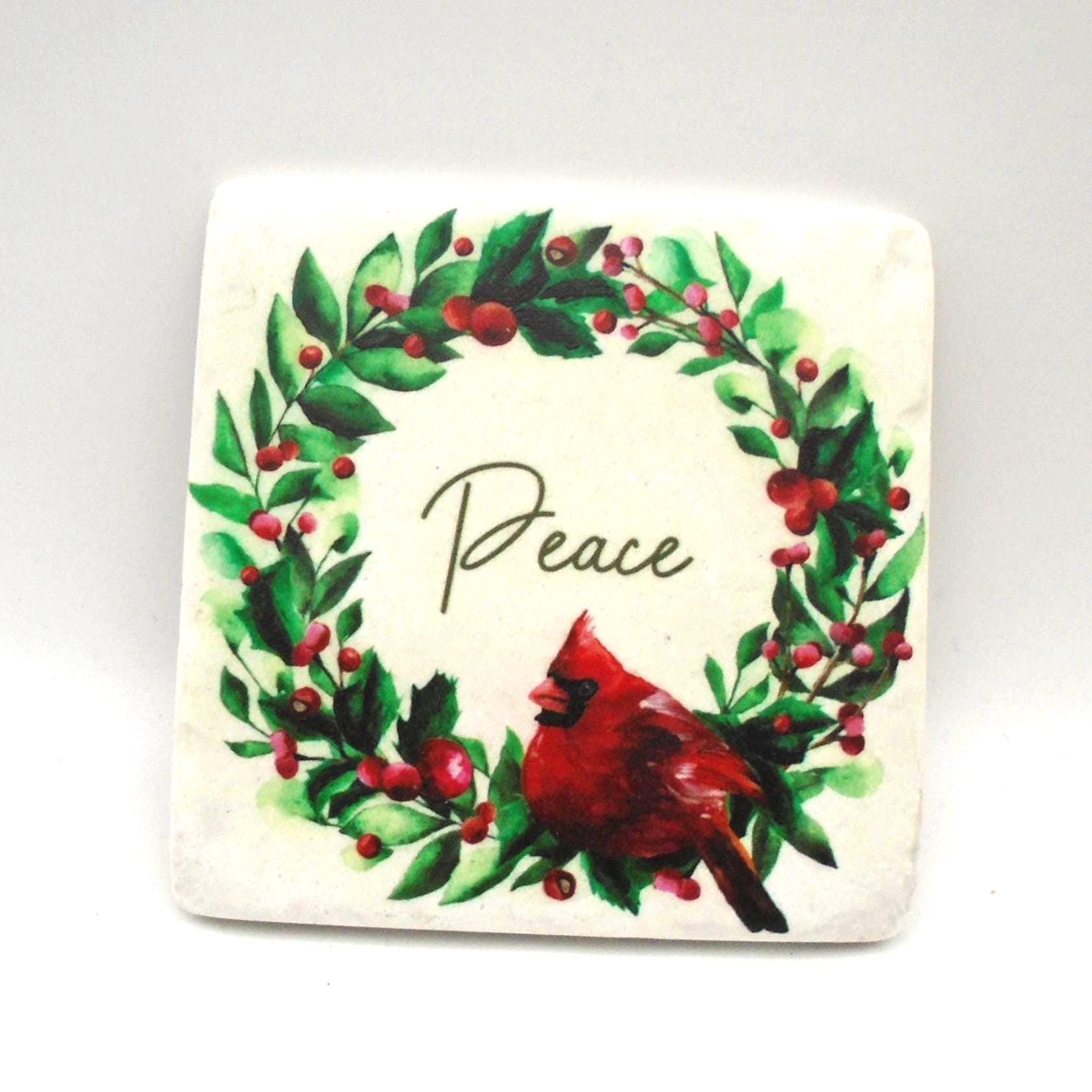 This set of 4 vintage Christmas coasters are simply fun and festive. From Midwest of Cannon Falls, these coasters are a great accent for your holiday table. They measure approximately 4" in diameter and features 4 different designs. Each design contains a single cardinal on a wreath. They were designed with tumbled edges and a cork back.