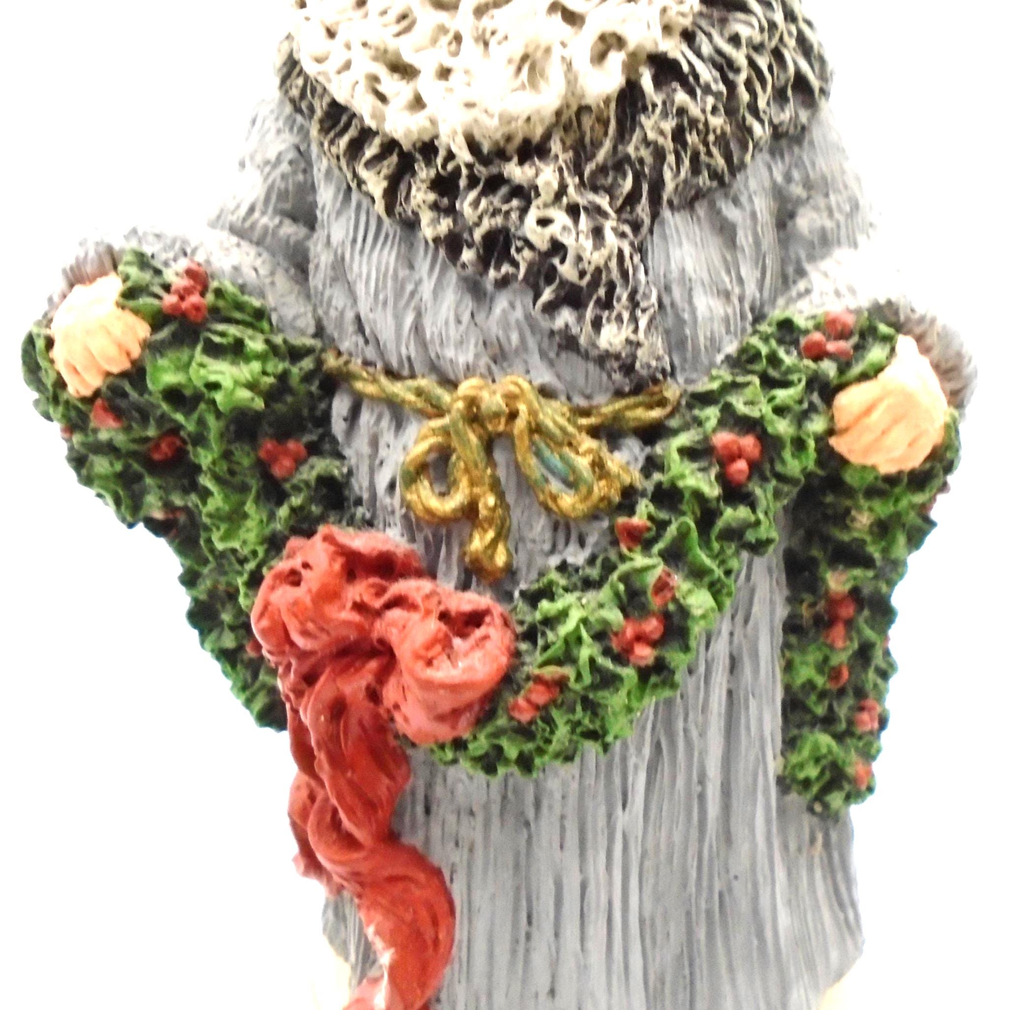 This vintage Santa Claus flat-back figurine is the "Deck the Halls" edition. He features a blue coat, and Christmas holly with berries, ribbons and a bow. It is a hand-painted, limited edition collectible, carved from resin. This Santa measures approximately 6-1/8" in height and is in very good vintage condition.