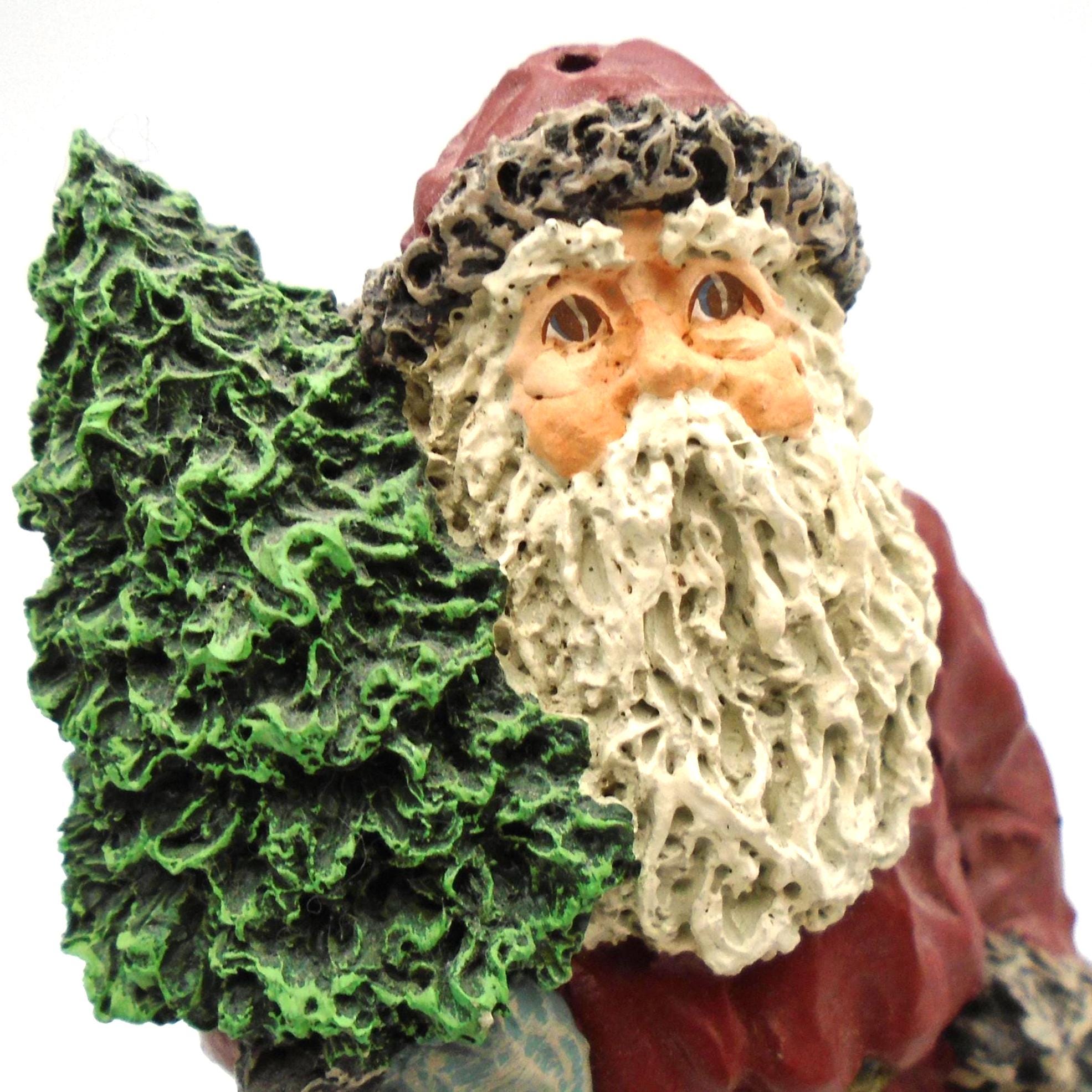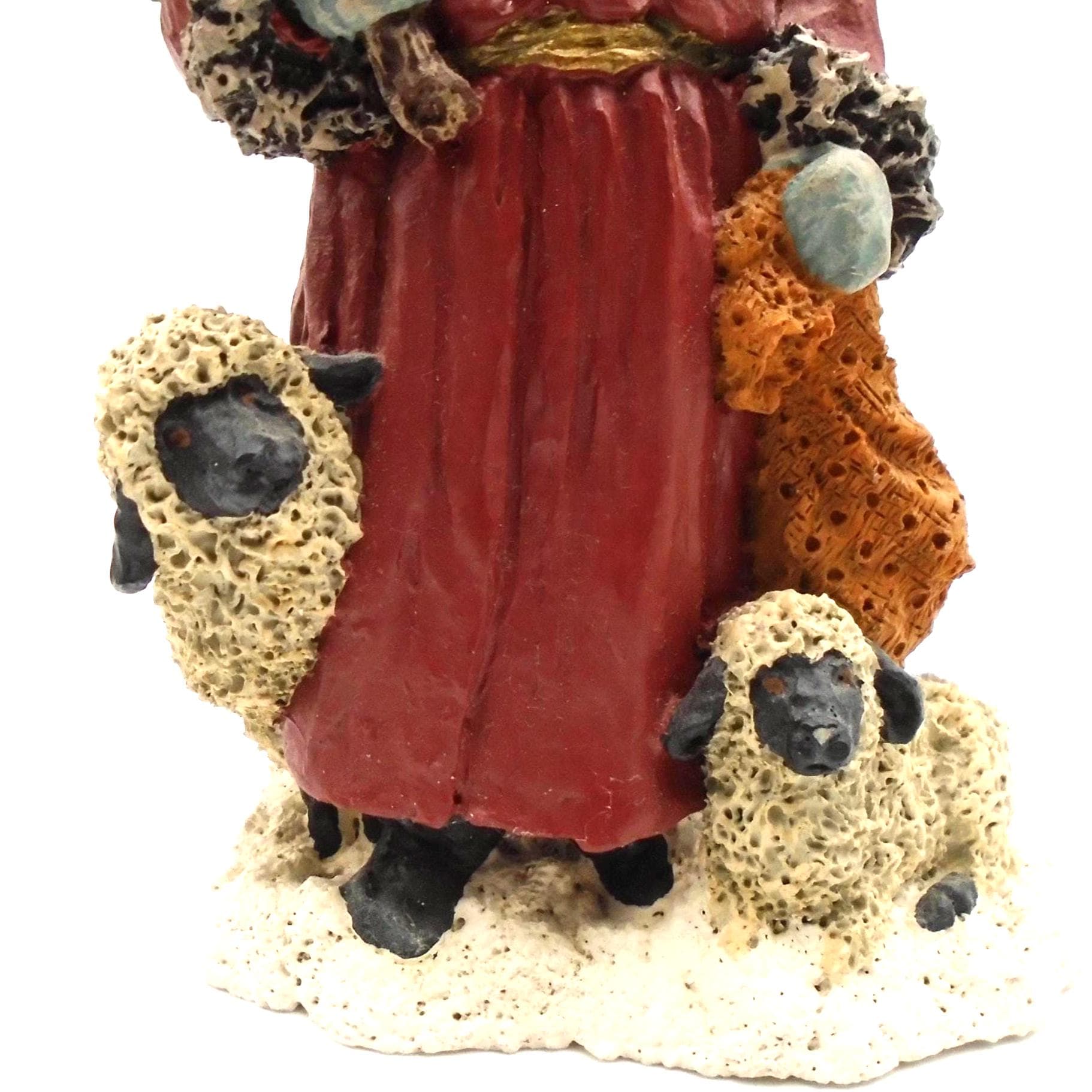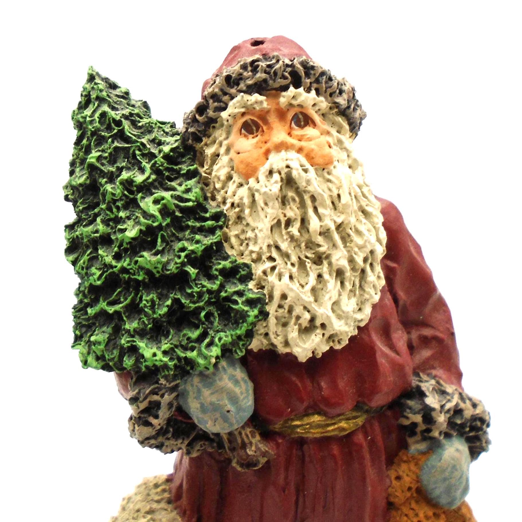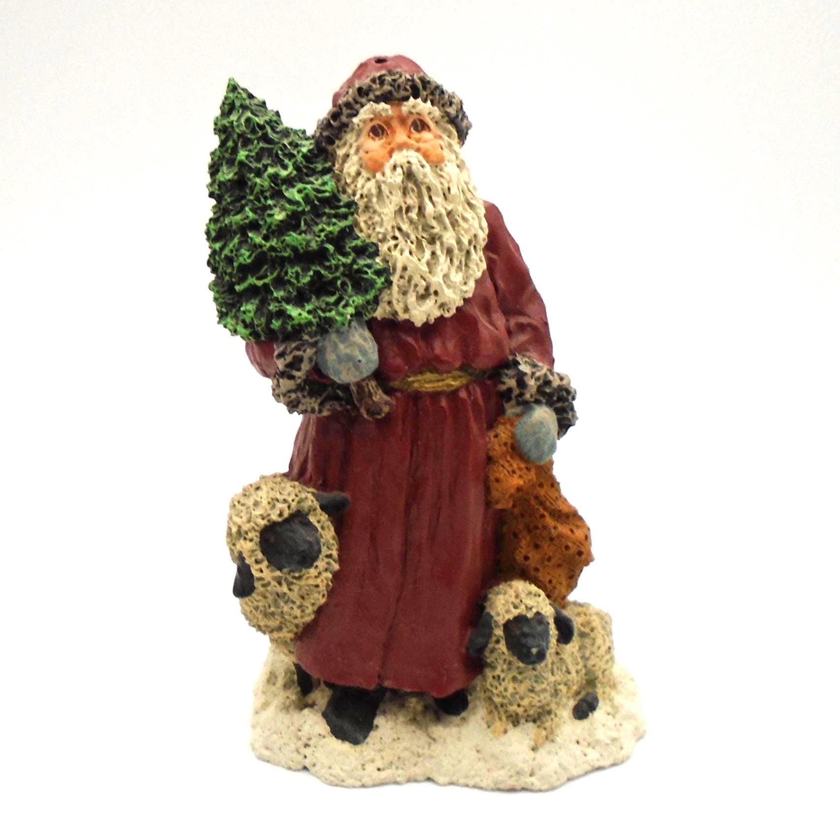 This vintage Santa Claus flat-back figurine is a Country Santa in a dark red robe, holding a small evergreen tree and a sack, with two sheep at his feet. It is a hand-painted collectible carved from resin. This Santa measures approximately 5-1/8" in height and is in very good vintage condition -- he also has a hole in the back for a string or wire to hang.