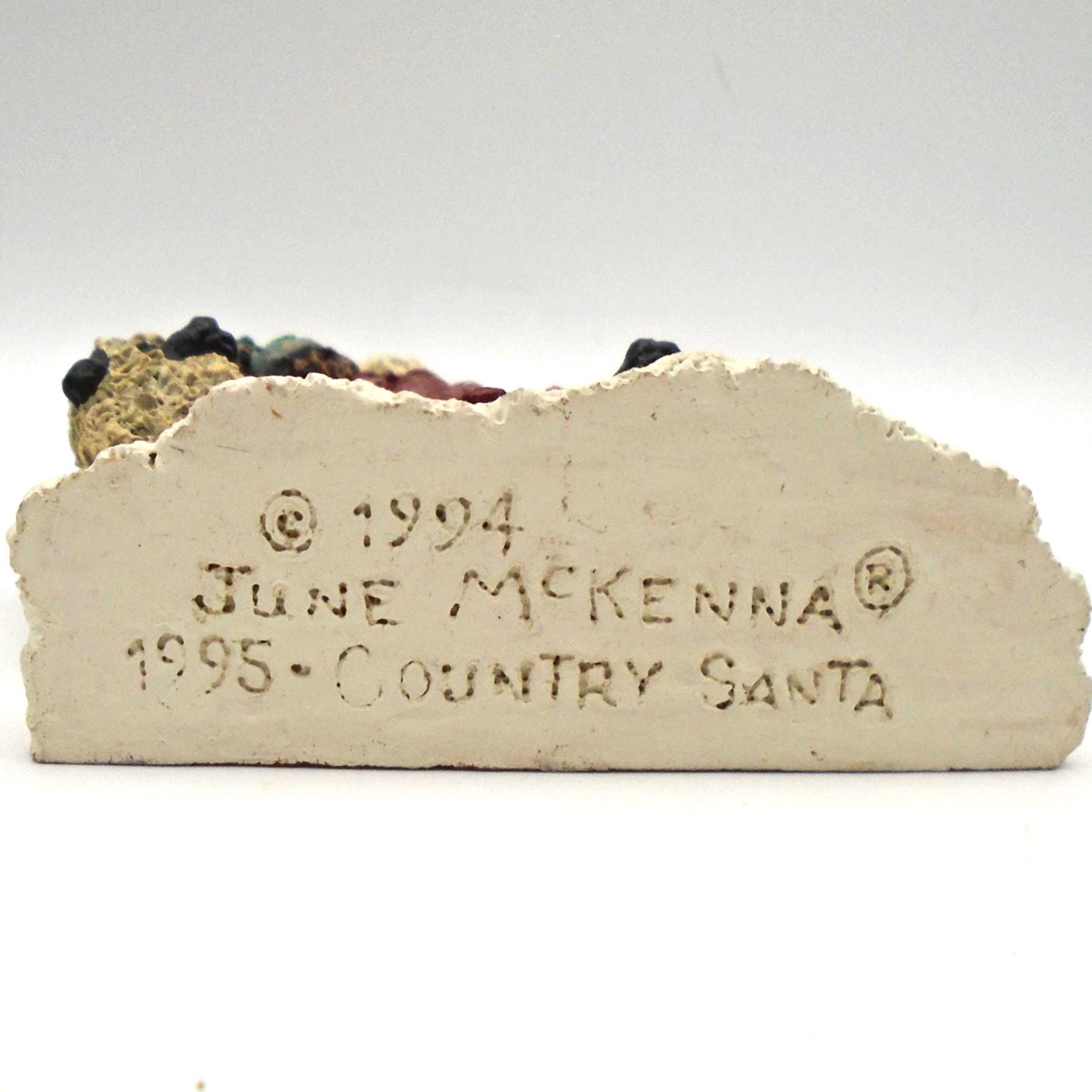 June McKenna Santa Christmas Folkart Collectible, "Country Santa",1995 signed on bottom. June McKenna is a well known sculptor who has work in museums and the Smithsonian. In the early 1980s she created a hand made line of folk art and Christmas collectibles. They were popular collectibles in the 1980's and 90's with their unique, old fashioned folk art charm.