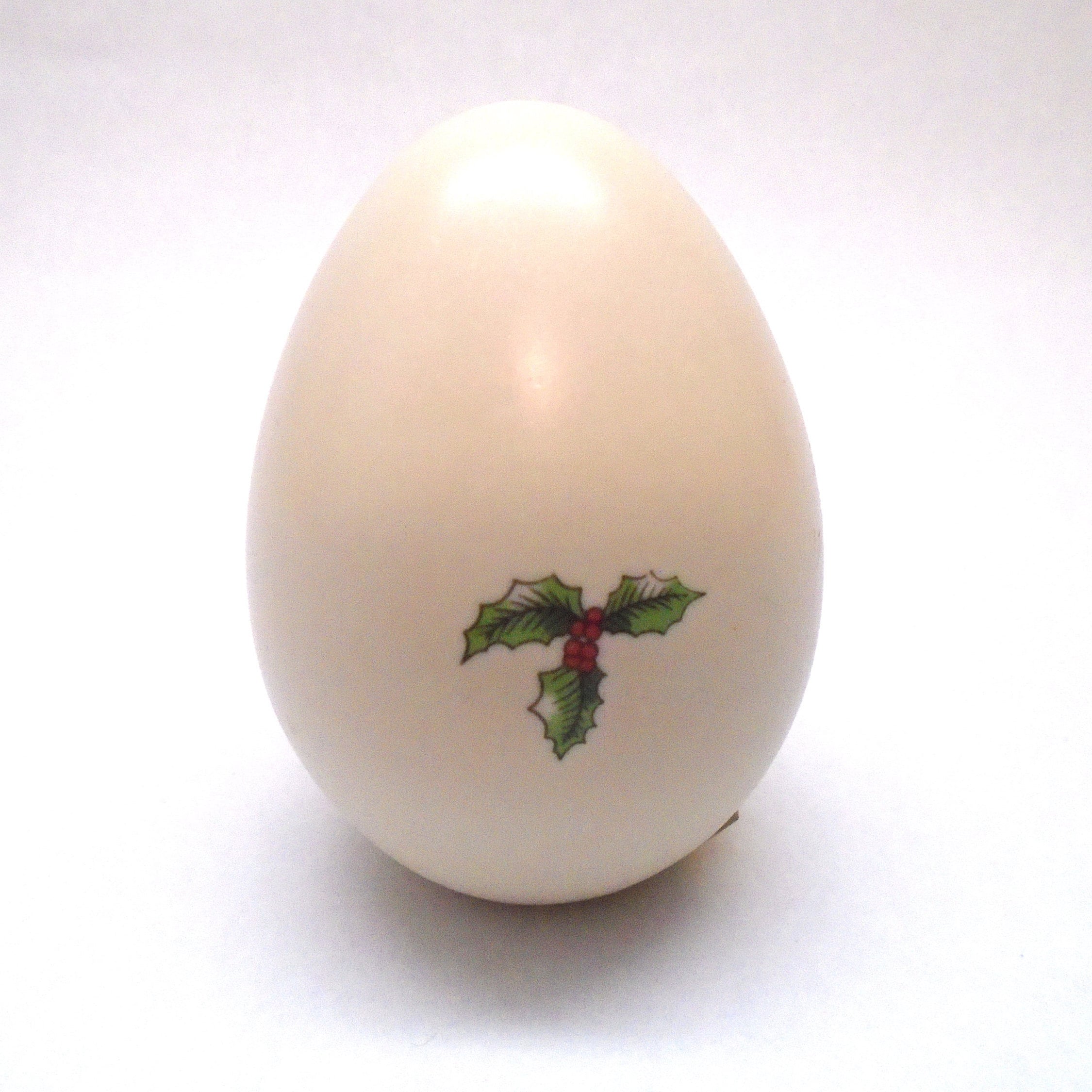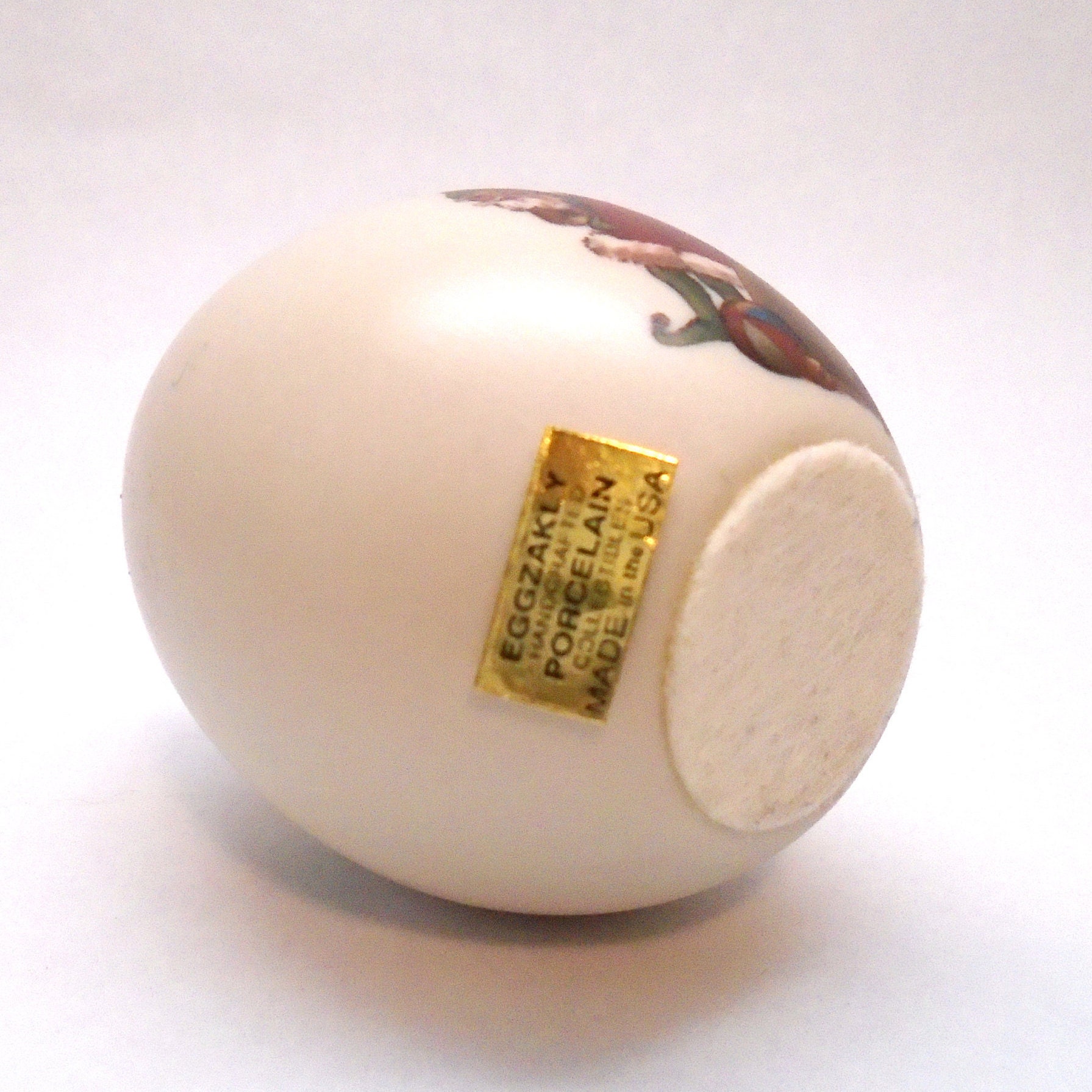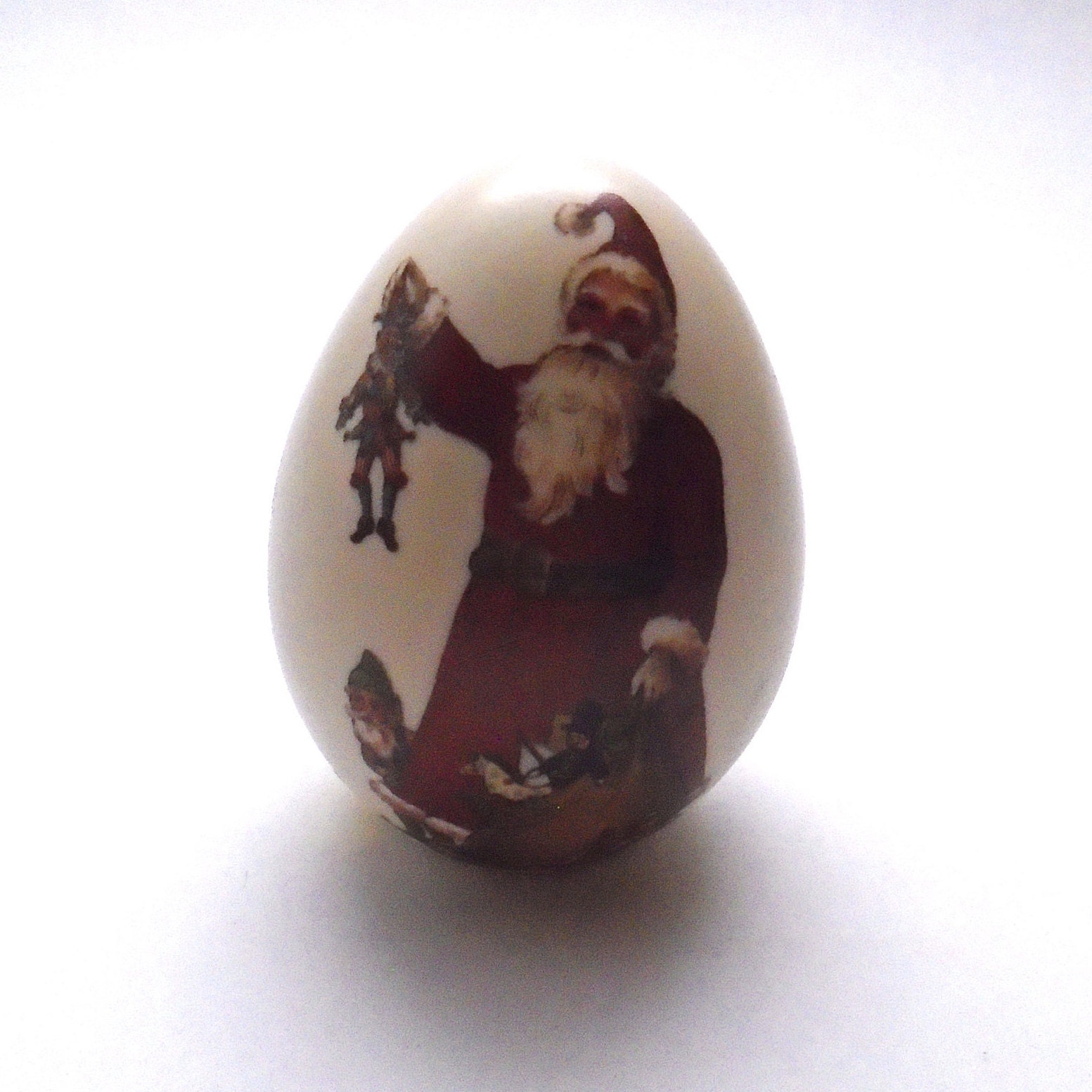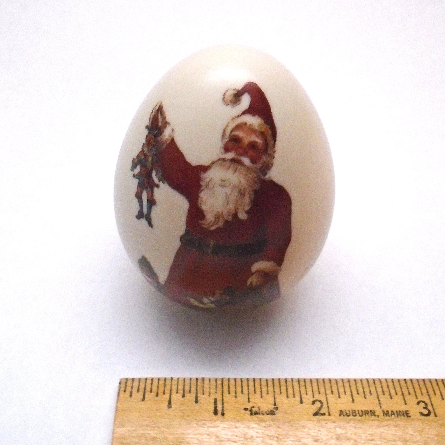 This Eggzakly Handcrafted Porcelain Egg is collectible and in excellent condition. It's from Egg Collectibles in Selah, WA and Made in the USA. This Christmas collection egg features Santa, with his open sack full of toys at his feet while he holds one of the toys up in the air. (if you look closely, you can see a little elf, peeking out from behind Santa's robe. On the back of the egg there's simply a Holly leaf. Nice Christmas collectible!